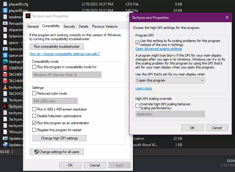 选择名称更改或兼容模式: 选项1 1. 前往游戏的安装文件夹。 2. 将“Tachyon.exe”重命名为“Tachyon.exe.old”。 3. 将“Space.exe”重命名为“Tachyon.exe”。 4. 从Steam启动《超光速:边缘》,创建角色后完成一个任务。 选项2(应可在Windows 11中运行) 5. 退出游戏。 6. 撤销步骤2和步骤3的操作。 7. 右键点击旧的Tachyon.exe文件,然后点击“属性”。勾选“以管理员身份运行此程序”旁边的方框,然后将兼容模式设置为“Windows 98/Windows ME”。点击“应用”,然后点击“确定”。