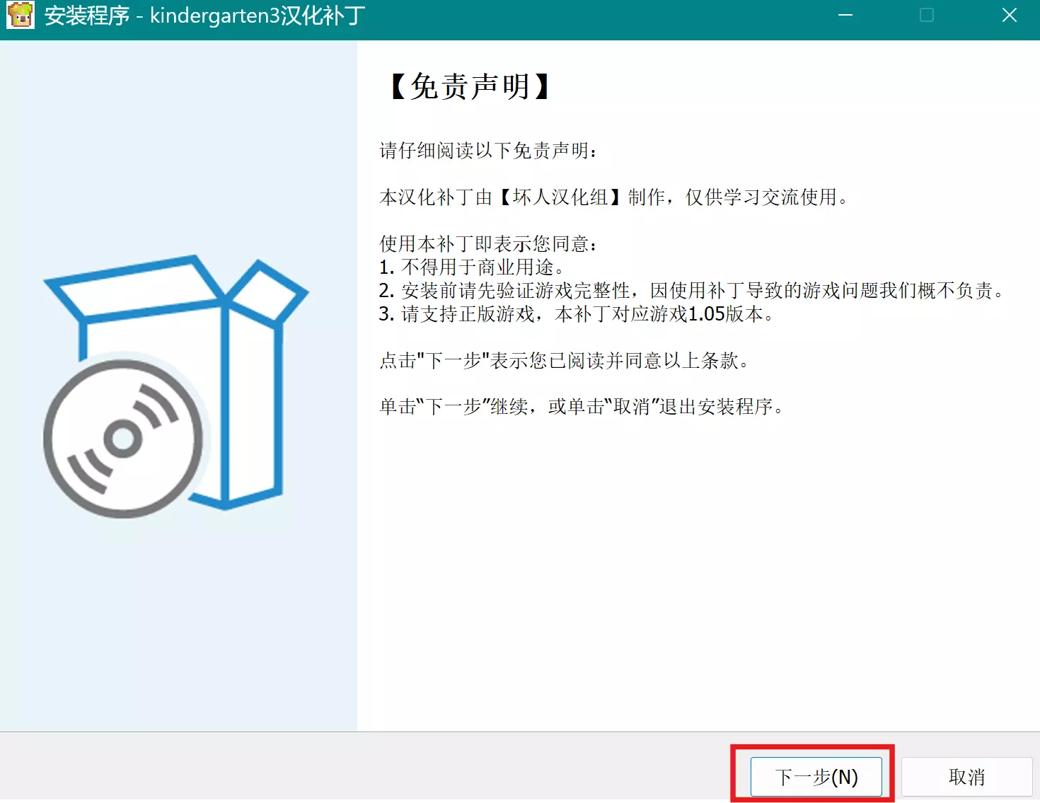 简中玩家看这里!坏人汉化组隆重推出《幼儿园3》汉化补丁!纯人工翻译,终于不用啃生肉或者蹩脚机翻了! 当前支持版本:v1.05 ⚠️1.06及以上版本游戏已内置本汉化,无需额外下载补丁⚠️ ⚠️1.06及以上版本游戏已内置本汉化,无需额外下载补丁⚠️ 坏人汉化组仍然在持续更新精进《幼儿园3》的翻译,汉化补丁随着游戏本体和译文的更新会不定时发布新版本,请选择最新版本补丁进行下载。在安装补丁前,请使用Steam安装《幼儿园3》最新版本,并确保游戏可以正常运行。 1. 下载并解压补丁安装文件。