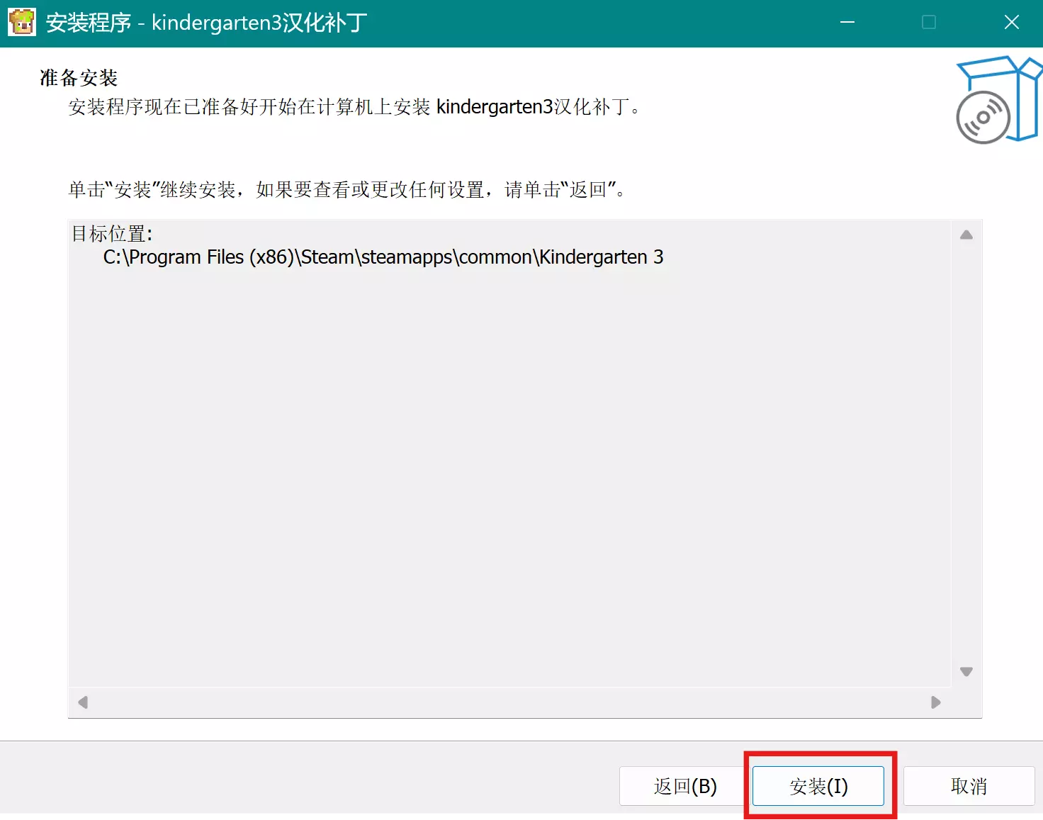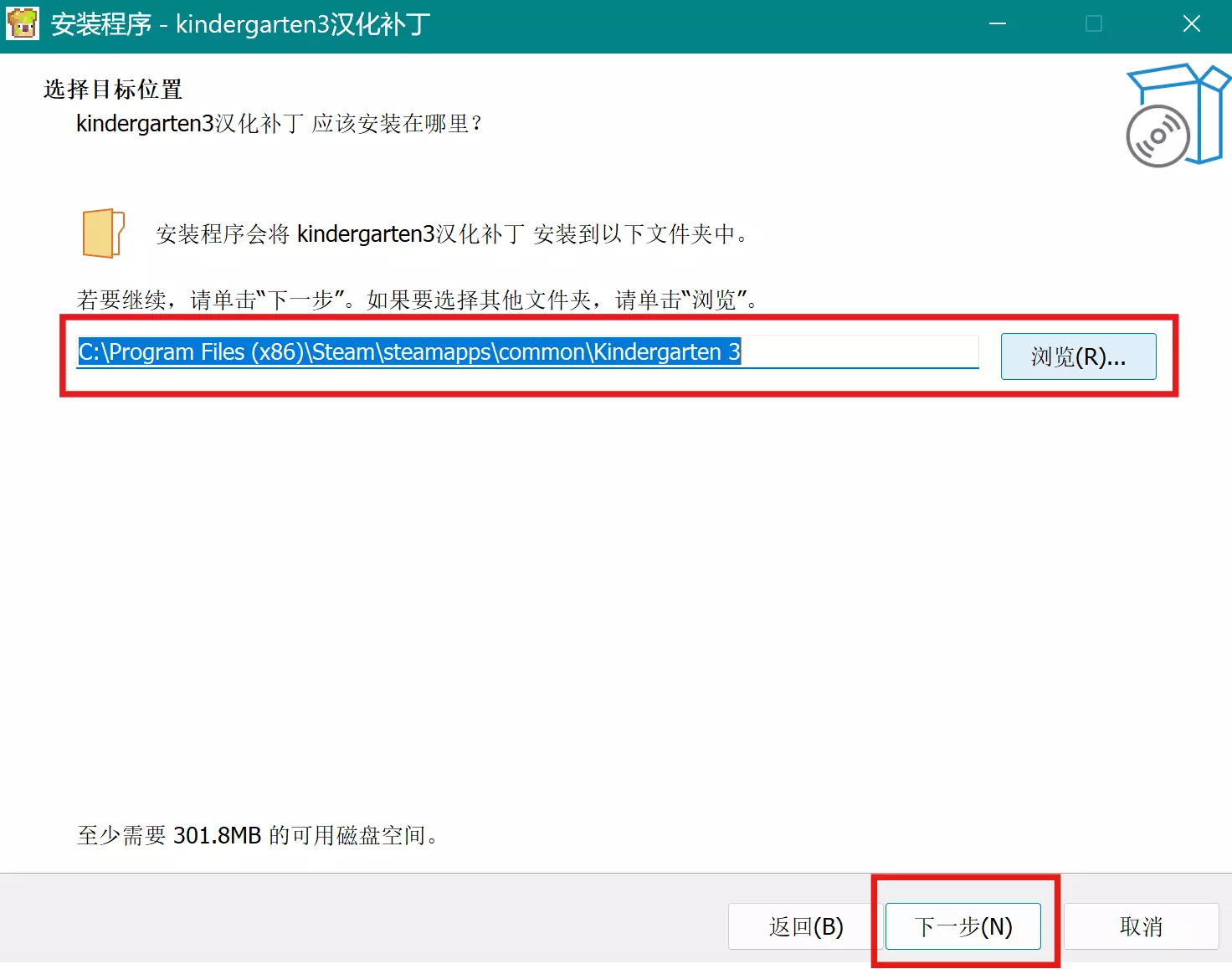 3. 选择【幼儿园3】游戏所在的路径。默认为Steam的默认安装地址,没有修改过的玩家不必更改此项。选择完成后再次单击“下一步”。