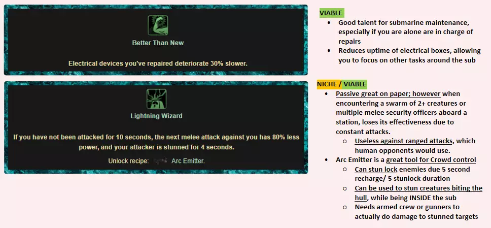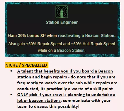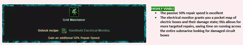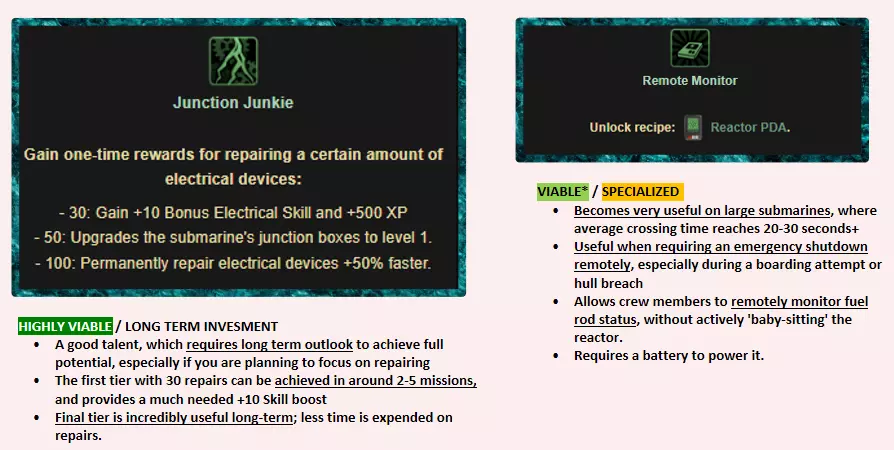 工程师应该做什么? 主要职责 修理电箱并确保潜艇电力系统的正常运行。 修理反应堆并管理燃料棒——更换空燃料棒,回收并进一步利用空燃料棒。 防止船员受到燃料棒和放射性矿石的辐射。 次要职责 按照船长的分配维护潜艇。 概述-一级被动天赋