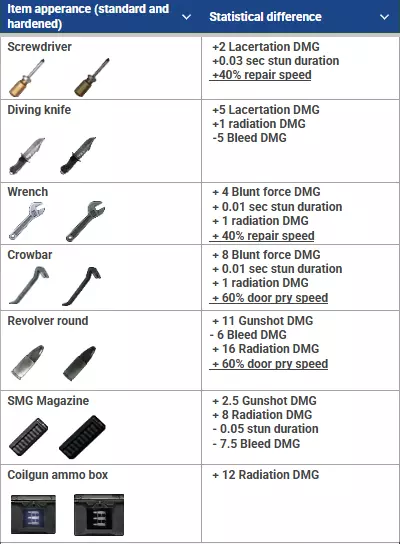 表3:硬化物品和耗尽物品与其标准物品的对比