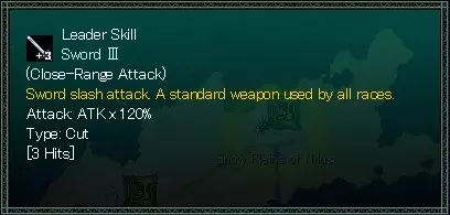 技能由多种元素构成。 主要元素包括: - 攻击力:技能的威力。部分技能基于魔法强度,其他则基于物理强度、命中率等。 - 射程:单位能够使用该技能的与敌人之间的距离。 - MP消耗:使用技能时消耗的MP量。仅魔法技能拥有此项。 - 属性:附加到技能上的属性伤害。 - 抵消属性:当技能相互碰撞时,若指定了抵消属性,你可以对该属性的技能进行反击[?] - 附加效果:技能命中时,会附加一种状态效果。*示例中未体现 - 特性:技能具有多种特点,例如“速度降低20%”。*下文将详细说明。 技能可大致分为六类。以下将通过示例系统地进行说明。 远程技能