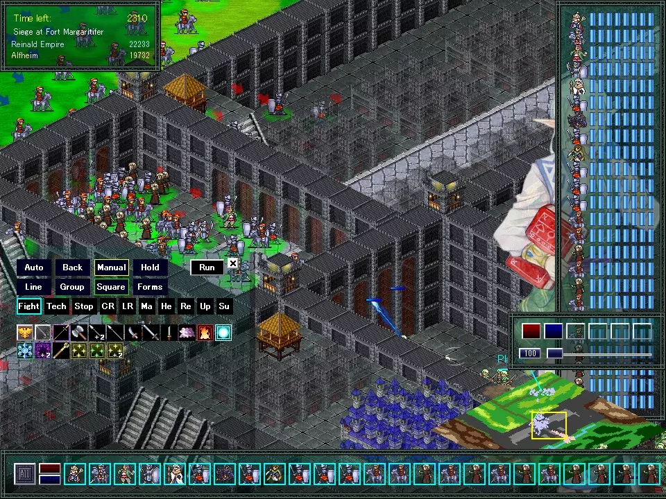 左键 - 将镜头移动到目标位置。 右键 - 将选中的单位移动到目标位置。 战斗阶段(基础操作) 无需记住上述所有控制方式。 这里先说明记住以下操作能实现的功能。 选择并移动部队 通过左键点击并拖动来选择单位→通过右键点击并拖动来指定位置和朝向。 用左键拖动框选单位。 将地图移动到敌军位置,然后用右键拖动指定位置和方向。 单位会开始向指示箭头处移动。若敌人进入攻击范围内,单位会自动战斗。 移动 首先,记住三种模式:【自动】、【手动】和【撤退】。使用【手动】将单位放置在特定位置,使用【自动】可加快游戏速度。 若战斗处于劣势,点击【撤退】可减少损失。 但在【月神】难度下,上述选择仅能对己方部队生效,因此还需记住【后退】和【坚守】指令。 阵型 主要需牢记【横队】、【密集阵】和【方阵】。 【阵型】系统较为复杂,且实用机会较少。 行为 【战斗】指令允许单位使用标准技能。这不包括【科技】和【召唤】所涵盖的技能,这些技能必须手动激活。* 另一部分将详细说明。个人技能指定 * 蓝色边框的技能为指定使用技能,X表示该技能被禁用。 左键点击——仅使用该技能【蓝色边框】 右键点击——禁用目标技能【粉色/】 熟悉操作后,你就会知道哪些技能想用,哪些技能不想用。 最好禁用不想要的技能,并指定想要使用的技能。 召唤 战斗开始时,基本使用召唤魔法。 选择拥有召唤技能的单位【通常是法师型单位】。点击【Su】 新单位将被召唤,例如火球。 特殊技 根据类型不同,有些技能可以消灭杂兵,也有多种技能可在与敌人接触时使用。 选择拥有特殊技的单位,点击【Tech】。单位在与敌人接触时会使用其特殊技能。 指定/取消攻击焦点 左键点击地面可将攻击集中到该位置。 这对于快速摧毁城堡大门和击溃敌方精锐单位非常有用。 双击左键可取消焦点。这很实用,因为容易误操作设置目标。 事件界面 游戏过程中,当满足特定条件时,会触发事件并推进剧情。 你可以选择不查看事件,但无论如何事件结果都会生效,因此至少首次应观看。 即使单位处于游荡状态或已消失,仍会在事件中出现。*部分情况除外。 通过事件招募或解雇的单位,游戏会相应处理。