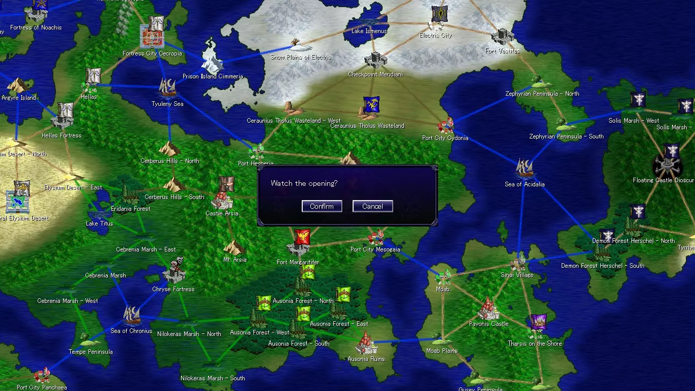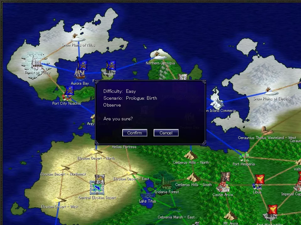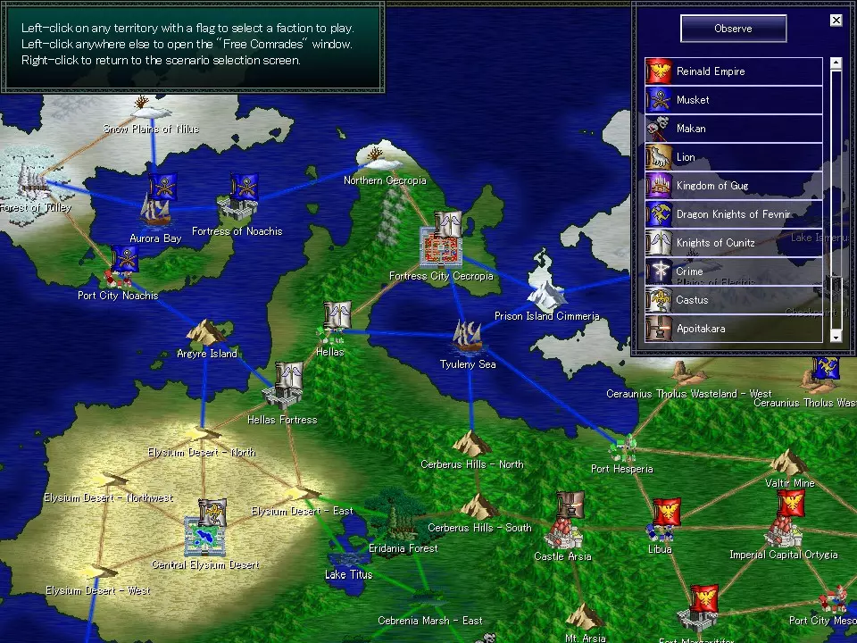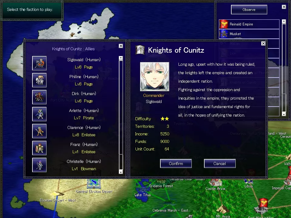 “序章:诞生”——包含故事的场景。 “后续章节”——目前未知。 “自由模式”——移除故事事件的模式。 “右键点击”——返回标题界面。 选择阵营