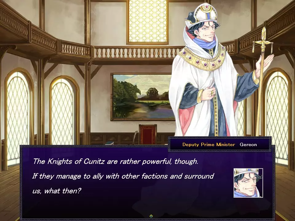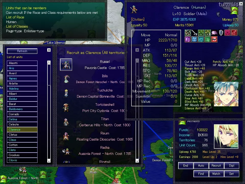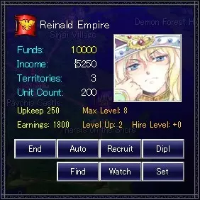维护费用 - 人力资源单位的总成本。 财务价值 - 人力资源单位提供的收入总和。 训练上限 - 不行动的普通单位将接受训练,并在回合结束时提升等级。此数值为上限。 基础提升 - 每次训练提升的等级数量。 平均等级 - 该场景普通单位的等级修正值。 结束回合 - 结束玩家回合。 委任回合 - 让电脑玩家控制一回合。 人力资源雇佣【招募】 - 打开雇佣窗口,招募领地内的流浪人才。记得每回合都查看! 外交 - 打开外交窗口。 搜索 - 探索是否存在地下城。搜索阶段仅通过事件出现。内务 - 打开内务窗口 * 当前状态未设置。 监督[观察] - 进入演示模式,观看至战争结束。 功能[设置] - 打开功能窗口。 领土窗口