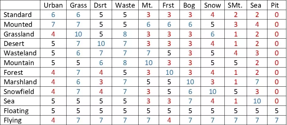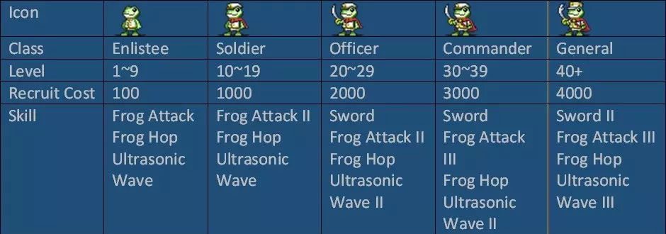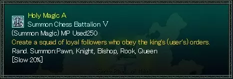 数值越高,单位越容易移动。 0时无法移动。 技能 单位在战场上执行的行动。 技能种类繁多,分为近战攻击、远程攻击、治疗、召唤、突击【charge】、强化等。 魔法技能会消耗MP。 单位(抗性等) 抗性 抗性分为两种:伤害抗性和异常状态抗性。 抗性有11个等级,说明如下: 0=即死;1=极易受影响;2-3=易受影响;4=轻微弱点;5=普通;6=轻微抗性;7-8=较强抗性;9=极强抗性;10=完全免疫。 伤害属性 斩击——剑等武器的物理属性。突击【冲锋】——穿刺类武器的物理属性,例如长矛。 打击——钝器类武器的物理属性,例如锤子。对坚硬敌人效果显著。 射击——远程武器的物理属性,包括子弹和箭矢。 火焰——火焰与热量的属性。 寒冷——冰与寒冷的属性。 电击——电的属性,包括闪电。 毒素——有害物质的属性,包括药物和毒素。 压力——压力的属性,包括水压、气压、风压和重力。 音波——声音的属性,包括超声波和歌声。 光明——生命、活力等力量的属性。 黑暗——灵魂的属性。 神圣——神圣属性。灵体【死亡】——非此世存在的属性。 状态异常 中毒——HP定期减少(最大HP的10%)。 麻痹——无法移动,也不能进行近战或远程攻击。仍可使用魔法。 黑暗【失明】——魔法和远程攻击会随机方向发射。近战攻击和恢复魔法有50%的概率失败。 混乱——会攻击盟友。 沉默——无法使用魔法。 石化——无法执行任何动作。 恐慌——逃离敌人。不会逃离战场。 汲取——吸收目标的HP。 恶魔汲取——吸收目标的MP。 诅咒——根据造成的伤害量成比例吸收目标的经验值。 即死——目标被立即杀死。 招募窗口——方框内的单位可以被雇佣。职业名称下方的数字为雇佣费用。 红色文本=无法招募该单位 绿色文本=因距离过远无法雇佣 蓝色文本=资金不足 新雇佣单位的分配顺序如下: 1.与雇主相同职业的单位 2.能够雇佣新单位的单位 3.能够成为小队队长的单位 招募普通单位时: 左键点击-招募1个单位 右键点击-填满一个小队 技能 在本游戏中,单位在战场上执行的行动被称为【技能】。将光标移至单位窗口中的技能图标上可显示详情。
