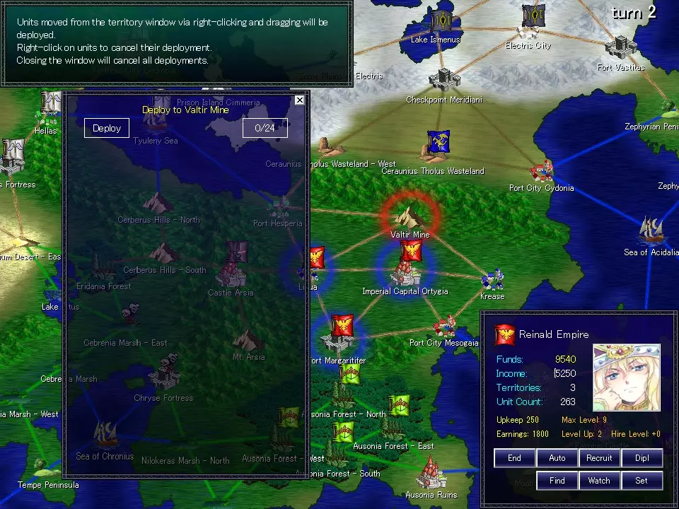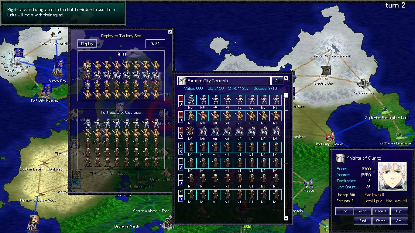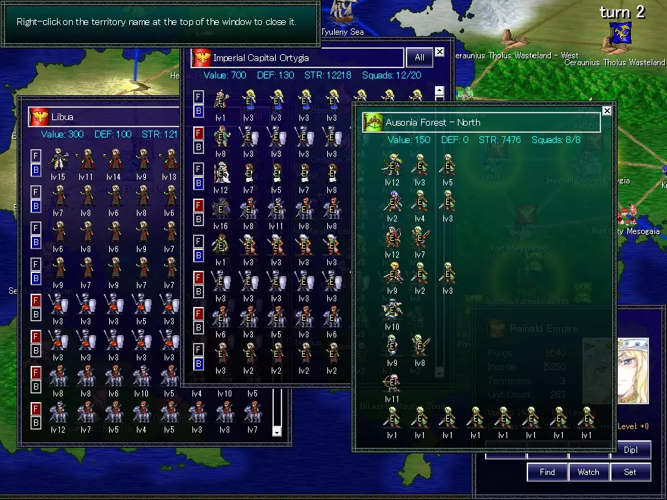 左键点击领地可显示领地窗口。你的军队显示为蓝色,其他势力显示为绿色。可通过拖动显示的图标来移动部队。最左侧的单位图标是领袖。左键点击单位时,会显示该单位的信息。按住右键拖动单位图标可更改单位位置。右键拖动时,单位可移动到其他窗口,也可直接放置到世界地图的领地上。按F键将单位置于先锋位置,按B键将单位置于后卫位置。右键点击带有领地名称的顶部栏可关闭窗口。拖动领袖时也会选中其下属【小队】。右上角的【全部】按钮可让你一次性拖动一个基地的所有部队。 标记有【E】的单位已行动,其移动范围限制在己方领地内。 回合结束时无法训练部队 无法出击 领地内移动