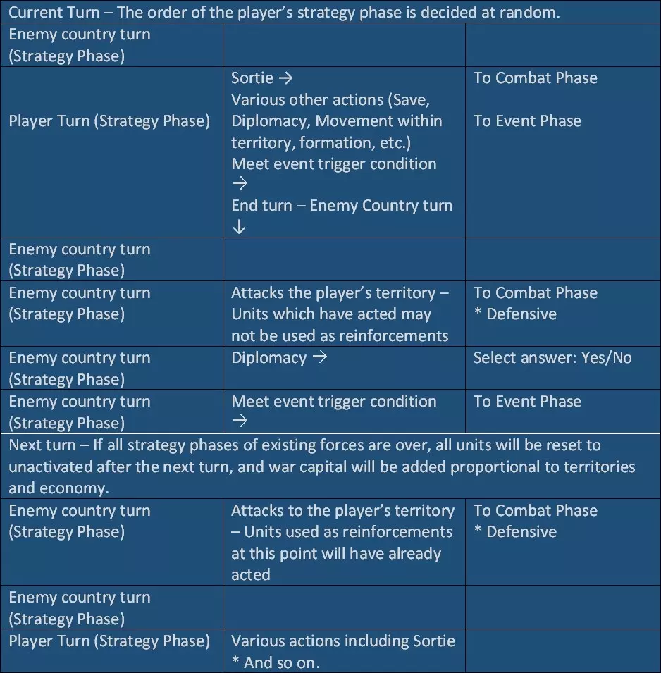 扩张领土。 招募特定人才。 领土与其他国家接壤。 摧毁其他国家。 在战场上遇到特定人物。选择机会很少,通常只需阅读。 每回合的策略阶段,你必须做出决策。 攻击敌方领土或防御己方领土时,将进入【实时】战斗阶段。 若满足扩张领土、特定团体加入或领土与敌方领土接壤等条件,将进入事件阶段,故事继续。 流程图