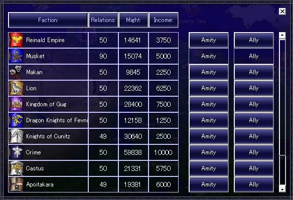 派系名称:左键点击按降序排序;右键点击按升序排序 友好度【关系】:左键点击按降序排序;右键点击按升序排序 总实力【势力值】:左键点击按降序排序;右键点击按升序排序 总收入:左键点击按降序排序;右键点击按升序排序 友好度【和睦度】 贡献目标派系十分之一的收入可提升关系等级。 若被拒绝,关系等级将会下降。 结盟 贡献目标派系十分之一的收入可提升关系等级。 与目标派系结盟。结盟后无法入侵其领地,对方也无法入侵你的领地。这也可以拒绝,但不会导致关系等级下降。 【盟友在防御时可以互相请求增援,前提是双方在防御领土的两个领土范围内有活跃单位】战斗【联合战斗】 贡献目标势力十分之一的收入以提升关系等级。 这指定了联盟双方可以攻击的势力,允许你在一定程度上协调攻击。 但是,如果你以这种方式攻击友好势力,你的宗主的信任等级将会下降。 【换句话说,设立联合战斗后,任何一方盟友都可以请求另一方加入对预先约定敌人的攻击。被请求的盟友必须在目标领土的两个领土范围内至少有一个活跃小队,并且可以拒绝。同意后,发送少于可用单位总数的任何数量将导致信任/关系惩罚。只有控制某一派系的首领时,你才能使用【外交】功能。攻击友好度较高的部队时,除队长外的特殊单位会降低忠诚度。无限期同盟的部队共享胜利条件。即使不解散同盟,游戏也可通关。无限期同盟只能通过事件缔结。设置