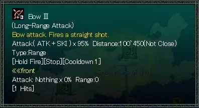 当敌人进入射击距离时激活的技能。部分技能在敌人过近时无法使用。例如,弓箭技能会在敌人进入使用者350单位范围内时发动,且当敌人处于100单位范围内时无法使用。近战技能