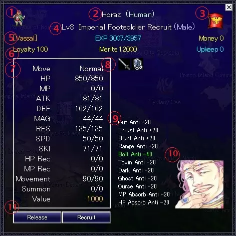 左键点击领地窗口中的单位图标可显示详情,详情将在左侧展示。 1.单位图标:人员单位拥有独特图标。 2.单位名称(人员单位的名字)/种族 3.所属旗帜 4.等级/职业/性别 5.身份/经验值/资金 6.忠诚度或信任度/战术值【声望】/收入或维护费用 7.属性 8.技能 9.元素抗性 10.独特人员肖像:普通单位无肖像 11.指挥详情:见下文。 人员单位与普通单位 单位可分为普通单位和人才单位。 普通单位没有名字,实际上是消耗品。同等级同职业的所有普通单位属性基本相同。 而人员单位拥有名字、肖像、专属技能等。即使与同职业的其他单位处于相同等级,他们也会拥有不同的属性,且通常比普通单位更强。 由于人员有限,成功策略的关键在于在领地内有效安置有才能的人。 种族 在本游戏中,通常只能招募同职业同种族的人才。*存在部分例外情况。 此外,使用有才能的人员时,可以招募同种族的单位。 种族之间设有相性设定。在相性最差的情况下,即使满足雇佣条件也可能无法招募该单位。 *游戏中相性最差的组合为人类-蜥蜴人、妖精-青蛙以及矮人-精灵。 等级 代表单位的强度。等级越高,单位就越强。通过积累经验值并让普通单位在回合结束时处于非活跃状态进行训练,即可提升等级。 职业:单位的职业。在特定等级时,单位将升级为更高级的职业。升级为更高级职业后,单位将学习新技能,且雇佣成本会更高。