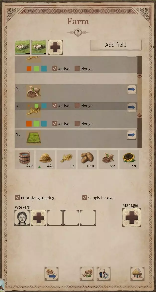 农场建筑面板允许你设置田地的耕作、播种和收获的优先顺序——只需点击田地并将其上下拖动即可。 游戏会严格按顺序处理每块田地,村民只有在前一块田地没有剩余工作时才会移至下一块田地(尽管其他村民可能仍在完成前一块田地的工作)。 如果你有足够的犁和工人,耕作会在三月初立即开始;但如果需要耕作的田地数量多于犁(或驾驶犁的工人)的数量,田地将按照你设置的顺序进行耕作。同时,其他村民会按顺序播种不需要犁地的田地。一旦某块田地完成犁地,若其优先级高于村民当前正在劳作的田地,就会成为村民的下一个优先任务(但每个村民会先完成当前任务)。 由此可见,你播种的优先级应设定为那些你最需要的作物,因为这些作物的生长季节最长。 至于收获,如果你特别急需某种作物,可以按特定顺序设定田地的收获优先级,以确保该作物优先被收获。除此之外,设定优先级是个好主意,这样土豆田和大麻田就能种在需要脱粒的作物之间,这能让农场工人有更多时间进行脱粒,同时避免农场空间被占满。例如,如果前四块田地都需要脱粒,农场工人可能会不堪重负,而且农场也会没有空间存放剩余田地的收成。 优先收集 这是农场建筑面板中的一个复选框。它的作用是改变收获期间的工作顺序。若不勾选此选项,工人将依次收割每块田地,之后再依次收集每块田地的作物(收割过程中会进行少量收集——如果工人恰好从田地返回农场,他们会携带一捆作物,但不会专门进入田地捡拾作物)。勾选此选项后,工人会在作物收割后立即进行收集。勾选此选项会使农场更快堆满已收割的作物,从而可能达到存储上限。除非你有特别的理由优先考虑采集,否则最好不要勾选此框,这样可以让农场工人有更多机会脱粒作物,仓库和谷仓工人也有更多机会从农场运走作物,从而收获更多作物。 牲畜放牧