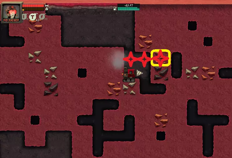 Boss战(含剧透) Boss战提示与技巧 先在标准游戏模式下尝试Boss战。 Boss战期间传送器禁用! 要轻松获胜,确保船体强度已满(以承受伤害,懂的都懂!)), 最大旋翼速度(用于躲避岩浆,甚至在冲向地面基地时超越 boss)和最大履带速度(这对游戏玩法来说相对无用,但在 boss 战中,当你试图逃离 boss 以避免被击中时非常有用) 如果你将船体强度升到最高,你的 inventory 中只需要两样东西: 60-70 个 C4 炸弹(我通常携带 99 个以确保安全) 修理包(到目前为止,我在整个战斗中最多使用过 3 个,我携带 10 个以确保安全) 完成所有收集任务(2 个信标、3 把锤子 + 2 把镰刀、6 个未知元素)后,你将被允许向下挖掘并寻找“boss”。 在 12,000 英尺后,你的深度计数器将停止工作,但仍有很长的路要向下走。除非你拥有金属钻头,否则浪费金钱和电子元素去获取电子炸弹并开凿一条直通“ boss 房间”的垂直通道并没有太大意义。只需确保你的旋翼速度已升至最高,以便更顺畅地飞行。 在 boss 房间前有一片巨大的岩浆区域。注意不要通过在地图最右侧/最左侧开凿通道进入 boss 房间。使用一些炸弹炸开岩浆——岩浆下方有大量的【Unobtainium】,如果你直接开凿通往 boss 房间的通道,将无法再收集到这些资源。 Boss 战斗阶段及提示: 进入 boss 房间后,中间会有一台巨大的挖掘机器。此时无需采取任何行动。只要别触碰那台机器——它会造成伤害。只需确保你站在 boss 旁边即可。一旦机器启动,它会开始向上钻探并左右移动。你需要记住以下几点:接触机器会受到伤害,接触机器喷出的火焰会受到伤害,飞行速度不够快而被下方的熔岩追上也会受到伤害。你的目标是跟随(或超越)机器,并在下一个基地等待它。对我来说最有效的方法是,要么沿着机器挖掘的通道跟随它(你需要保持足够近的距离以应对方向变化),要么如果可能的话,直接回到你自己挖掘的垂直通道向上飞行。在旋翼速度达到最大的情况下,你比 boss 机器更快,这样你就能在下一个基地等着它了。请注意,在阿尔法基地和地面层之间的区域, Boss 机器的转向比以前更加急促,要跟在它后面相当困难。我强烈建议你在左右两侧都准备好直井,以便能更轻松地返回顶层。 你将在德尔塔、贝塔和阿尔法基地与 Boss 战斗,而非地面基地。 如果你的船体已升至满级,那么在基地战斗期间无需担心所受伤害。你可以使用修理包进行修复,或者直接利用基地的修理建筑。 对我来说,最简便的造成伤害的方法是绕着基地跑,并在 Boss 附近引爆 C4 炸弹。Boss也会移动,所以如果Boss从左向右移动,你需要做同样的事情,保持近距离接触。让Boss撞上爆炸就能轻松造成伤害。我通常会直接与Boss正面交锋,忽略所受伤害,之后可以用修理包或基地的修理站轻松修复。 漏洞 到目前为止,我发现的漏洞如下: 侧跳引爆:我在履带速度升级到最高时能够复制这个漏洞。这主要是通过欺骗游戏,让它认为你的挖掘器处于不同的位置。否则,你需要能让炸弹在空中引爆的特殊升级。可以看一下提供的图片。目标方块为黄色,你可以通过快速向右移动并在即将下落时引爆T型炸弹来轻松引爆它。这需要一些练习,但在解决某些谜题时,或者当你不小心挖错路径导致无法拿到物品时,会非常有帮助。