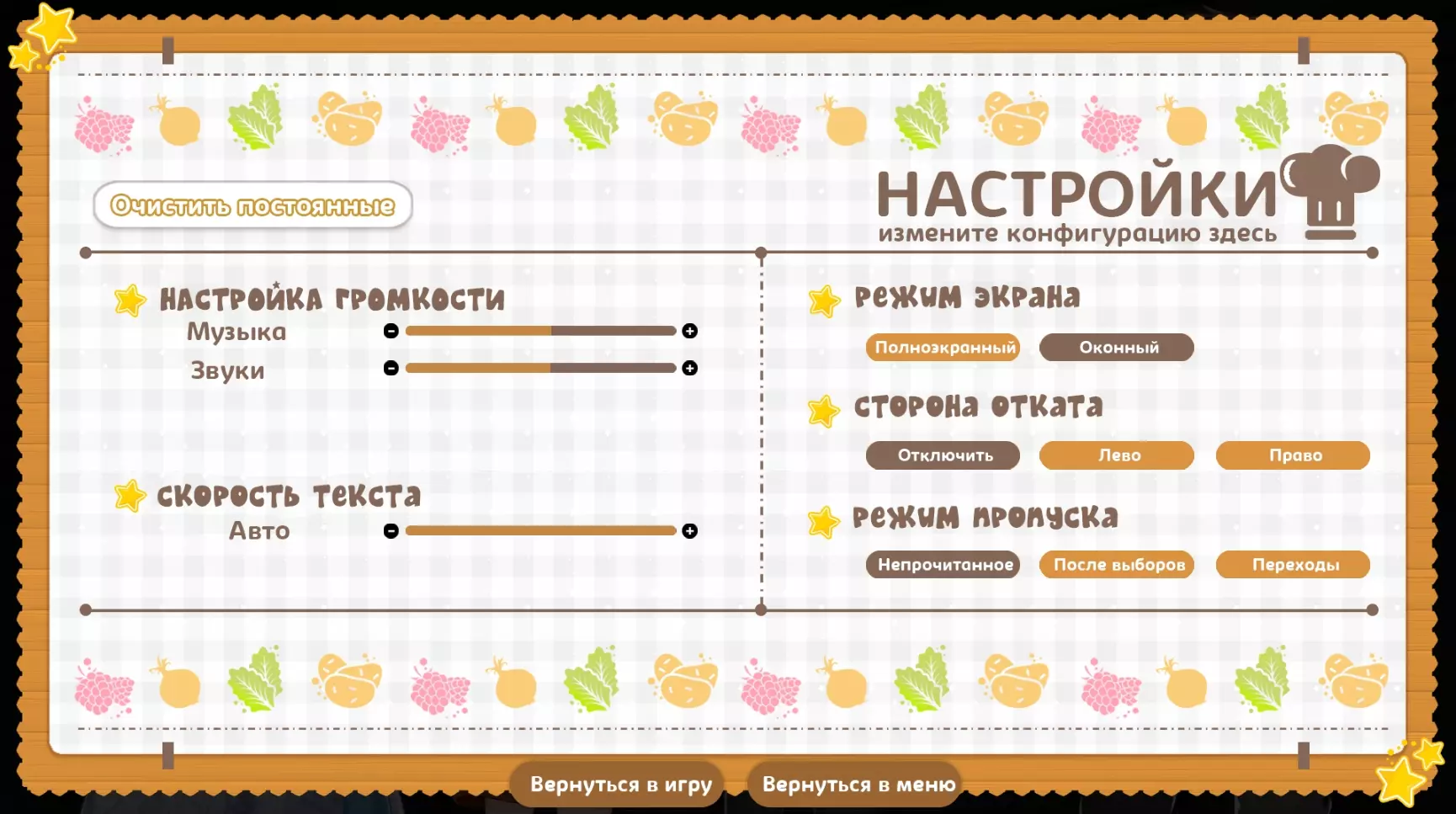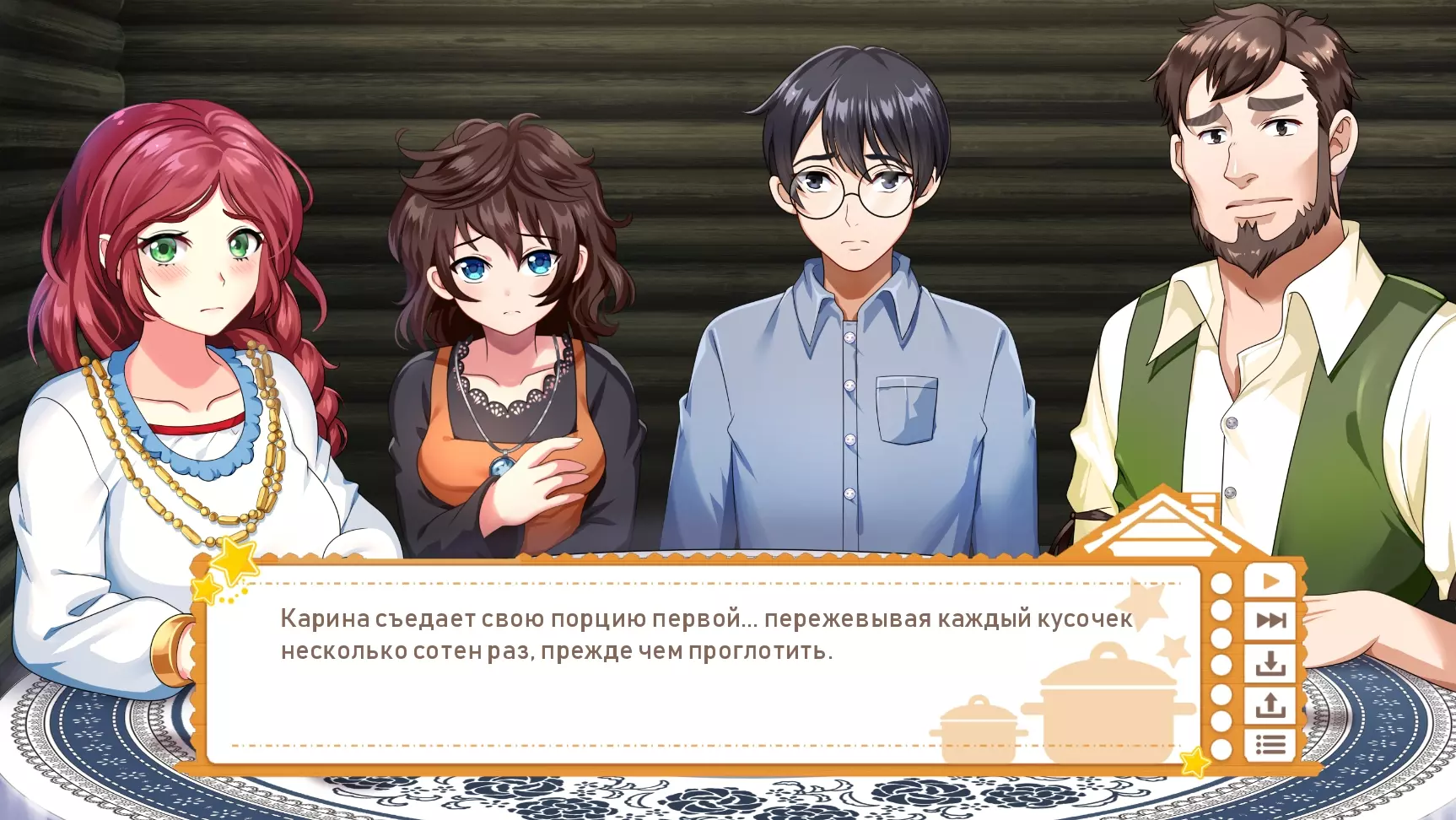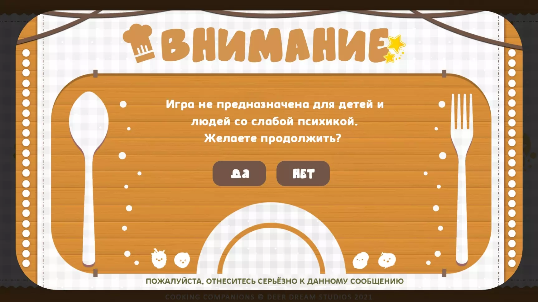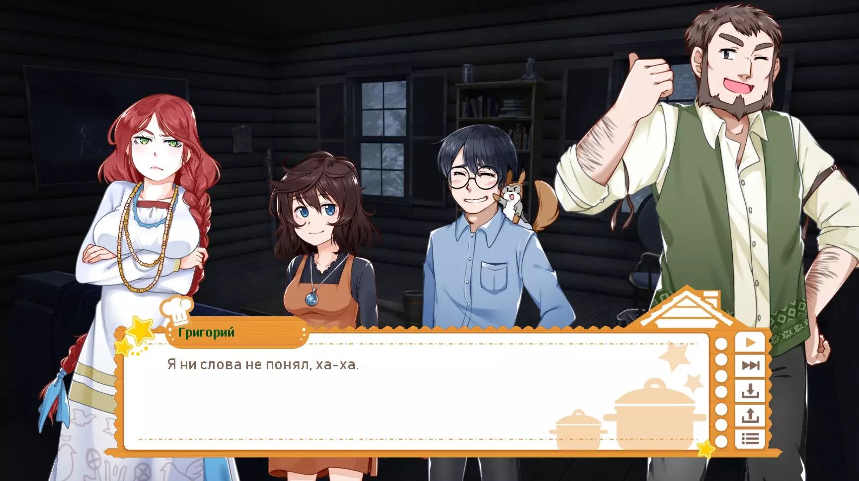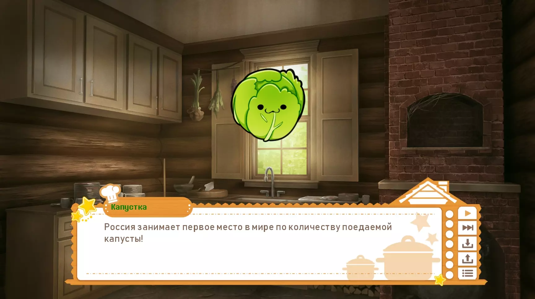 我与LazyBone团队没有任何关系,起初翻译是为了自己和身边的朋友,最终决定公开分享。 前言 重要提示:我注意到游戏进行了新一轮更新,因此决定着手更新翻译。五月底前,翻译版本将根据游戏的最新版本完成更新。 祝大家一切顺利!其实,我本来没打算翻译这部视觉小说,更没想过把汉化补丁发布到任何地方。我是八月底买的游戏,花了几个晚上就通关了,仅此而已。不过后来我想和朋友们分享它,但又不想让很多人读那些满是“呃呃呃”和“那个那个”的文本,于是就想起了以前的爱好,自从动画视觉关闭后这个爱好就搁置了。翻译这部视觉小说让我感觉非常棒,希望你们也会喜欢!如果你们发现了错别字、未翻译的文本片段或其他任何问题,请发邮件联系。俄语), 对文本进行了一些编辑,但由于我是下班后的晚上进行翻译的,还是可能漏掉了一些内容,而且眼睛也已经看花了 :) 翻译特点 现在来谈谈翻译的特点: 1. 角色们用女性称谓称呼主角,原因很明显。如果您还是不明白,会在第二部分揭晓 :) 2.我斗胆不只是翻译游戏,而是对其进行本土化适配以面向俄罗斯玩家。正因为如此,格雷戈尔变成了格里戈里,卡琳(马特帕特总是把她叫成卡伦,哈哈)变成了卡丽娜,玛丽亚变成了玛莎,至于托利亚,就还是原来的托利亚。而且这真的很奇怪,游戏明明是斯拉夫背景,讲述的也是斯拉夫民俗,可角色们却用一些完全或不太像斯拉夫的名字互相称呼,我们这儿根本不这么叫。我没能很好地处理“Chompettes”这个词,最终采用了LazyBone的“Хрумки”(暂译:咕噜伙伴)这个版本,我承认这一点。不过我挺喜欢这个译法的!但同样,由于游戏风格类似可爱的儿童童话,咕噜伙伴们之间的称呼并非简单的“白菜、土豆、洋葱”等,而是“小白菜、小土豆、小洋葱”,我认为这很好地体现了咕噜伙伴们的童真。 大概就是这些了。 如何安装 1. 下载汉化补丁你下载的是俄语本地化补丁,而非完整游戏!该补丁在Steam版本上运行良好,所有成就均可正常解锁。 2. 你会下载到一个名为“game”的文件夹,可先将其复制到桌面。 3. 通过路径Steam库/steamapps/common/烹饪伙伴打开原始游戏文件夹。在打开的《烹饪伙伴》文件夹中,你还会看到一个名为“game”的文件夹,我们需要替换的就是它。 4. 将桌面上下载好的“game”文件夹拖到游戏文件夹中,电脑会询问是否替换所有文件,点击“是”并等待替换完成。 重要!如果你之后打算卸载汉化补丁,请保存好原始的“game”文件夹,之后同样进行替换即可,或者直接重新安装游戏,默认语言就会恢复为英语。 截图