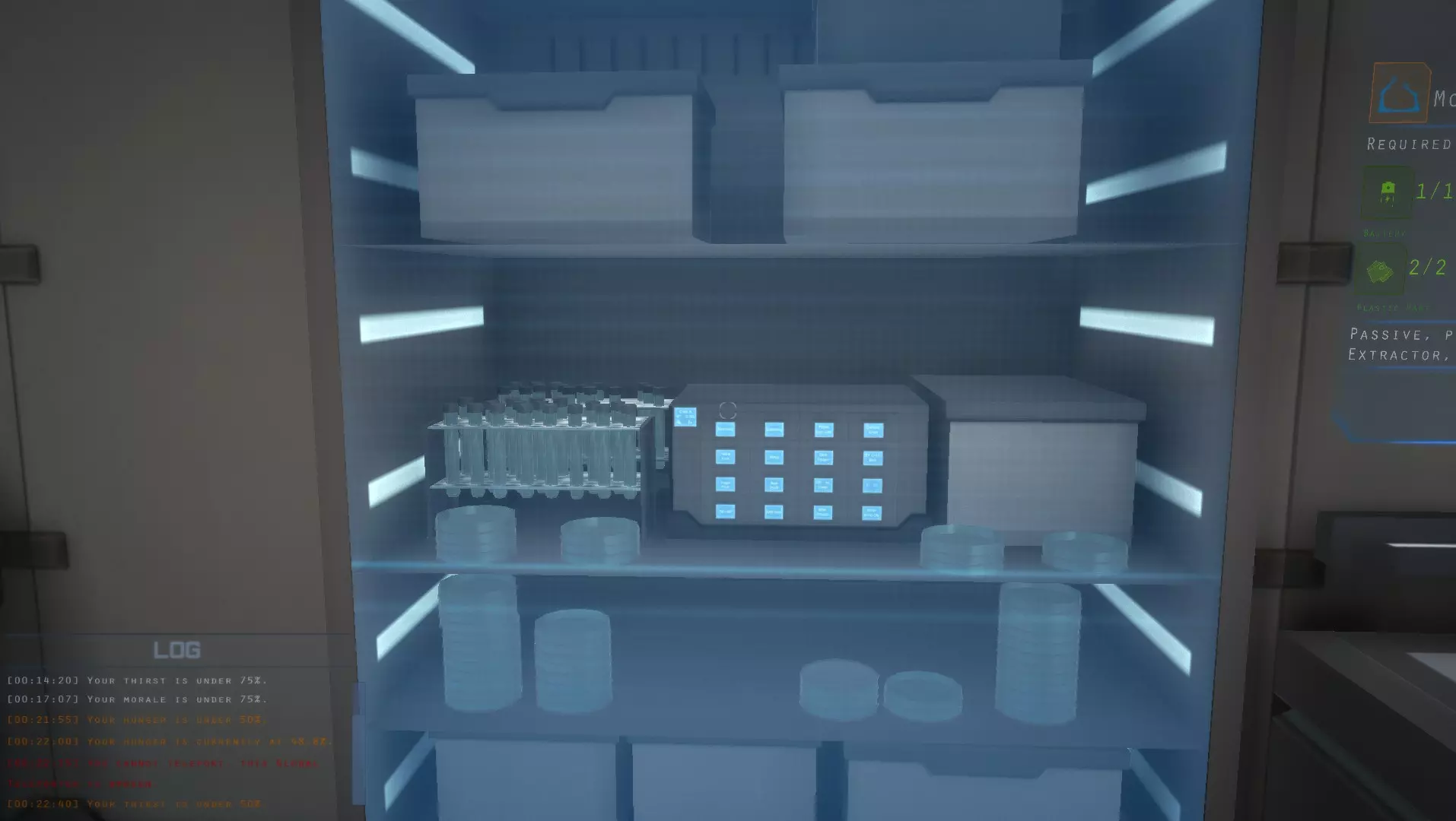 第二步 寻找物资 完成第一步后,你就可以去寻找一些物资了。你需要找到的房间叫做【储藏室】。它们通常位于楼层的边缘。找到储藏室后,收集10份生物树脂、6份塑料、3卷胶带、6节电池、12个微芯片、7根电源线、4个电子元件和3个金属零件。你会需要更多这类物品,所以如果能携带的话,多拿一些备用。如果你的 inventory 超重,就先放下一些东西,直到不再超重为止。你可以回来取留下的任何物品,只要记住它们在哪个房间就行。