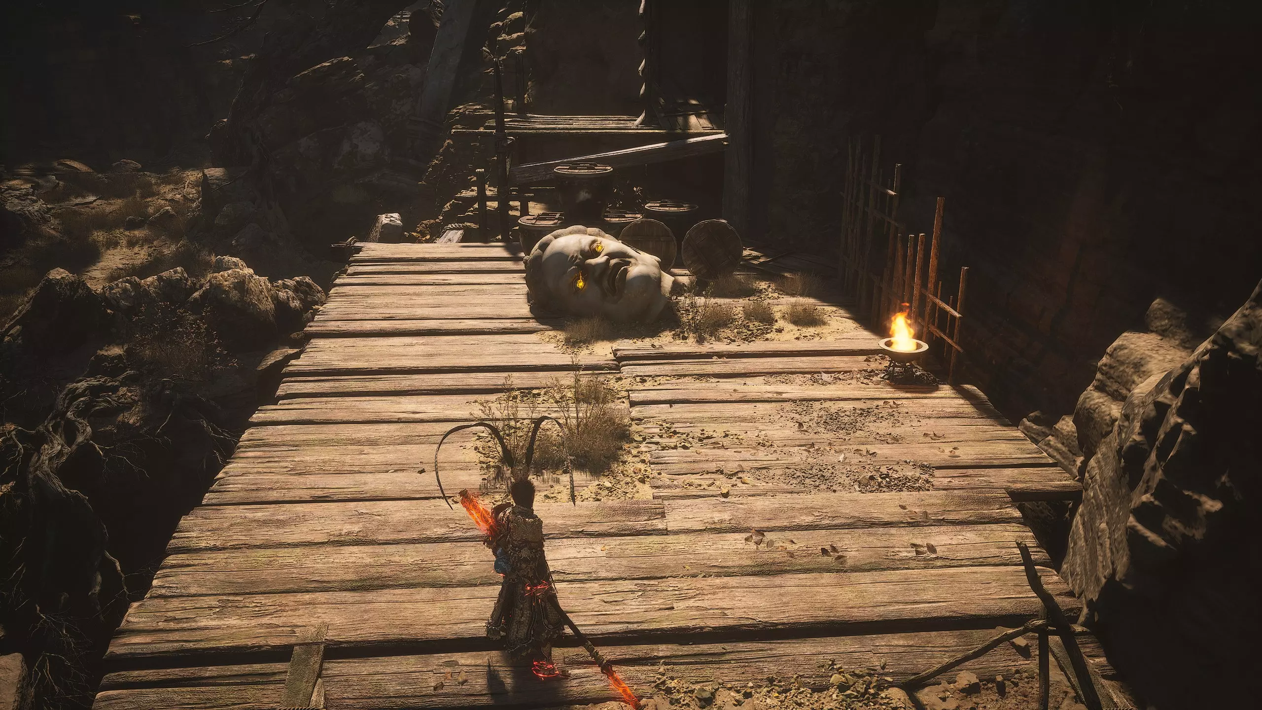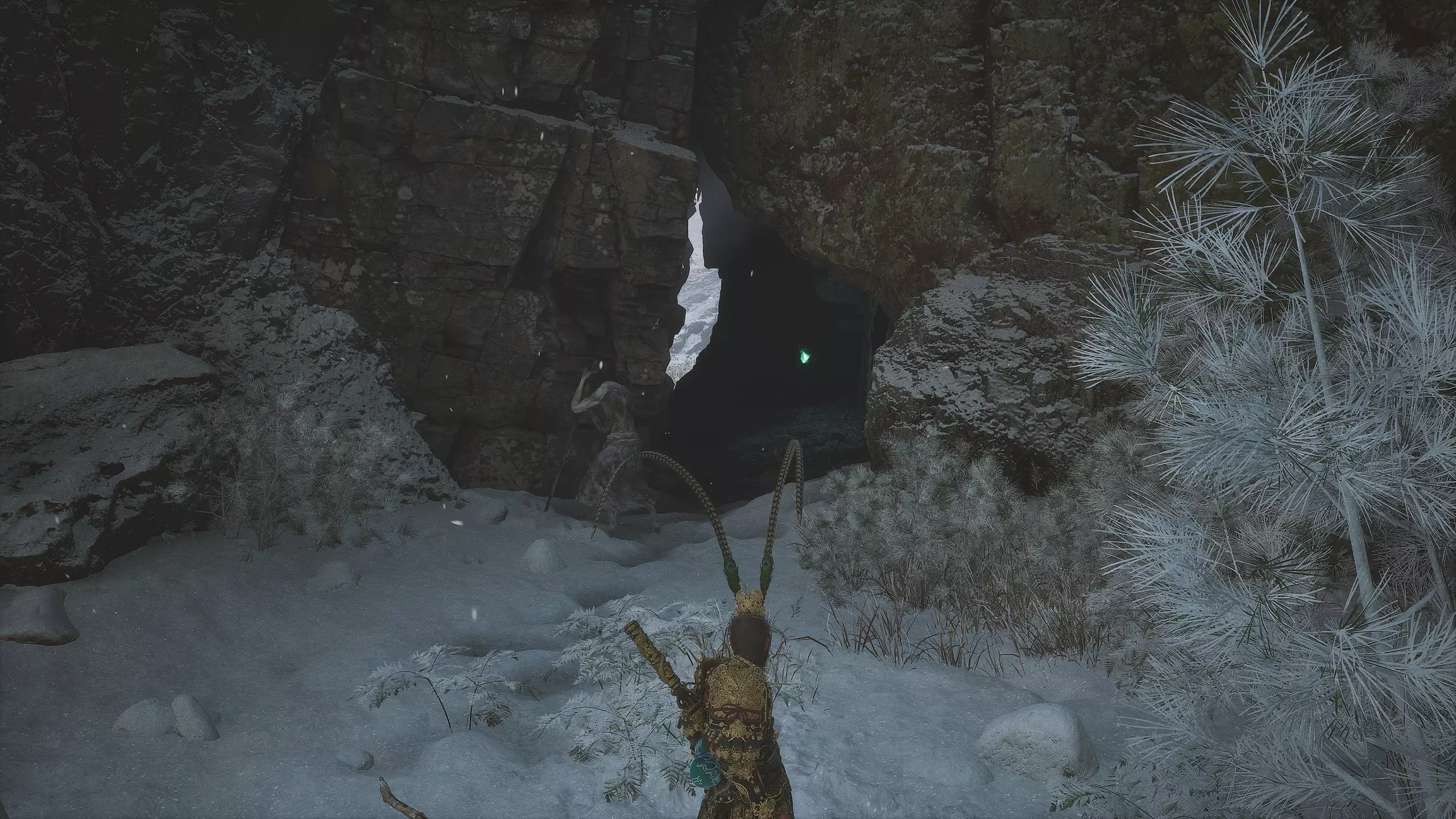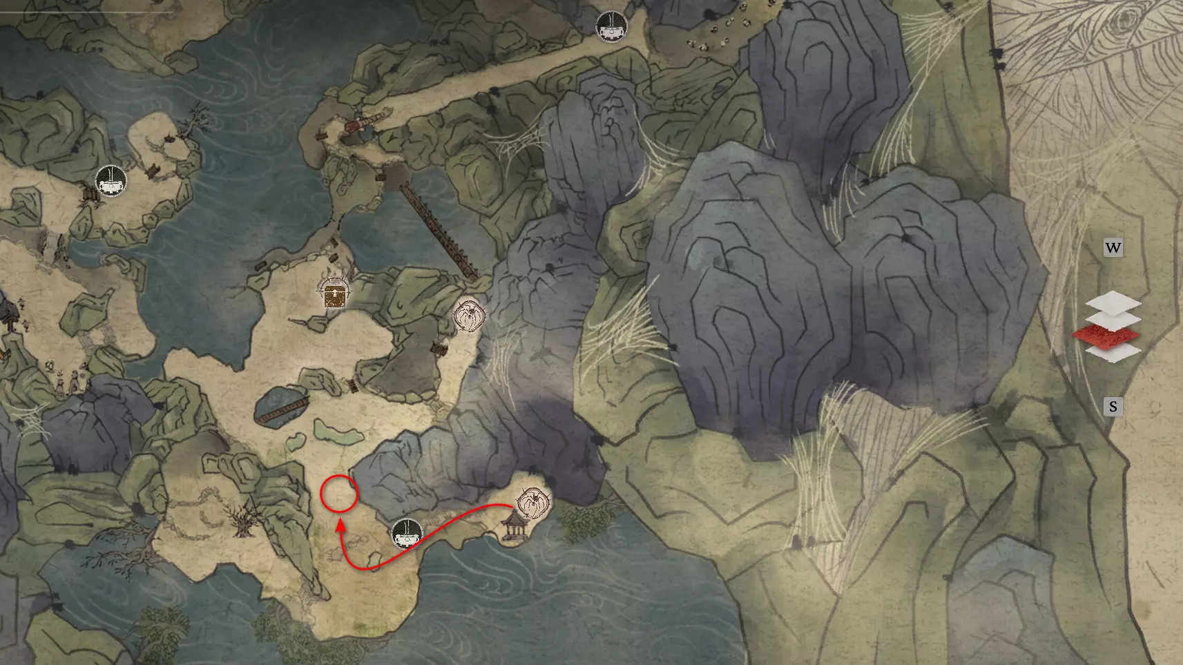 继续直行。左侧会有一个不深的峡谷,但我们稍后再回到这里。走过峡谷上方的石桥,然后向上攀爬。在那里可以找到【佛眼】[4/6]。