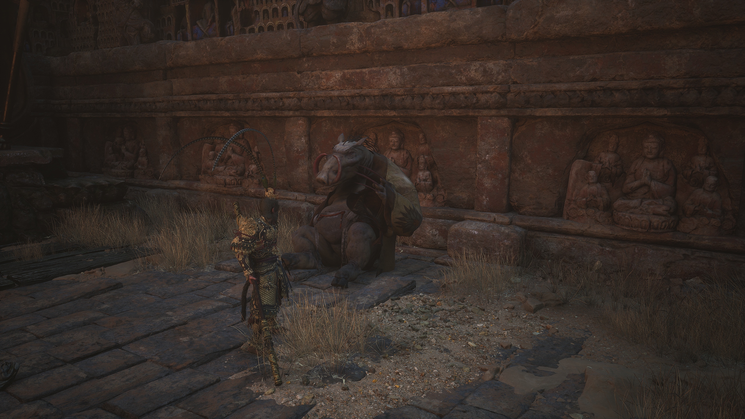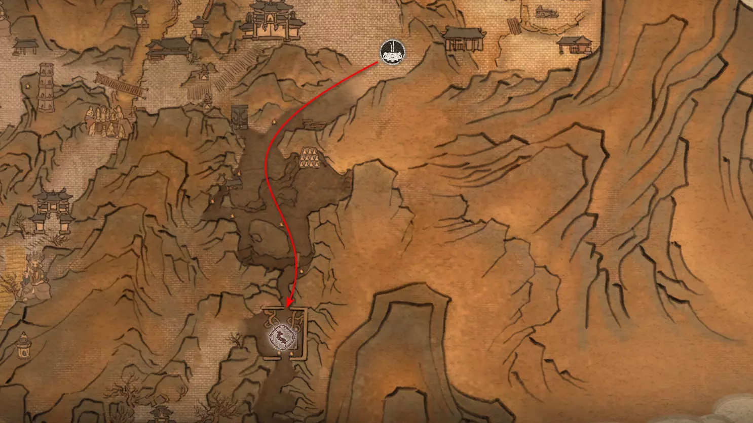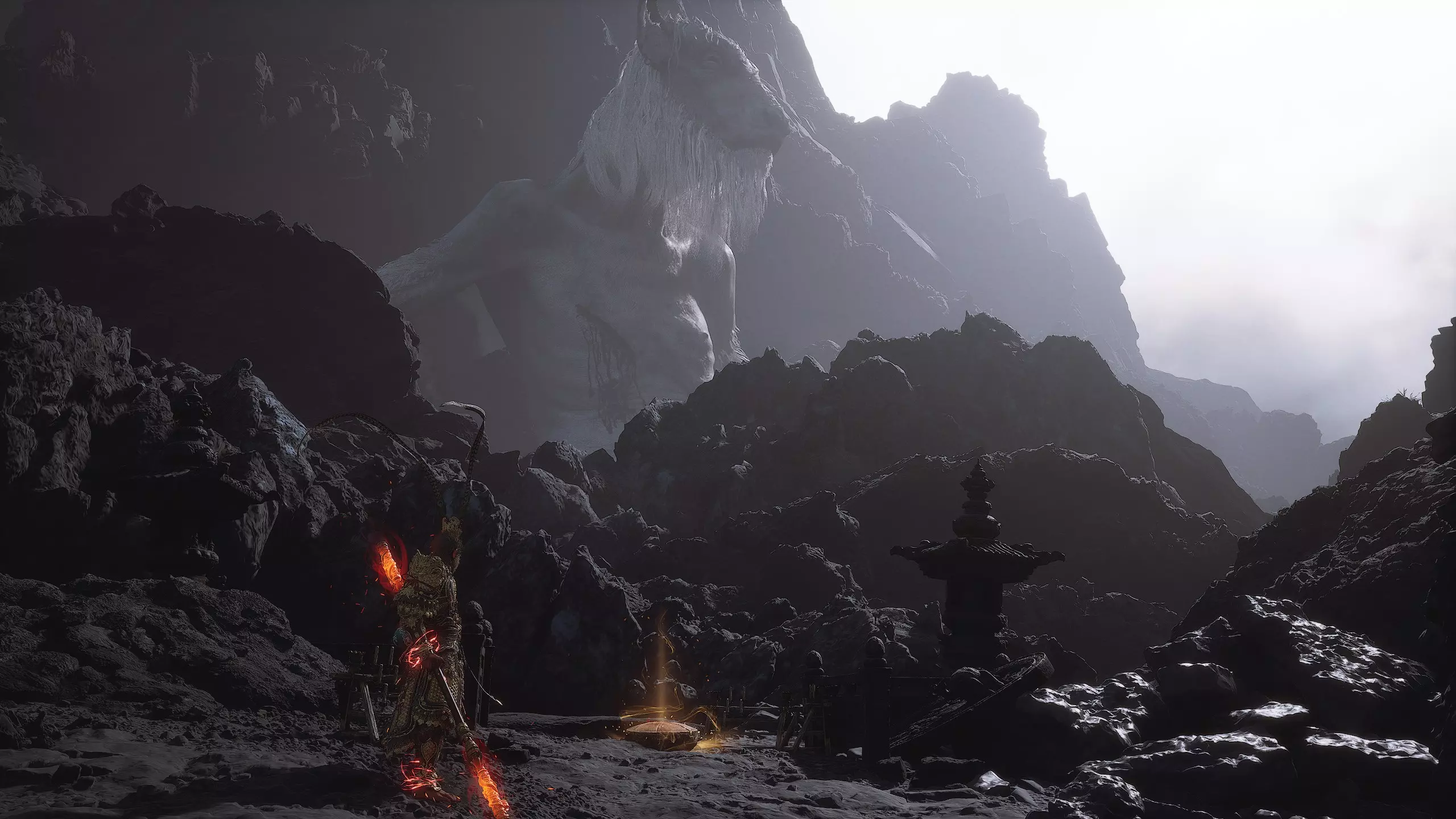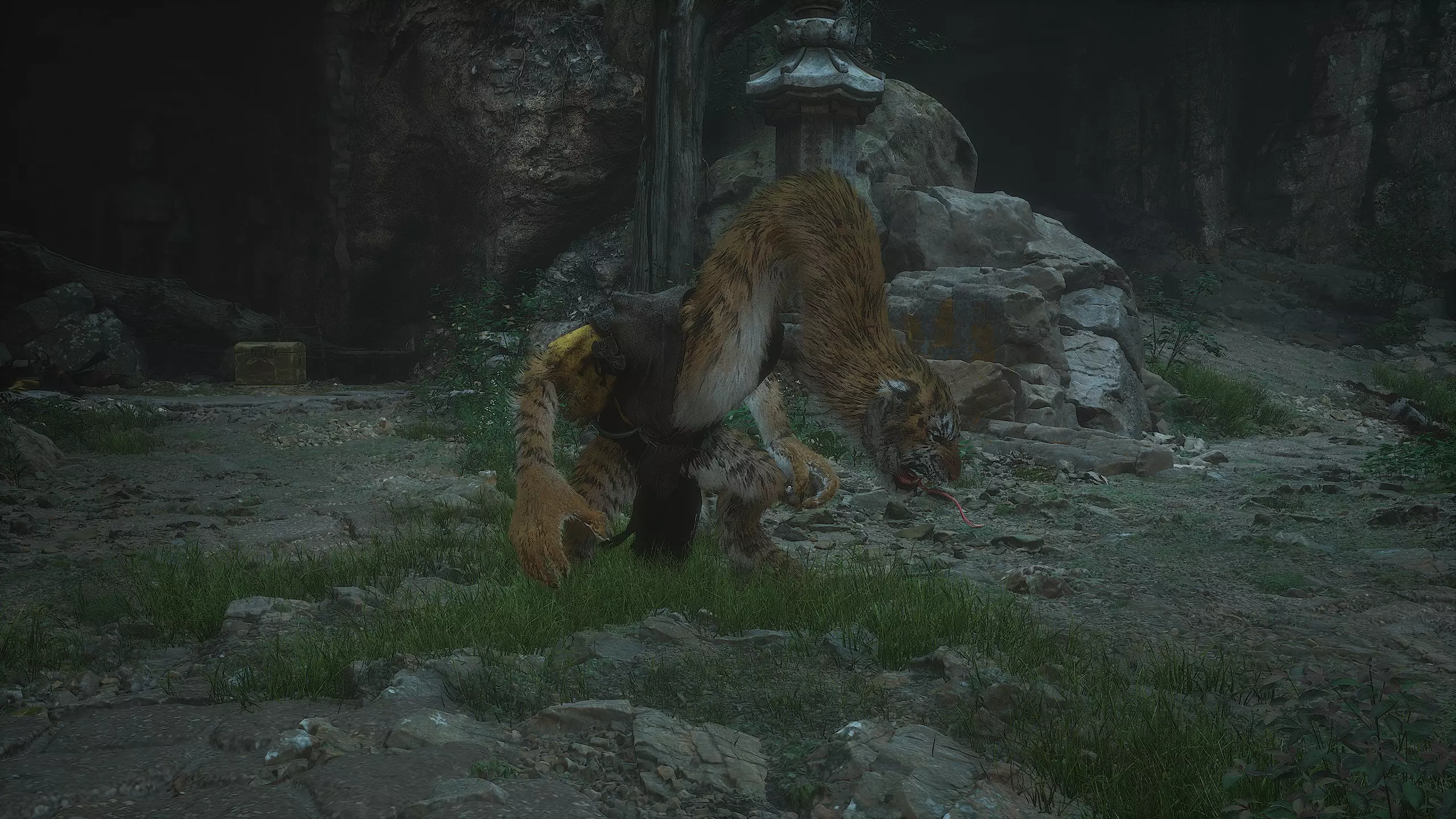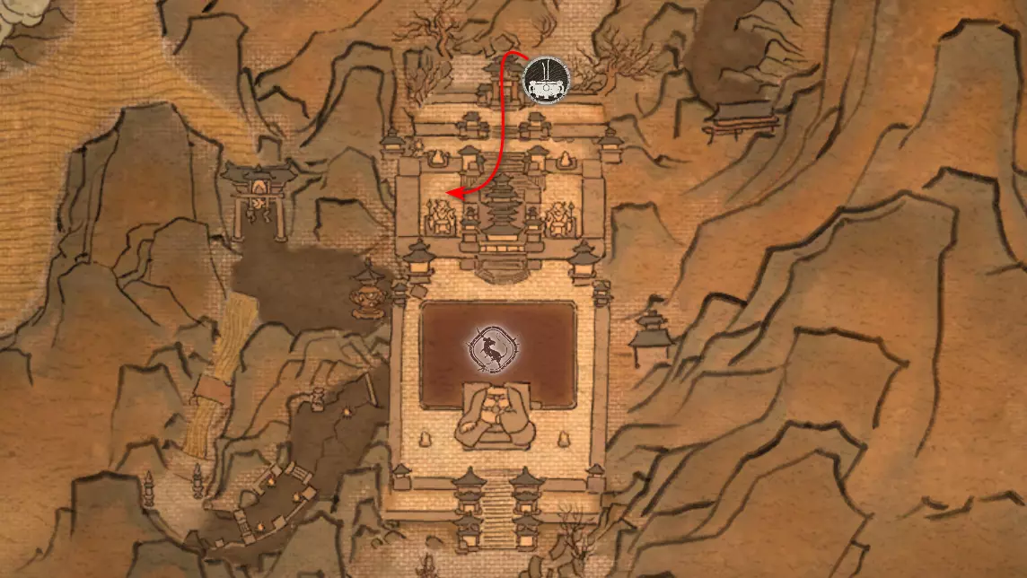第二章 - 黄风岭 偷心虎之祠 走出洞穴,开启“祠庙入口”祭坛,沿台阶向上。在进入竞技场前左转,找到冥想点[5/24] - “偷心虎祠雕塑”