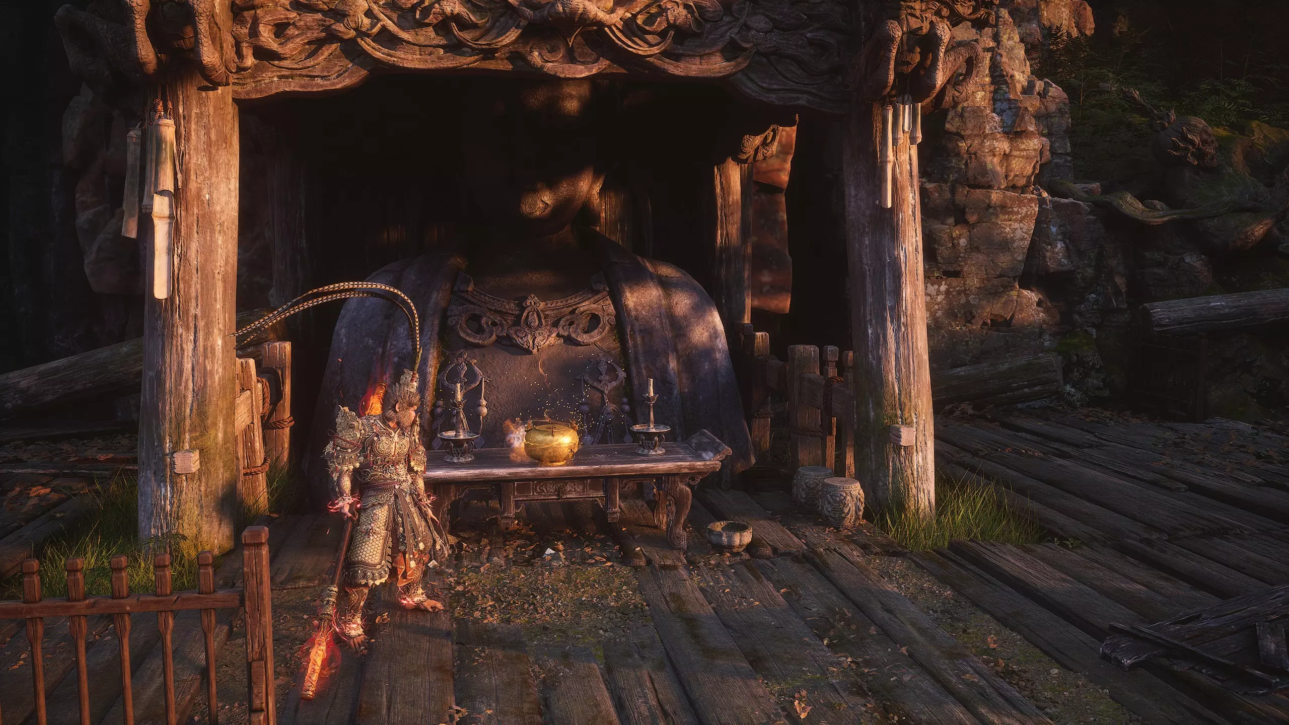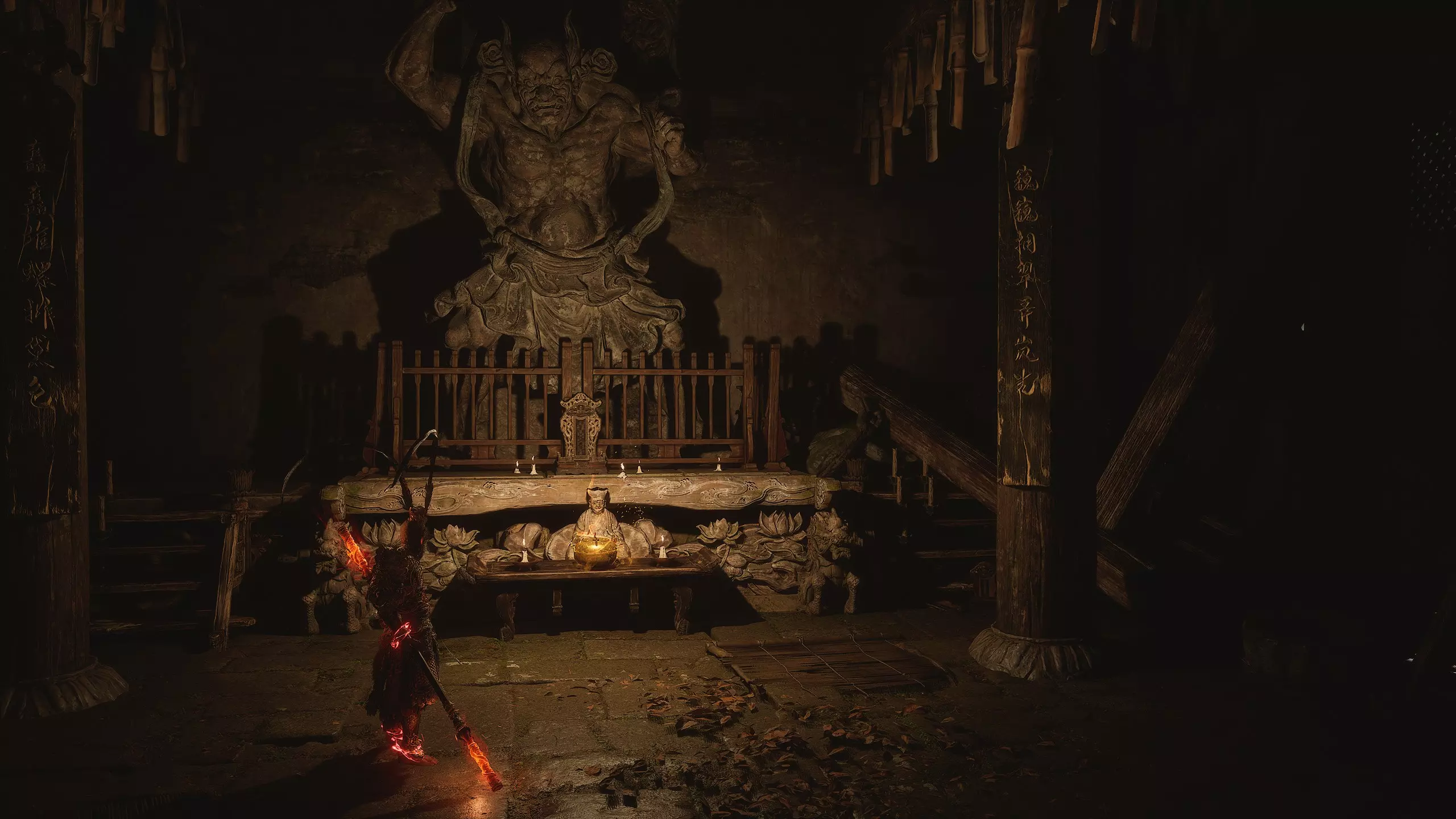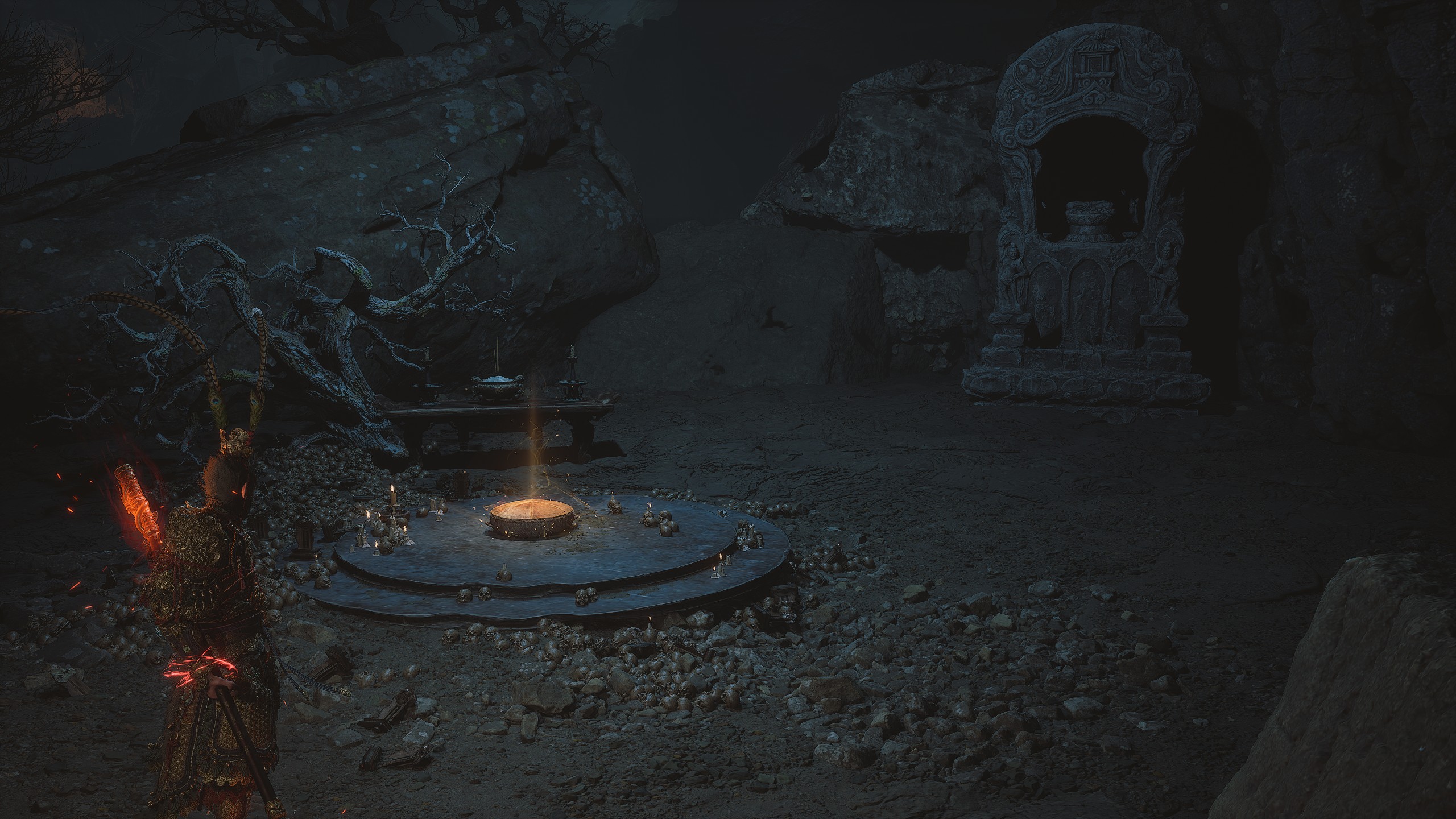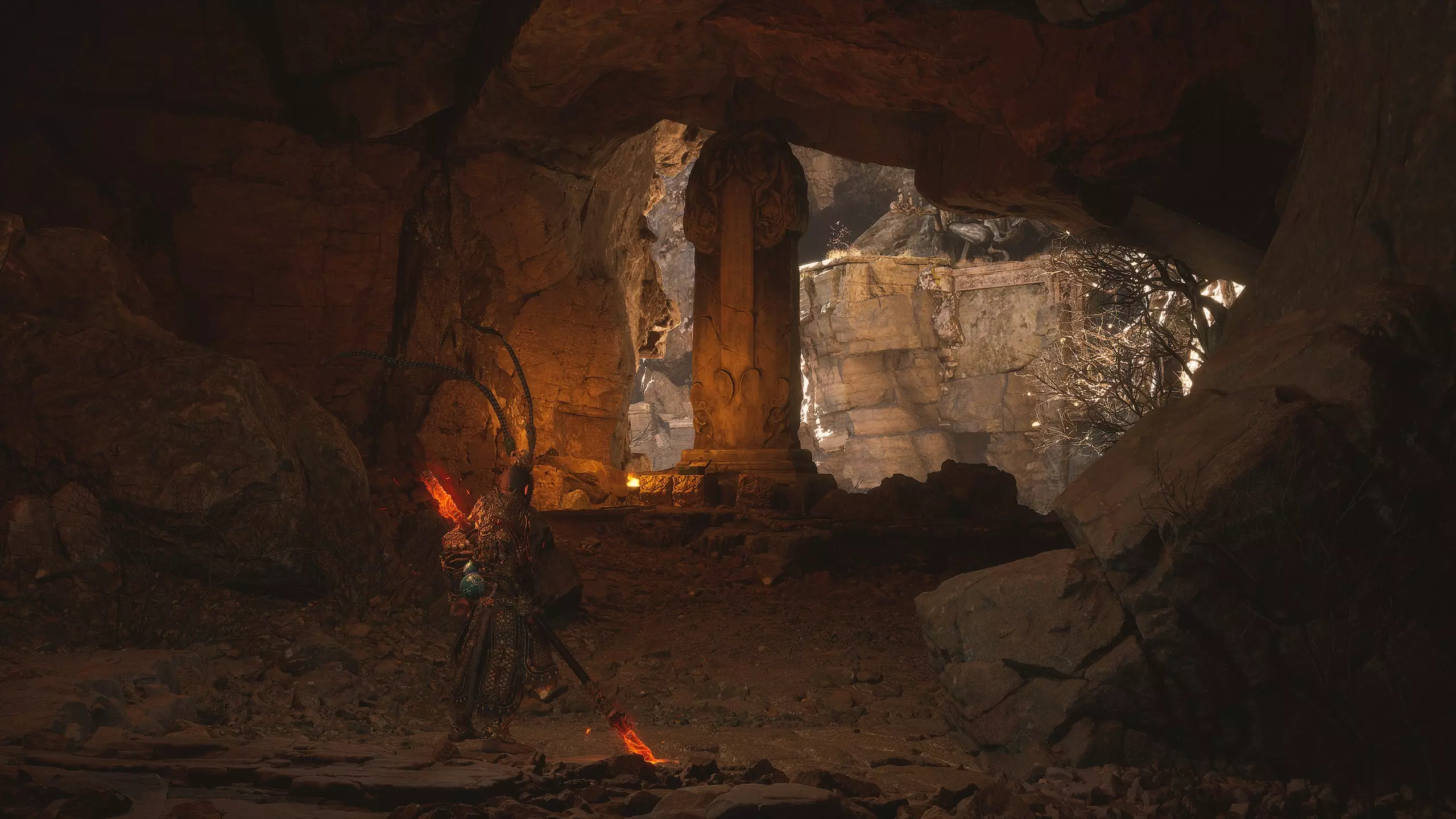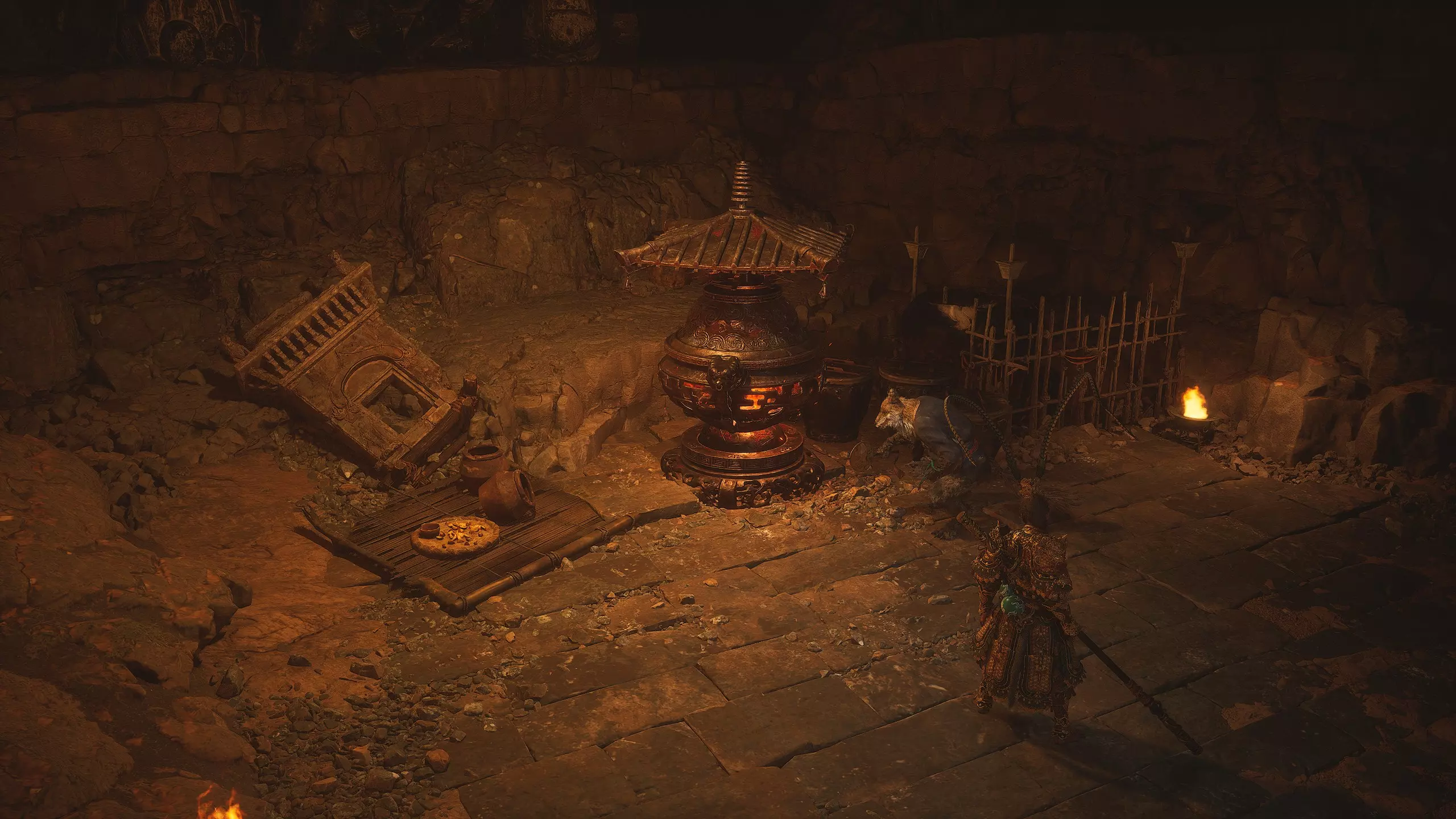 第二章 - 黄风岭 偷心虎之祠 走出洞穴,开启“祠庙入口”祭坛,沿台阶向上。在进入竞技场前左转,找到冥想点[5/24] - “偷心虎祠雕塑”