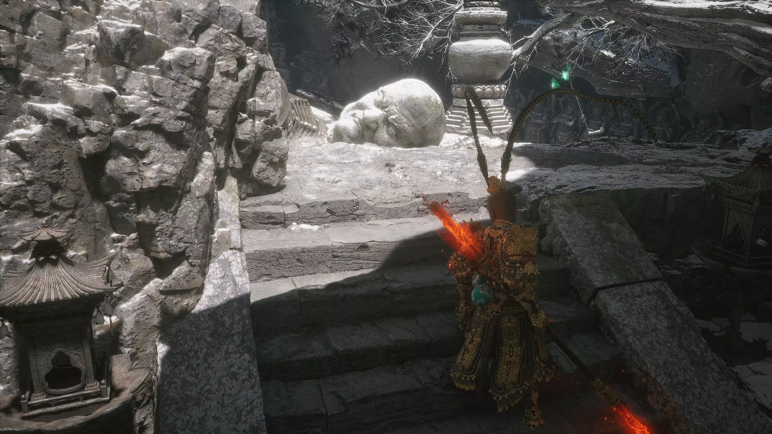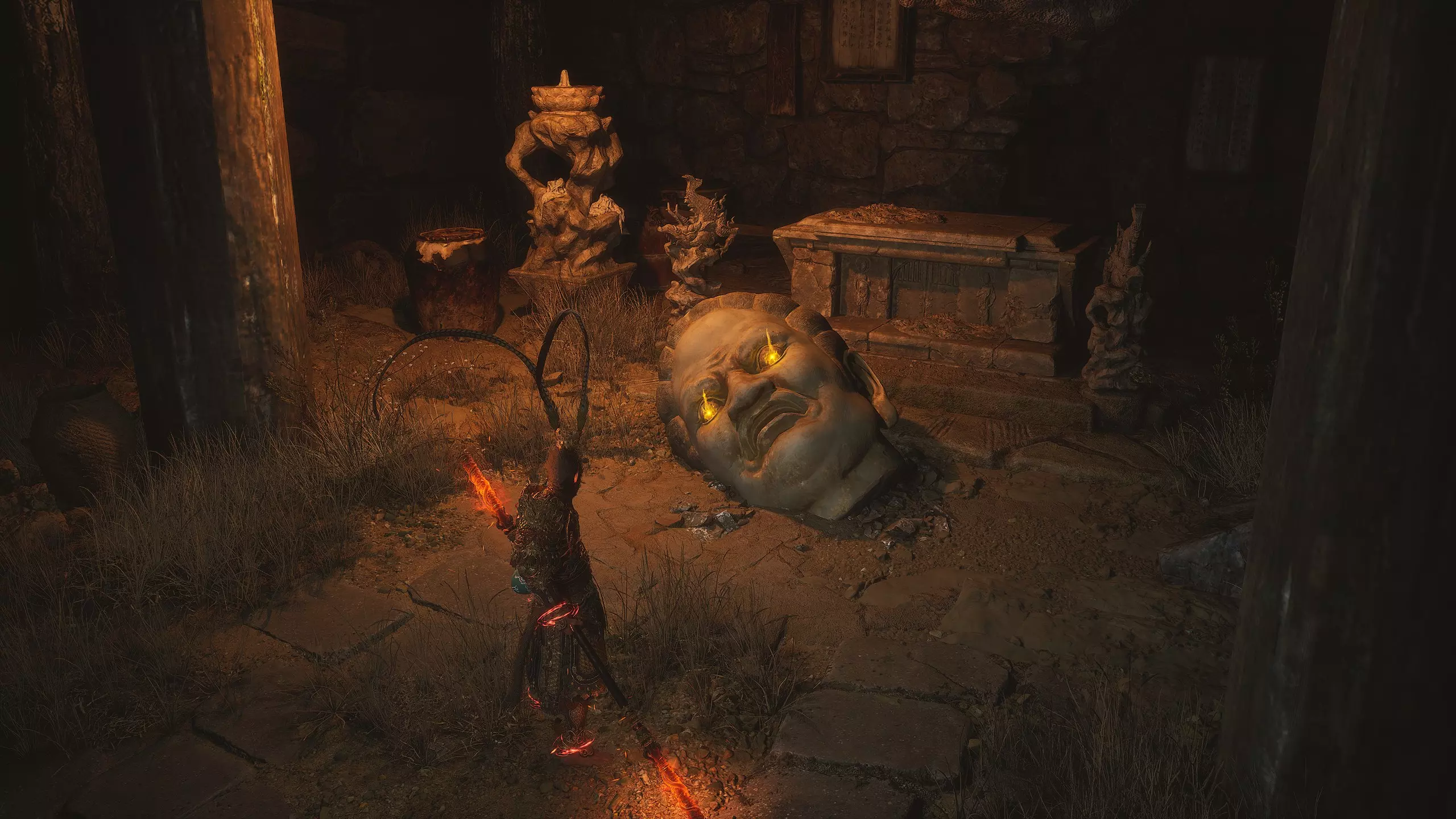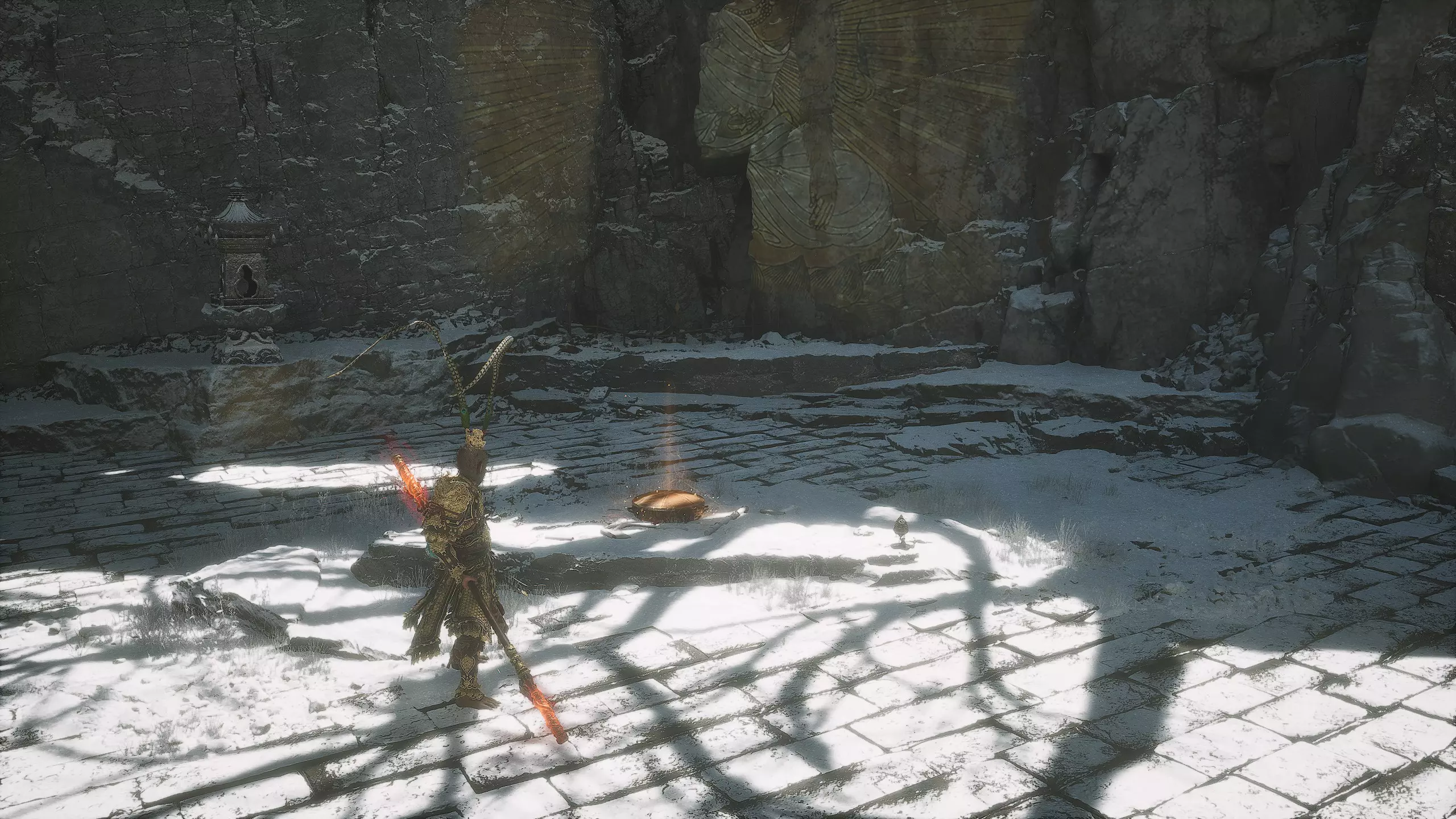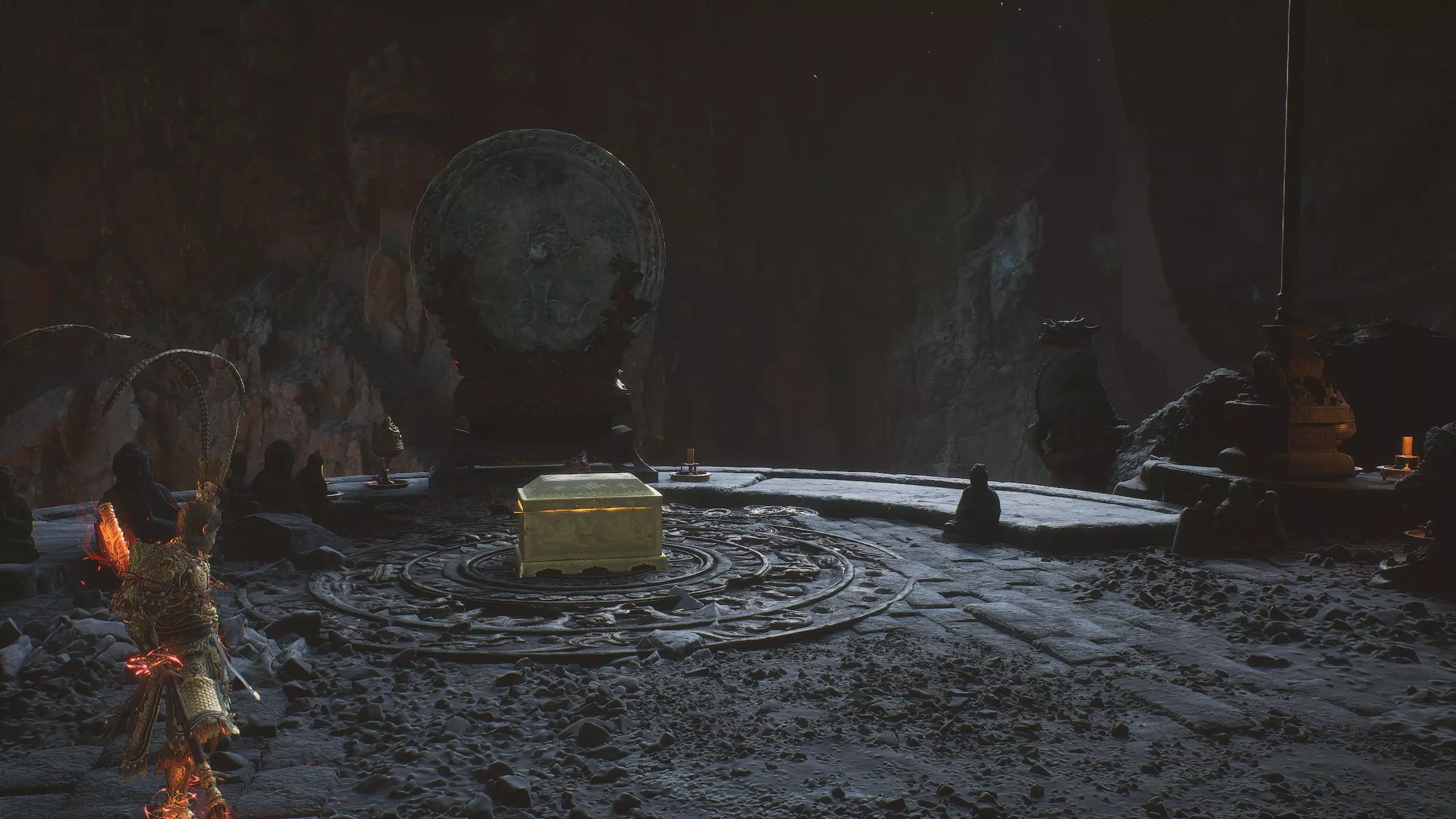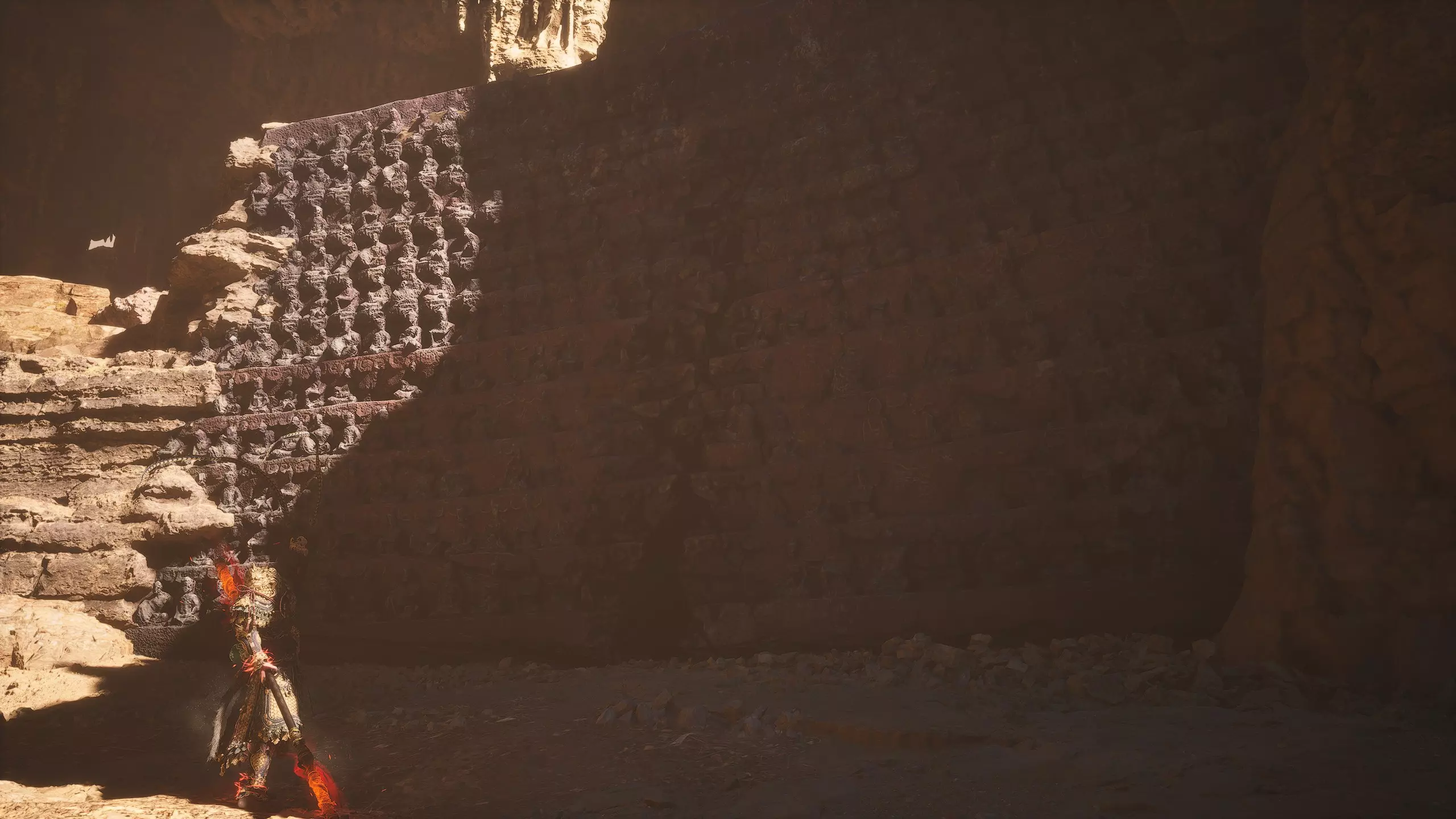第二章 - 黄风岭 偷心虎之祠 走出洞穴,开启“祠庙入口”祭坛,沿台阶向上。在进入竞技场前左转,找到冥想点[5/24] - “偷心虎祠雕塑”