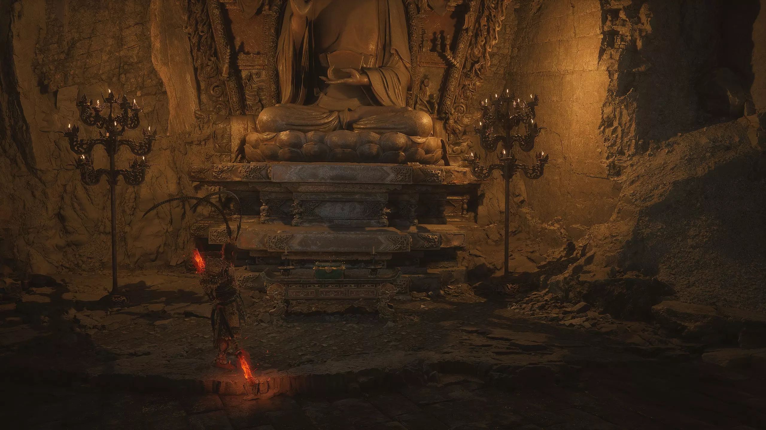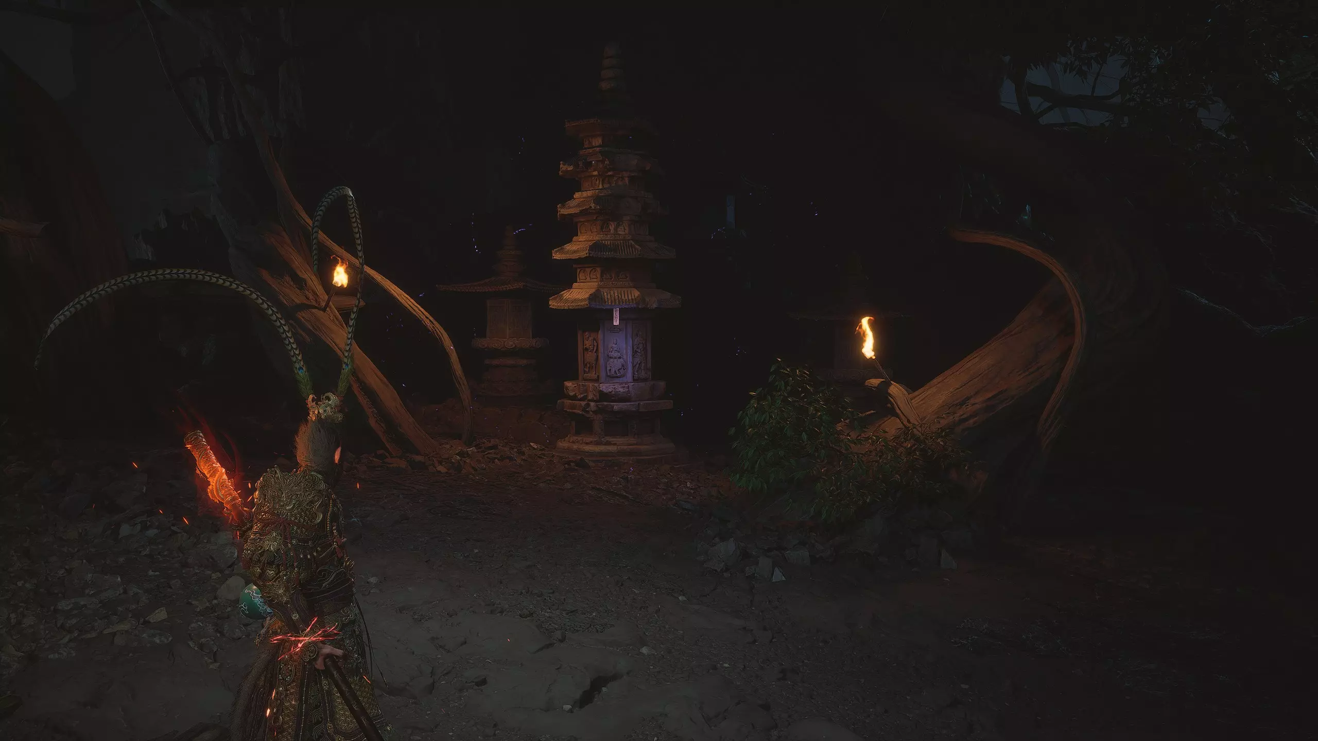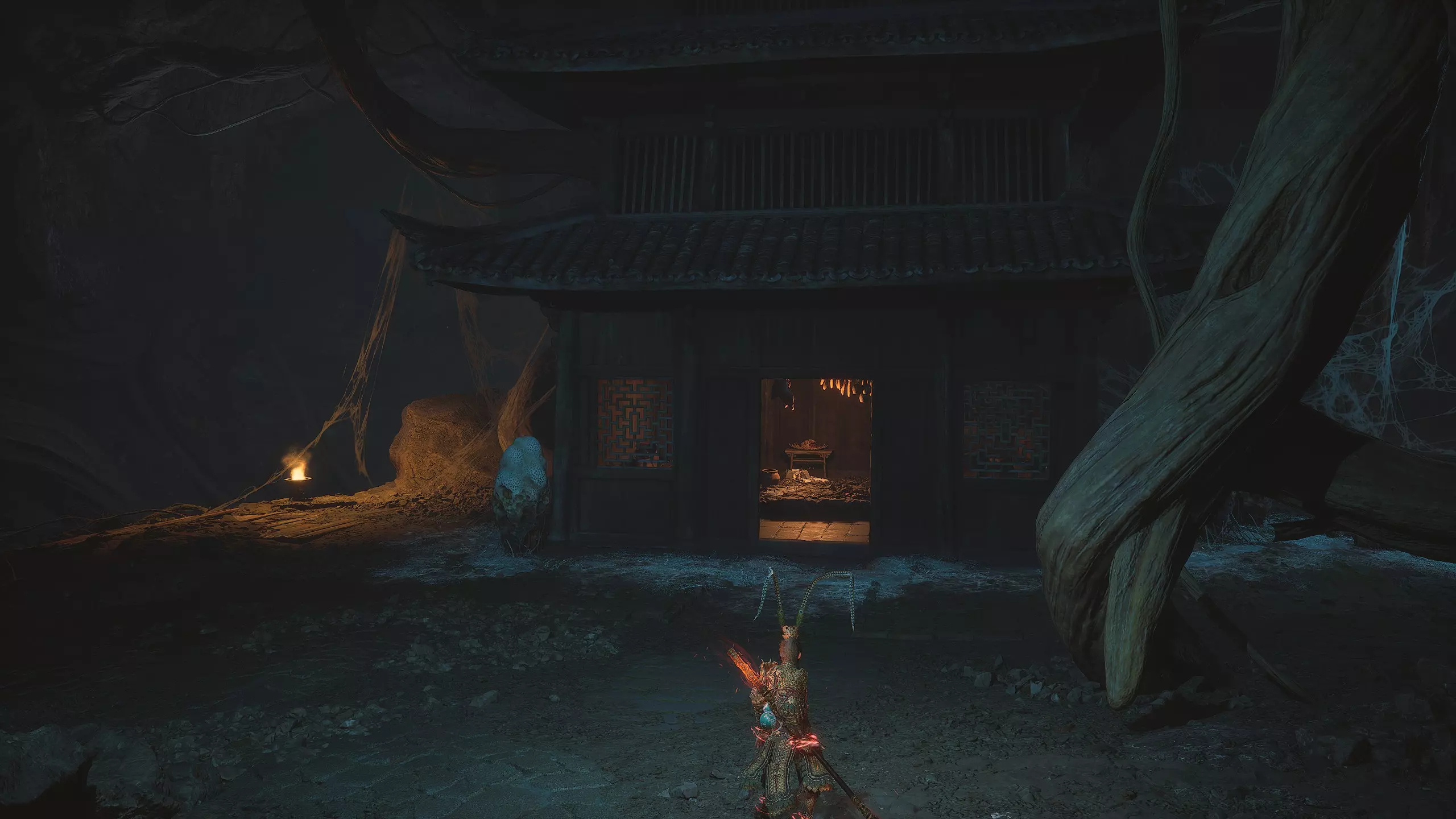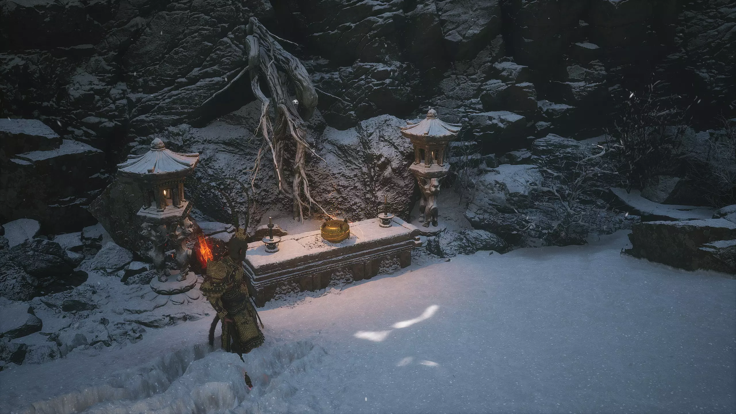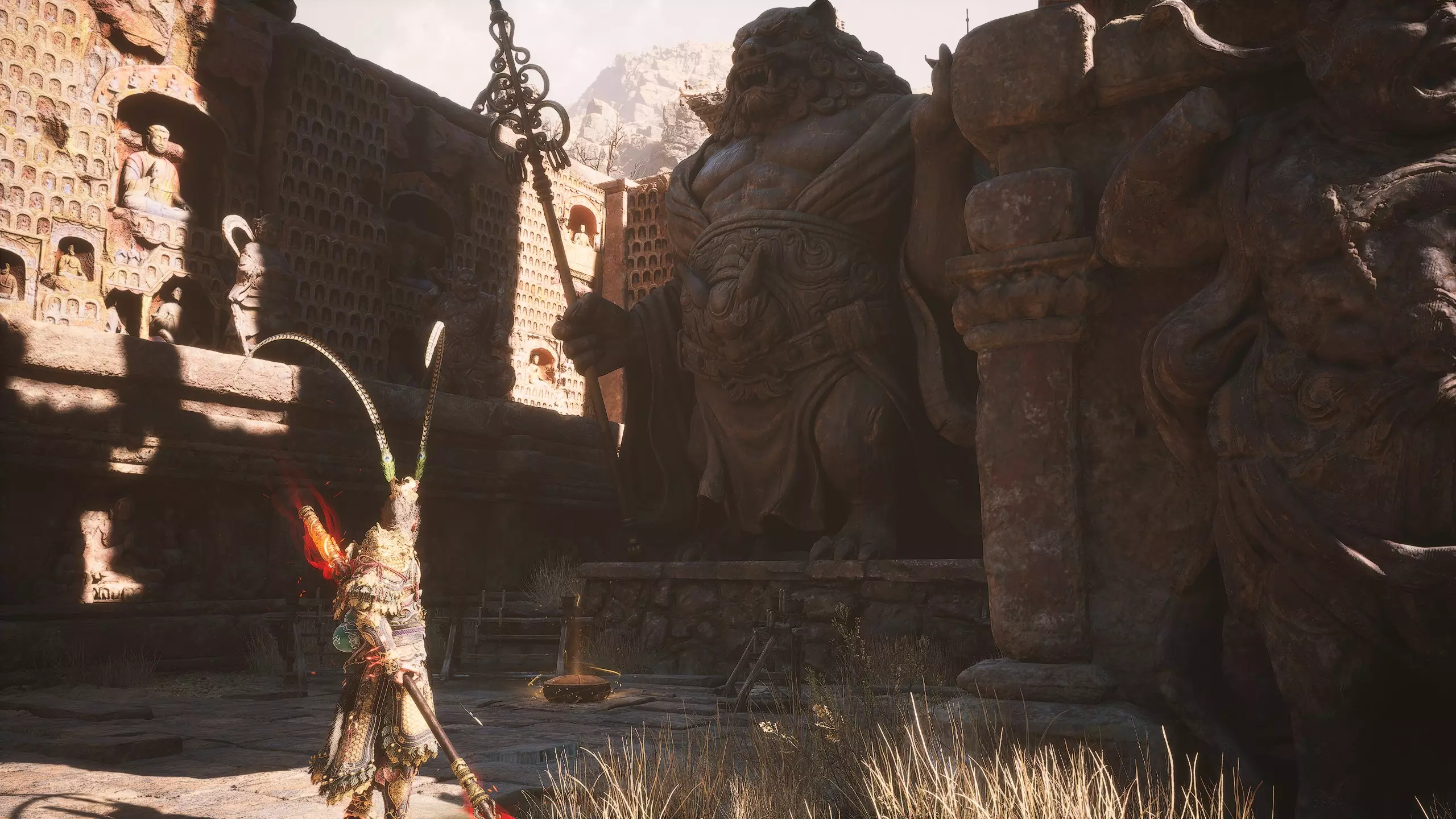 第二章 - 黄风岭 偷心虎之祠 走出洞穴,开启“祠庙入口”祭坛,沿台阶向上。在进入竞技场前左转,找到冥想点[5/24] - “偷心虎祠雕塑”