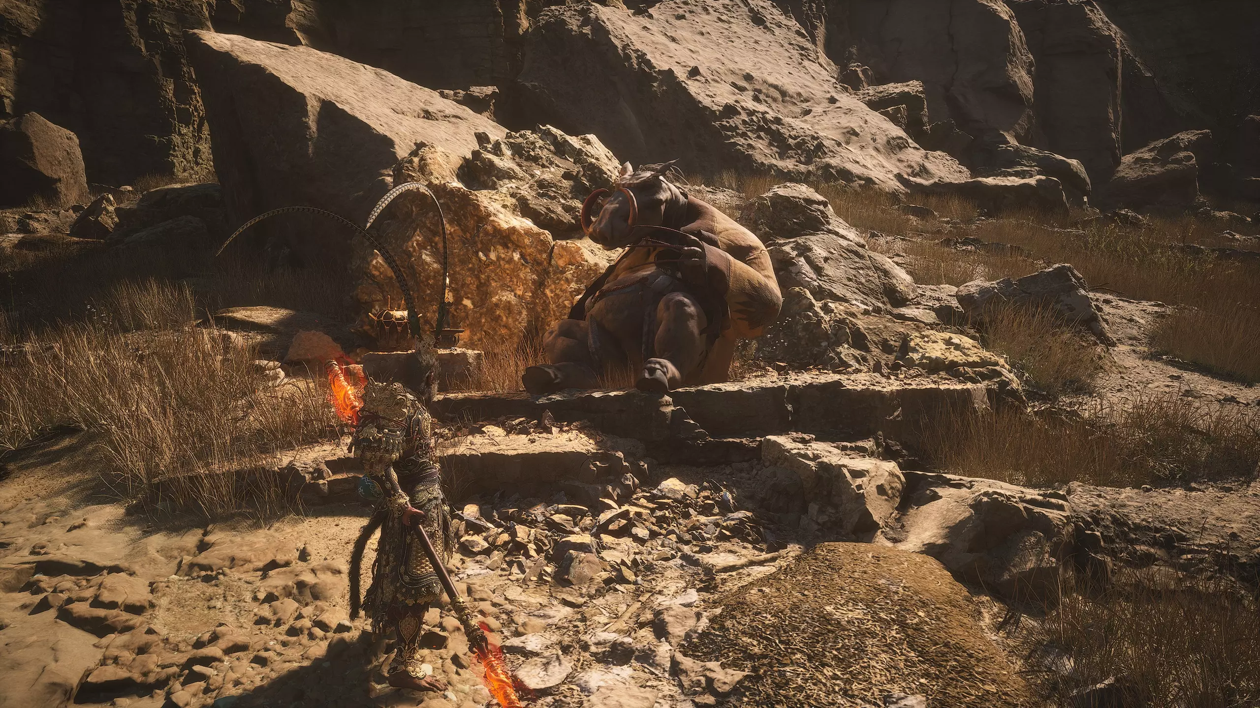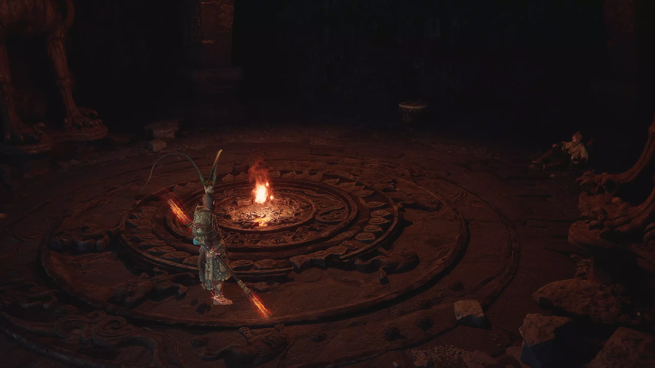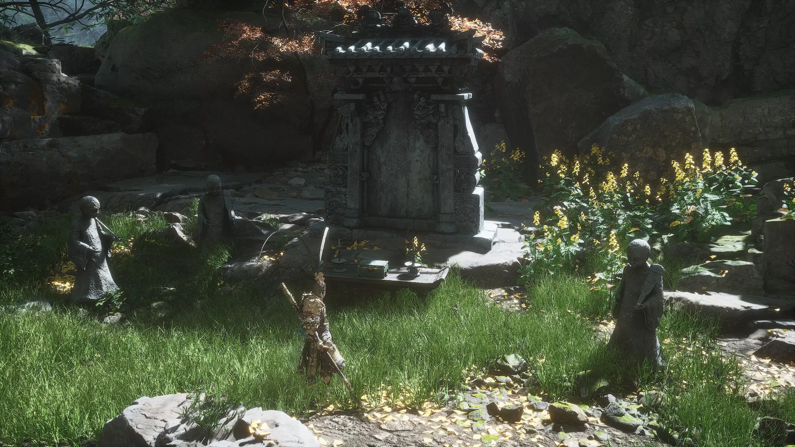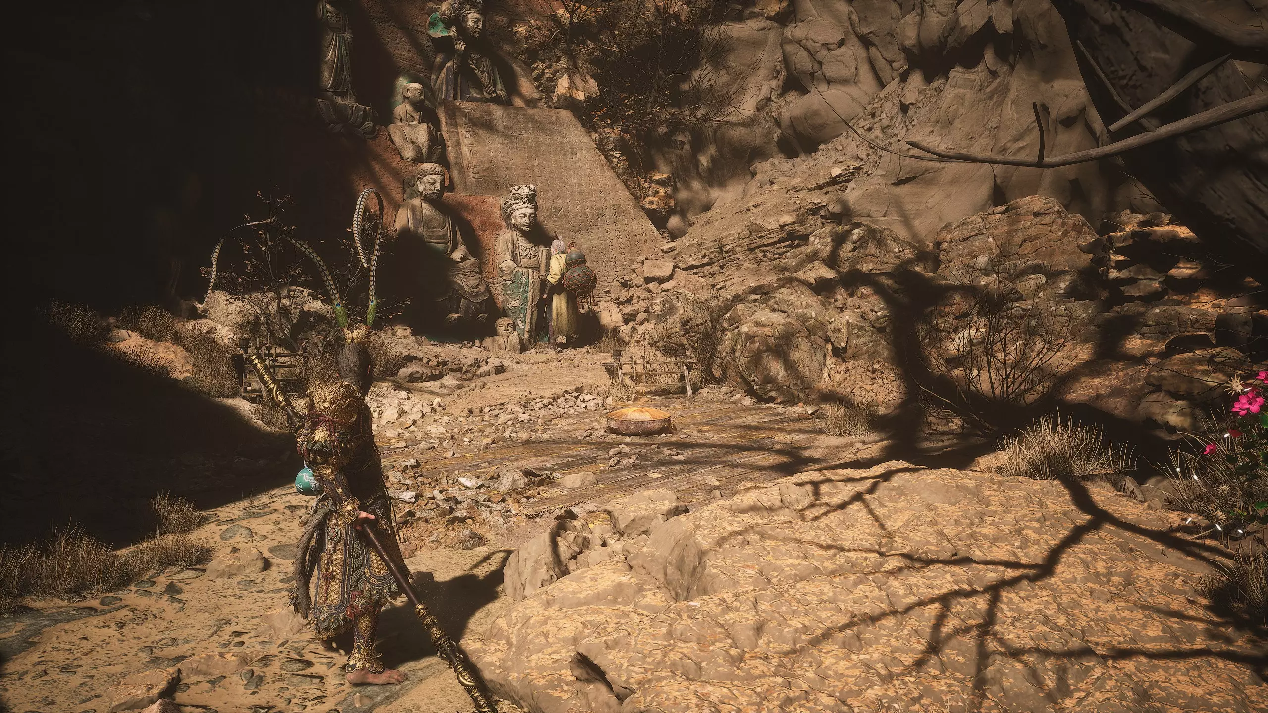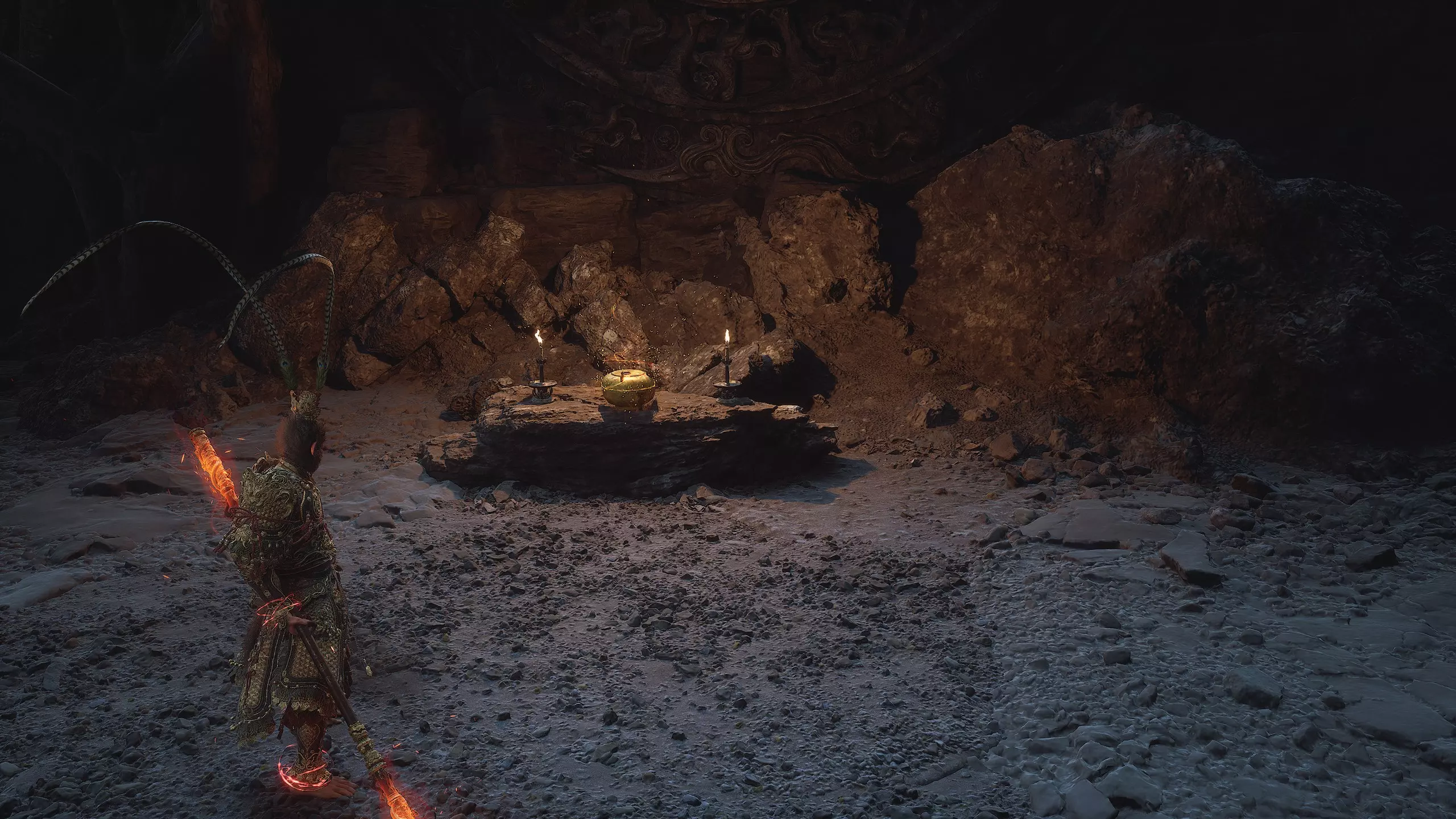 第二章 - 黄风岭 偷心虎之祠 走出洞穴,开启“祠庙入口”祭坛,沿台阶向上。在进入竞技场前左转,找到冥想点[5/24] - “偷心虎祠雕塑”