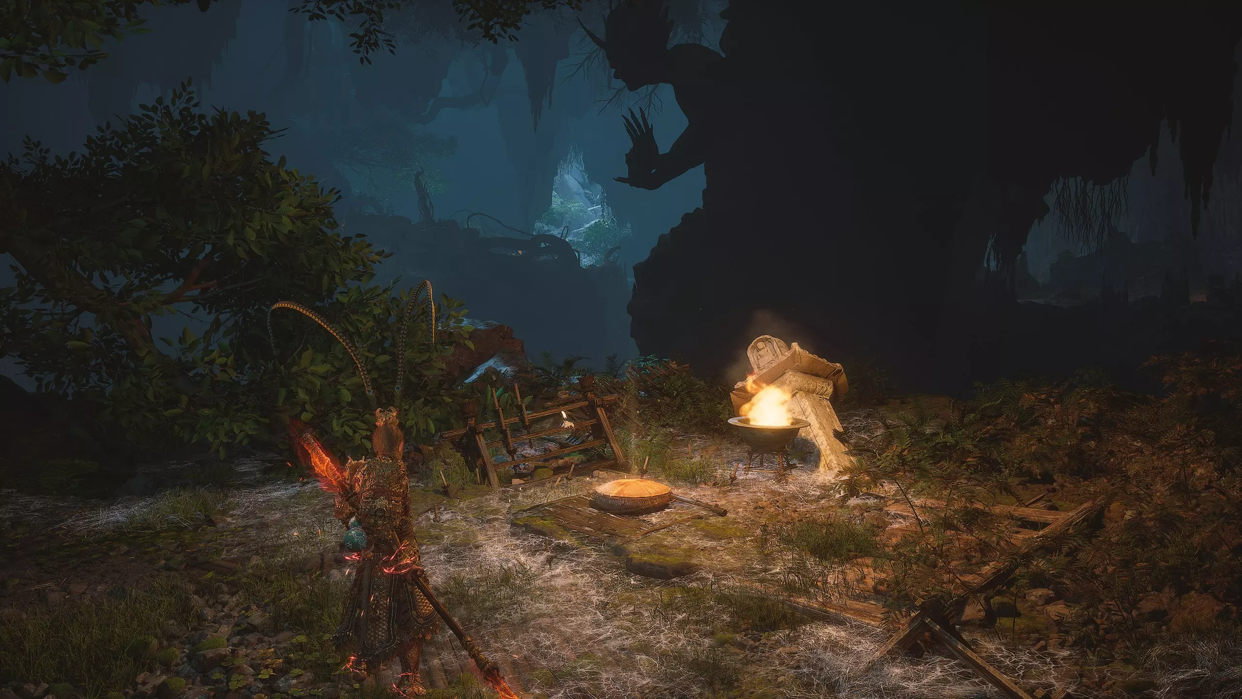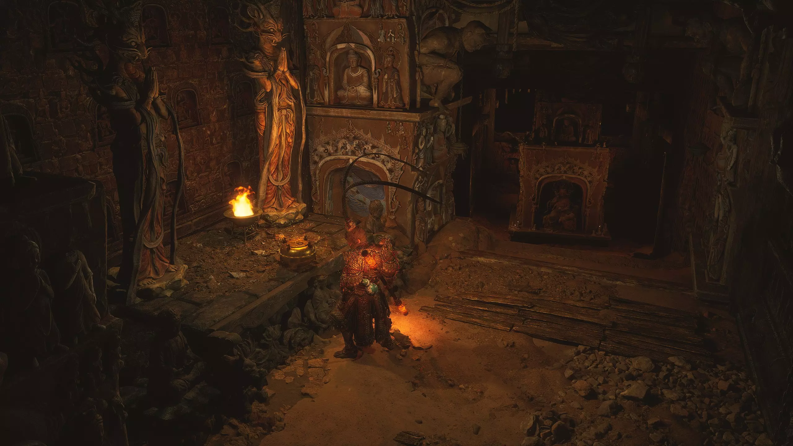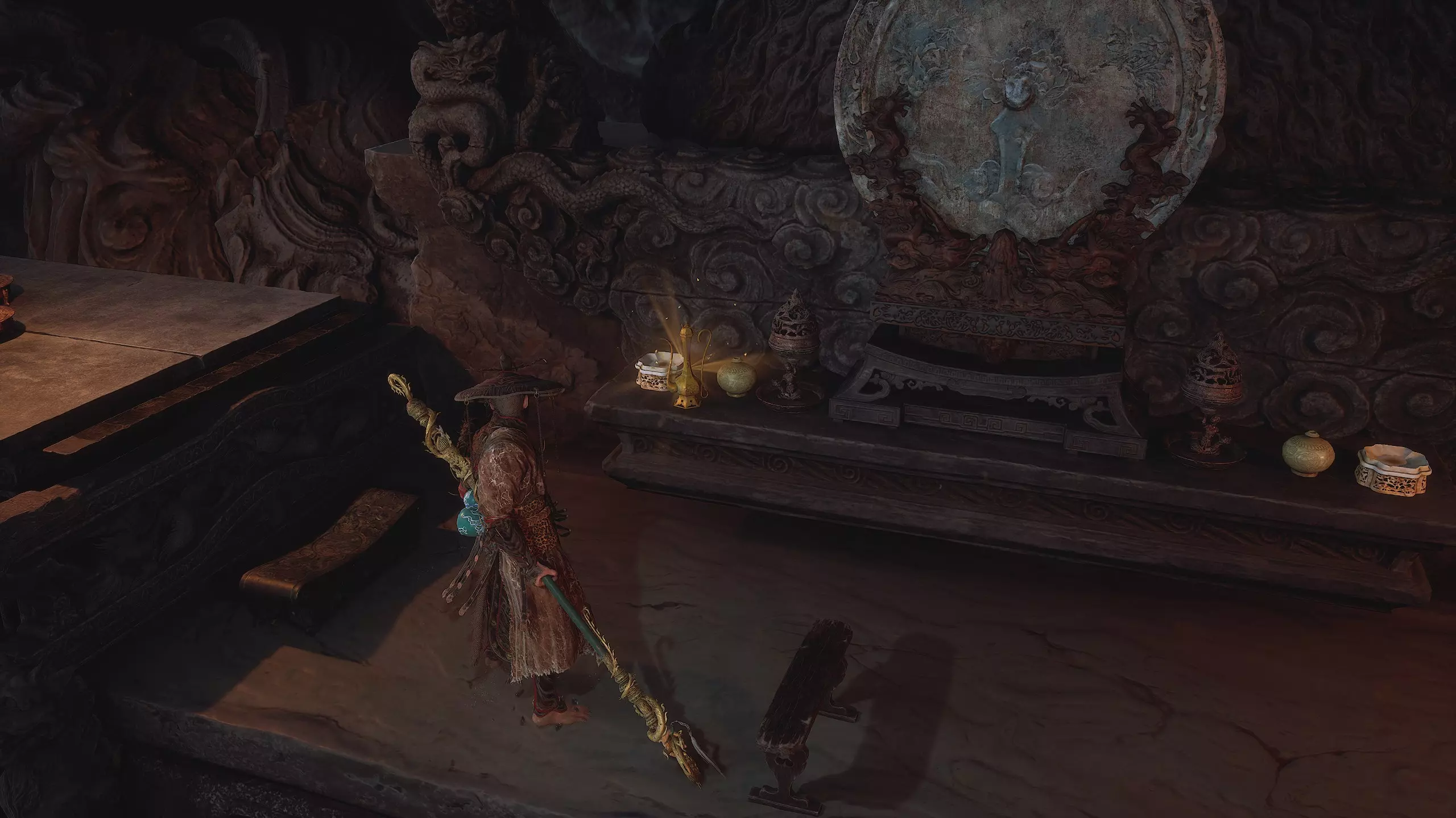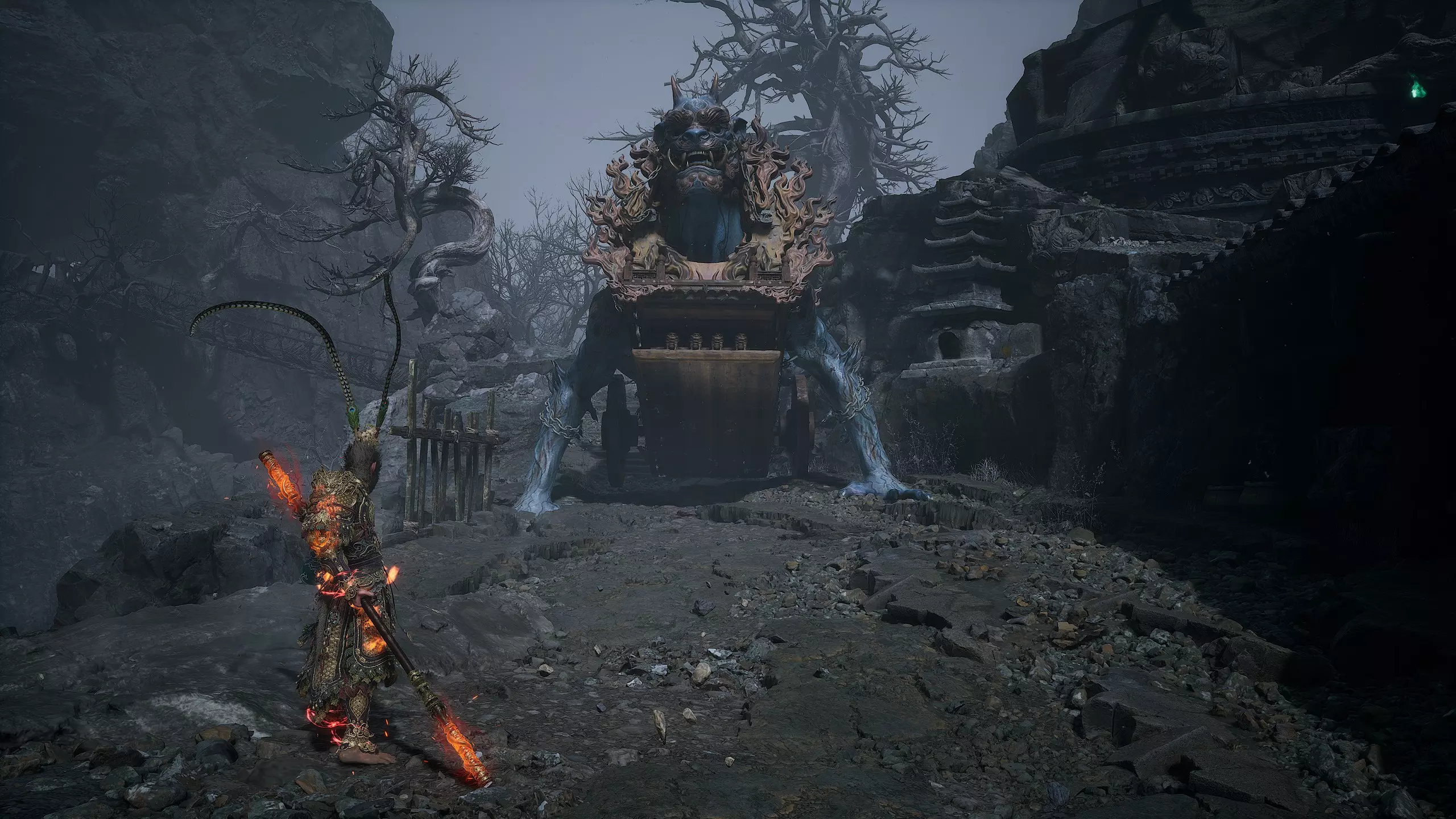 第二章 - 黄风岭 偷心虎之祠 走出洞穴,开启“祠庙入口”祭坛,沿台阶向上。在进入竞技场前左转,找到冥想点[5/24] - “偷心虎祠雕塑”