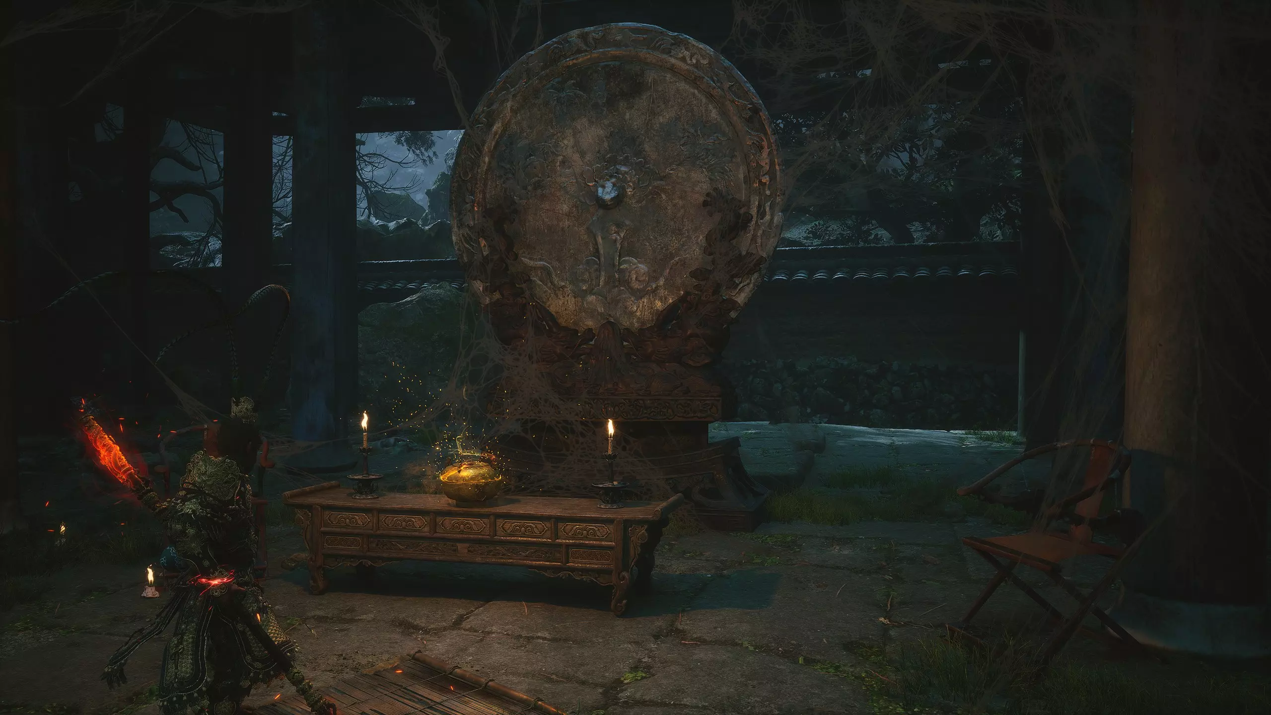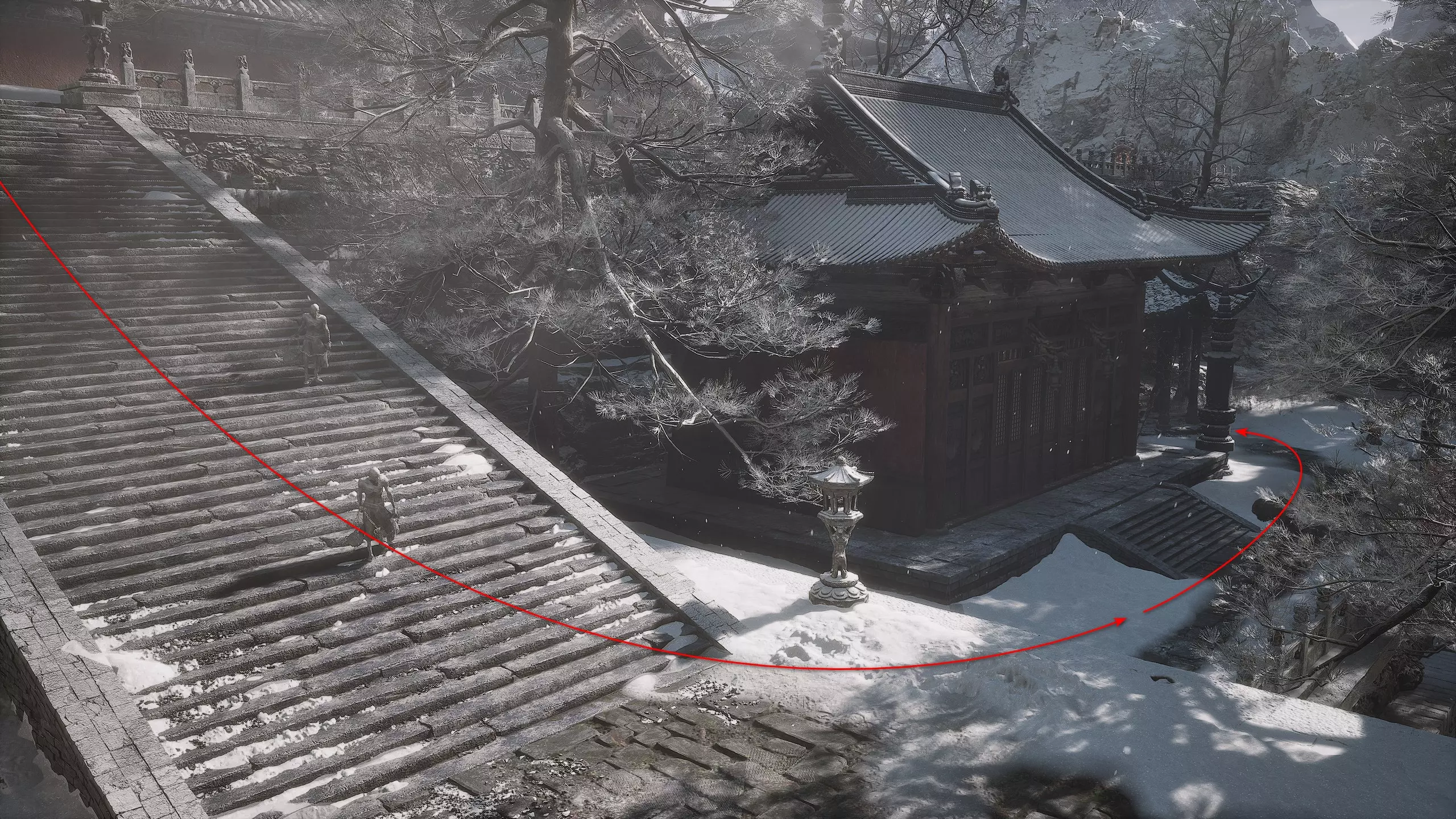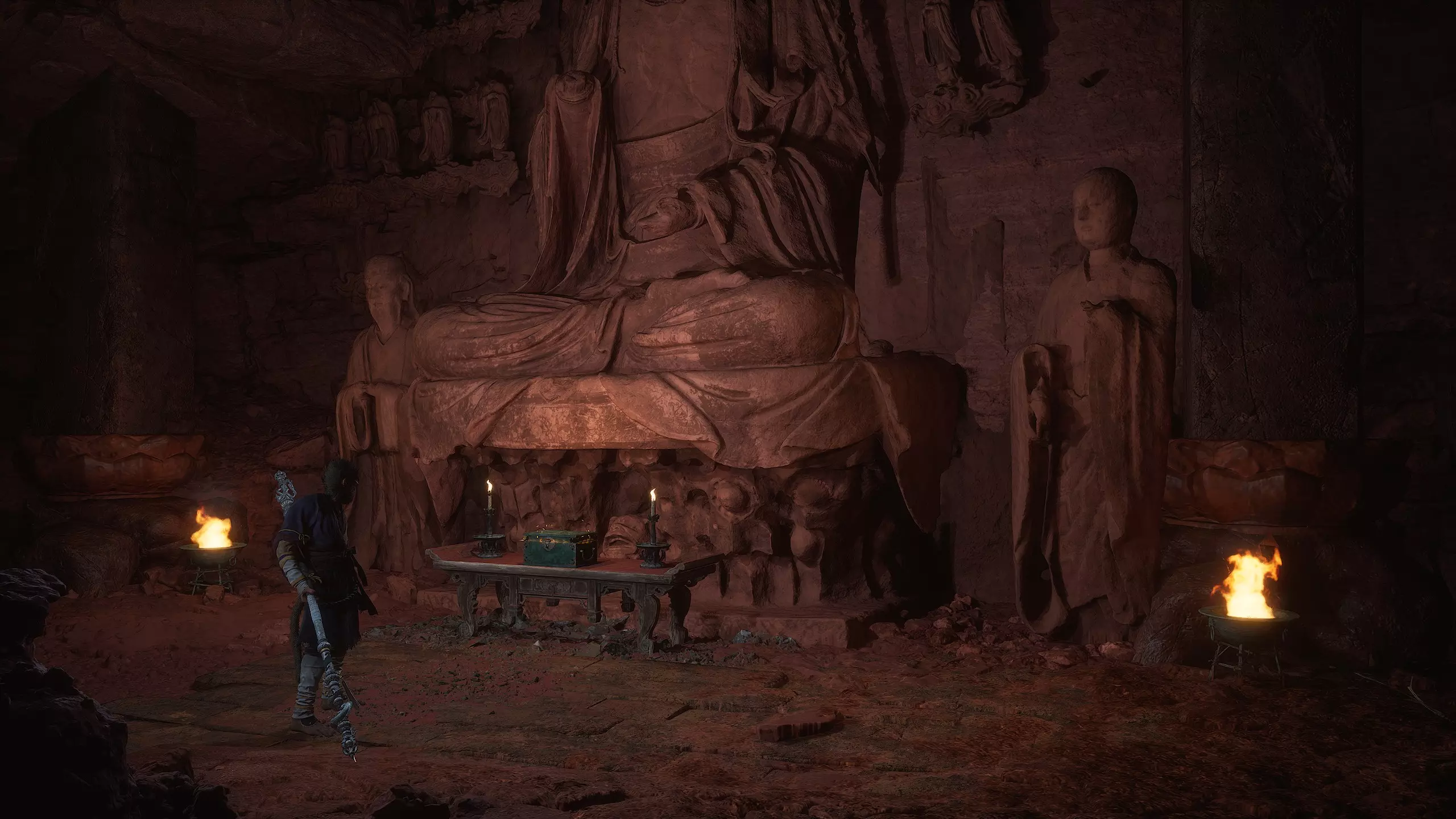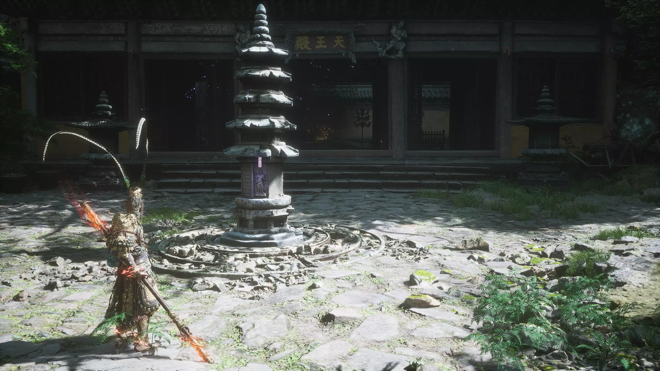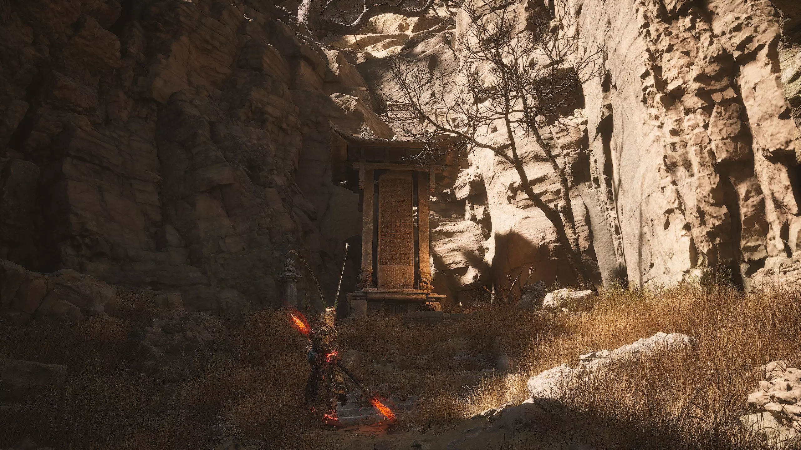 第二章 - 黄风岭 偷心虎之祠 走出洞穴,开启“祠庙入口”祭坛,沿台阶向上。在进入竞技场前左转,找到冥想点[5/24] - “偷心虎祠雕塑”