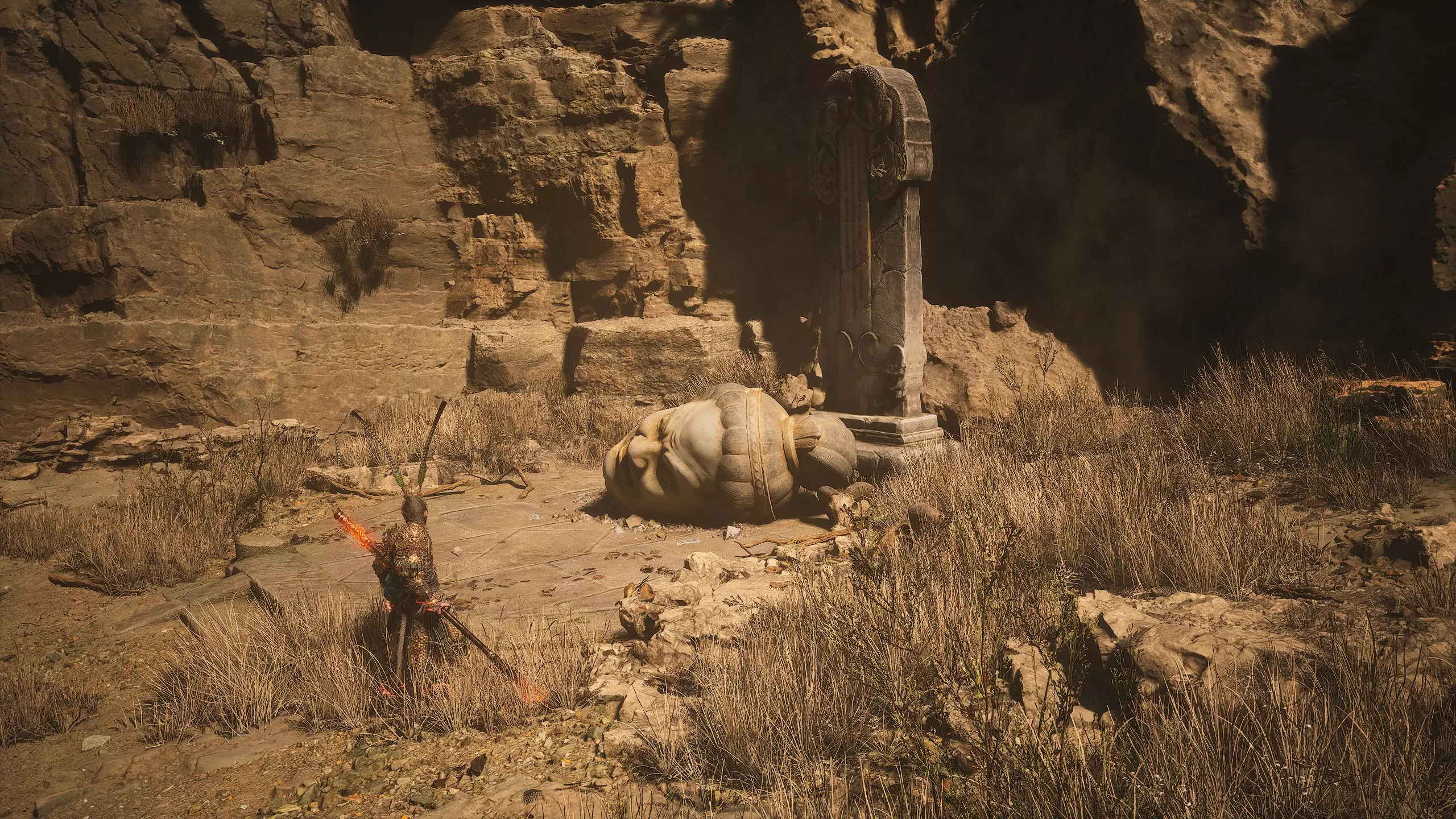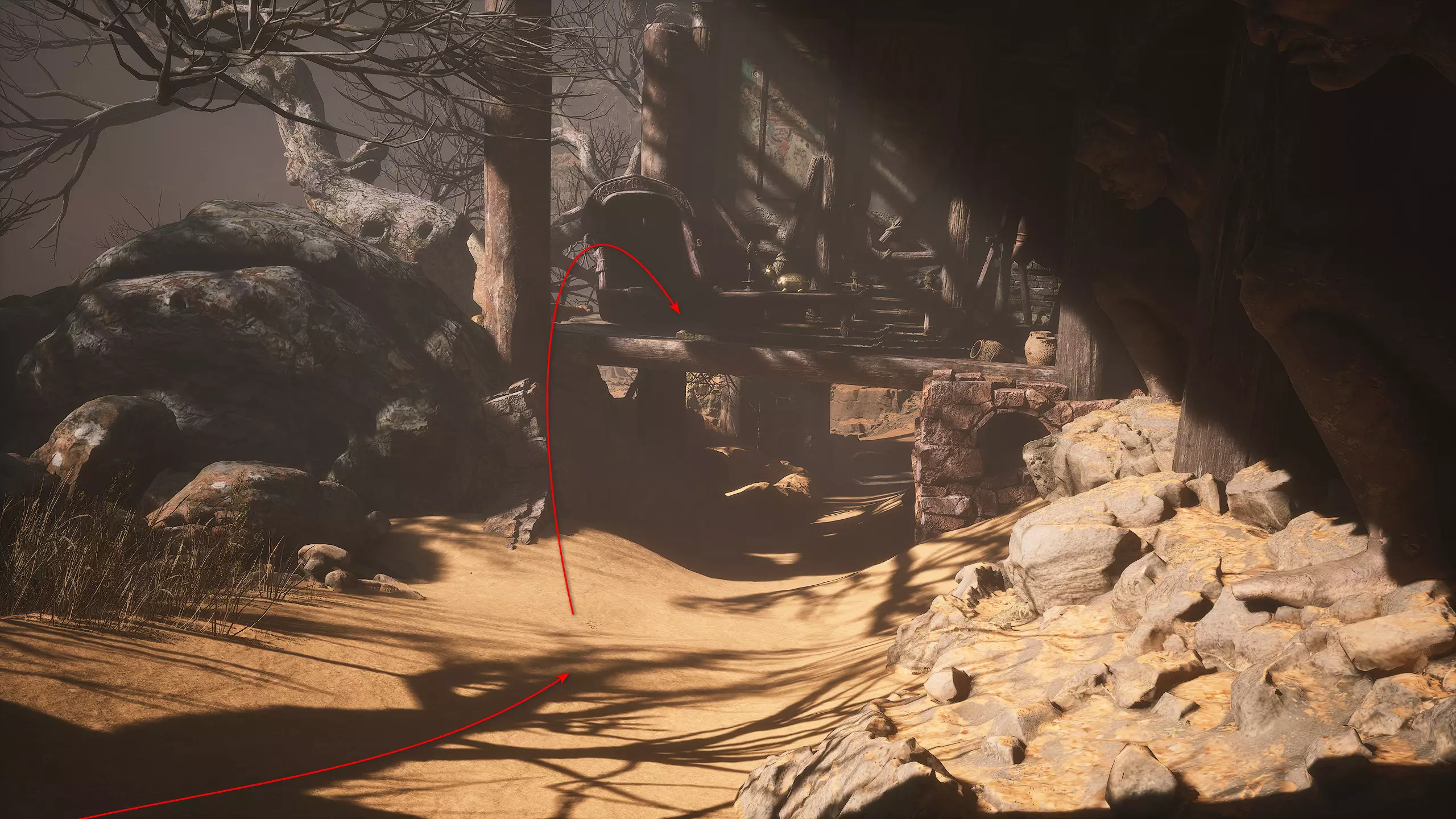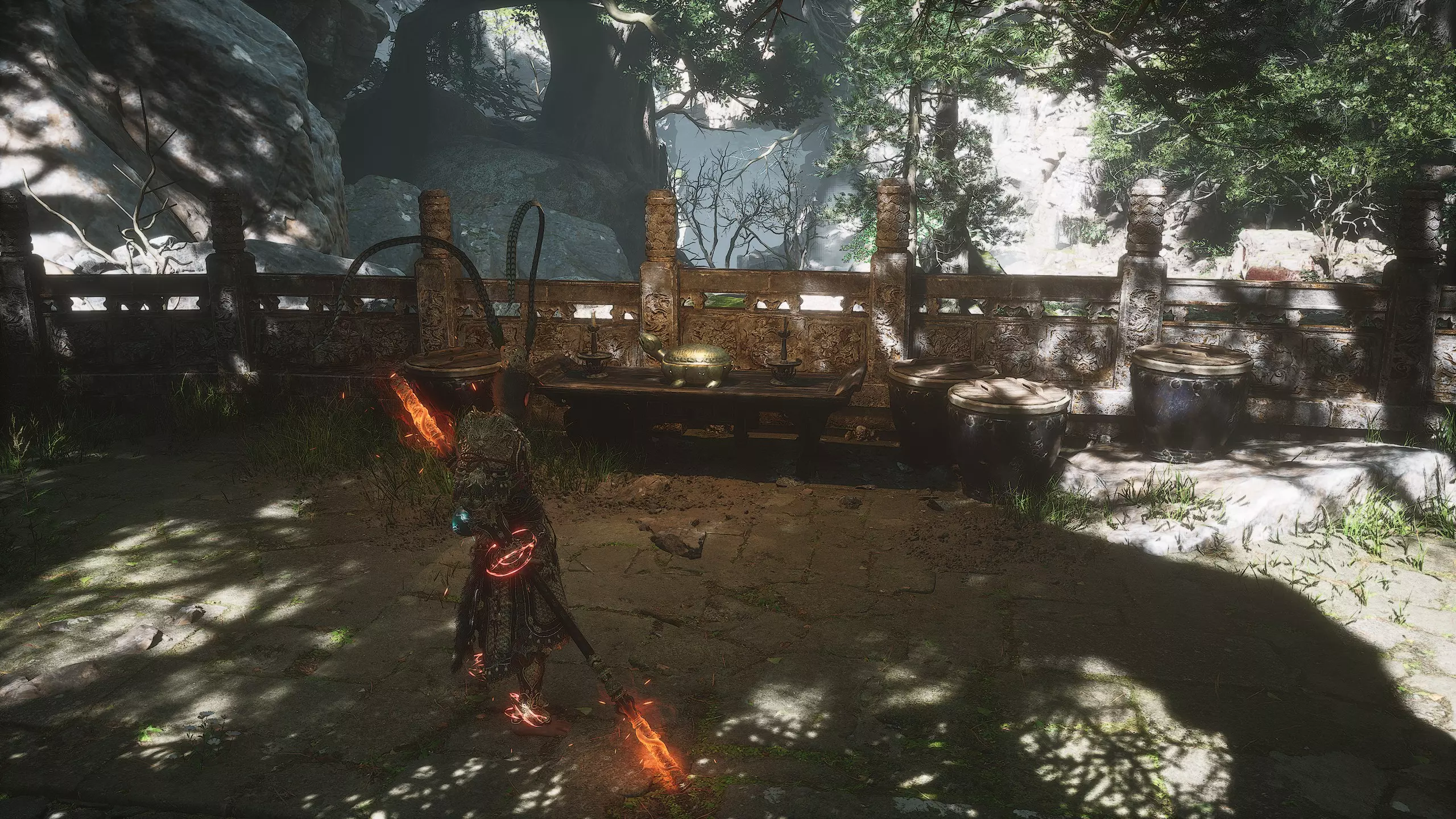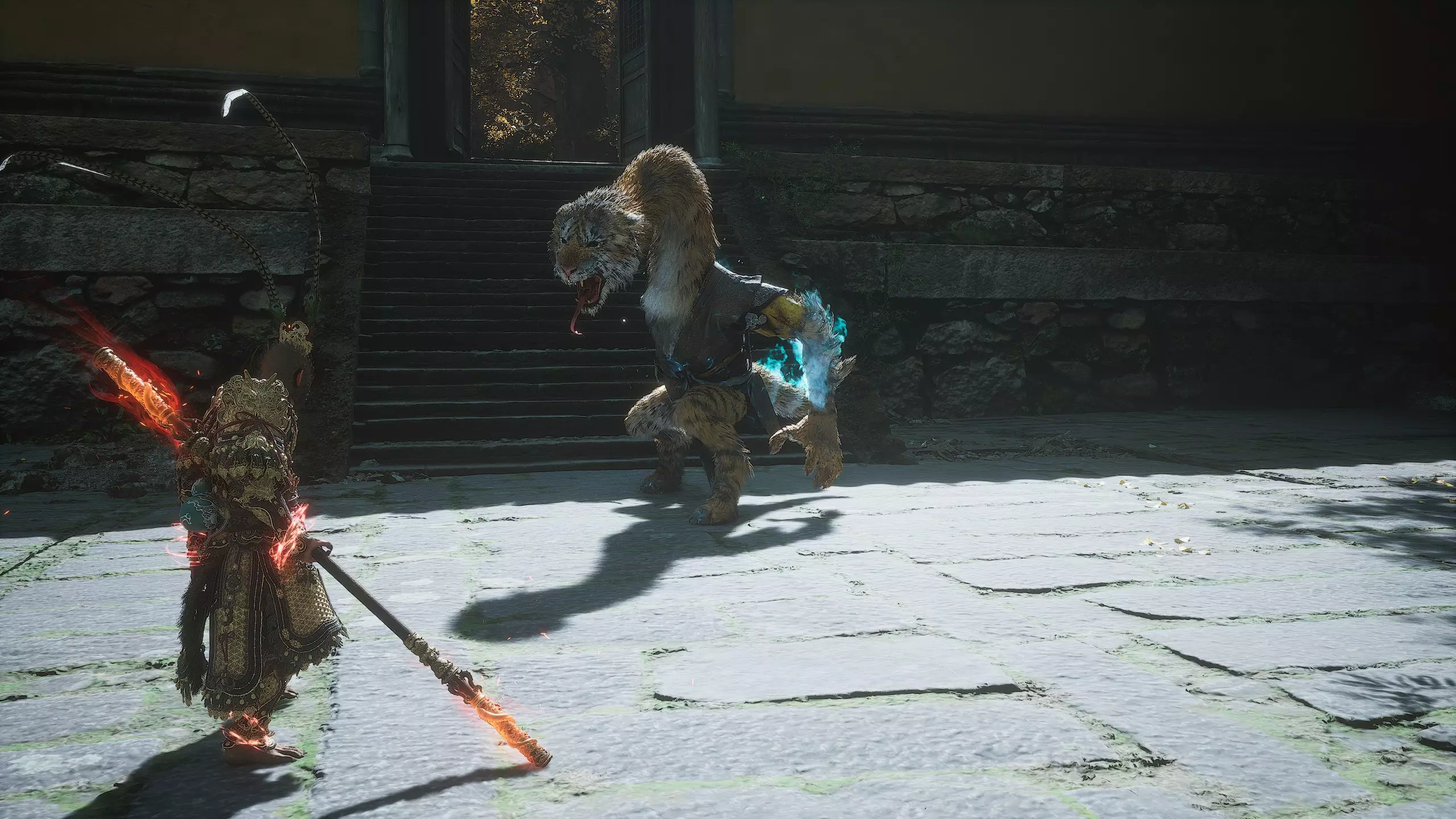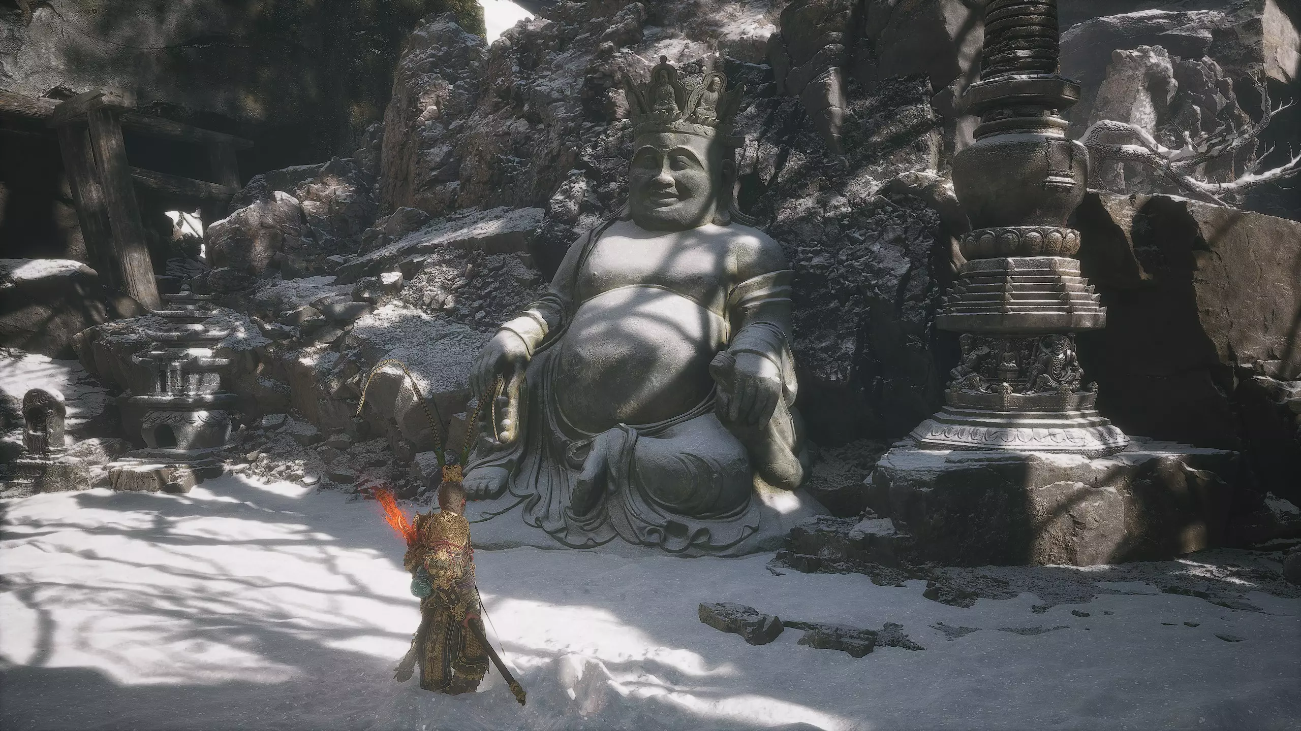 第二章 - 黄风岭 偷心虎之祠 走出洞穴,开启“祠庙入口”祭坛,沿台阶向上。在进入竞技场前左转,找到冥想点[5/24] - “偷心虎祠雕塑”