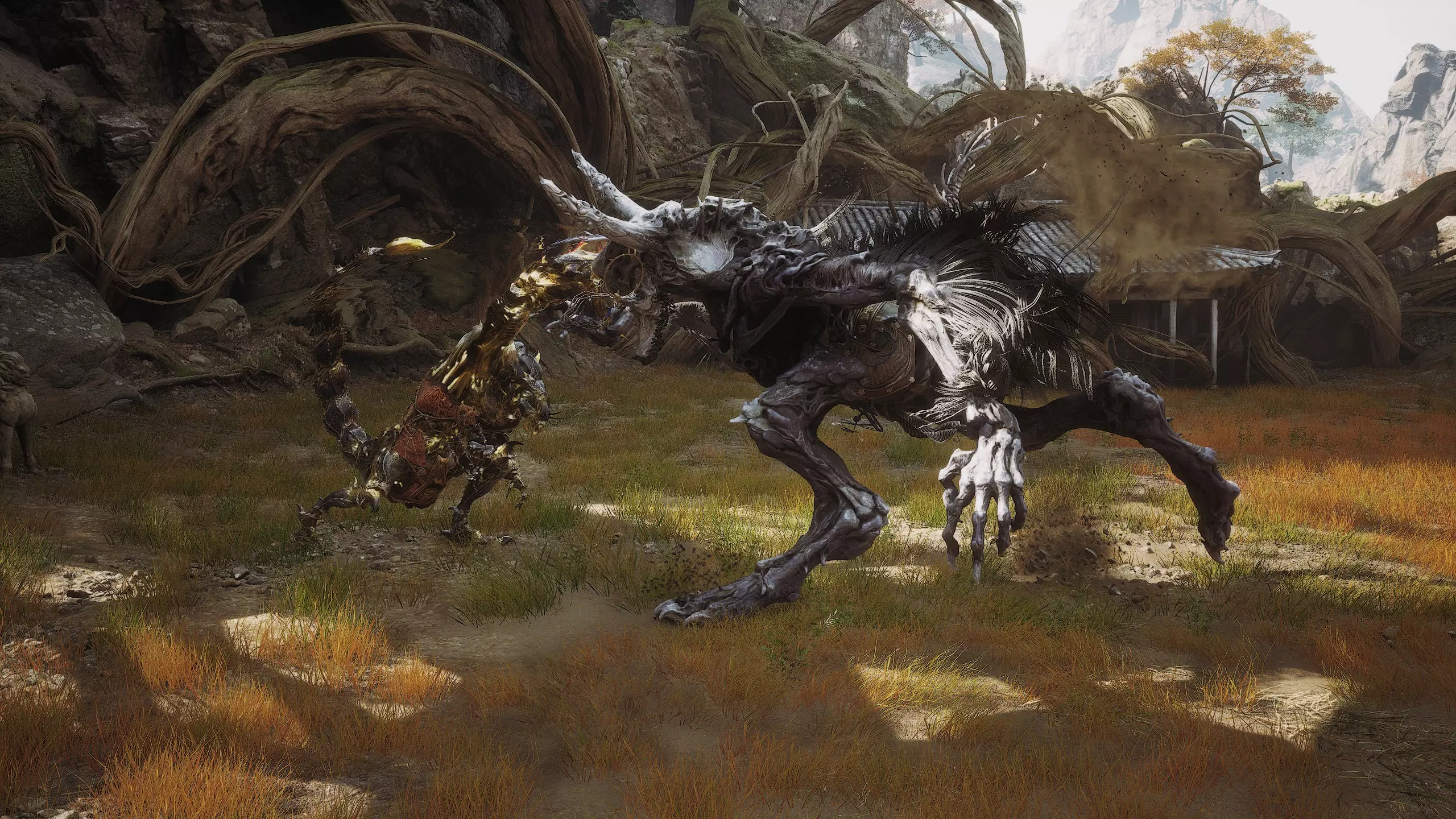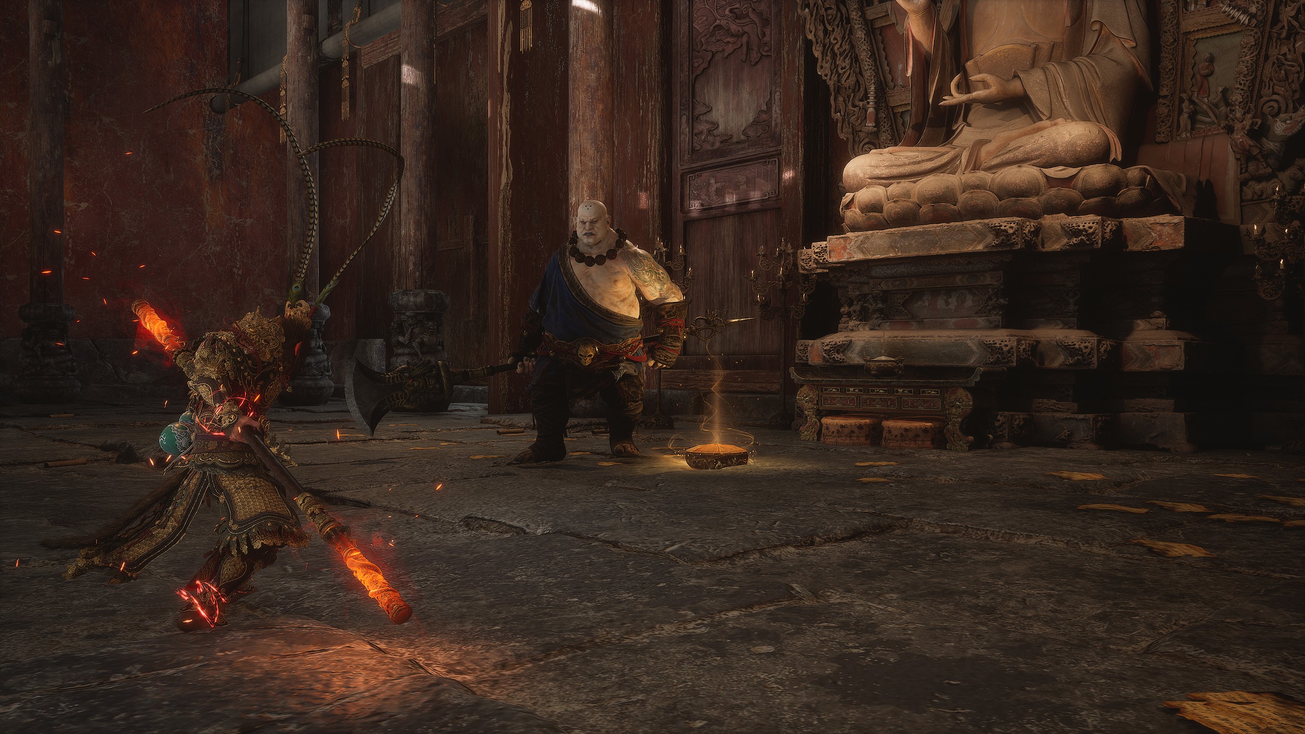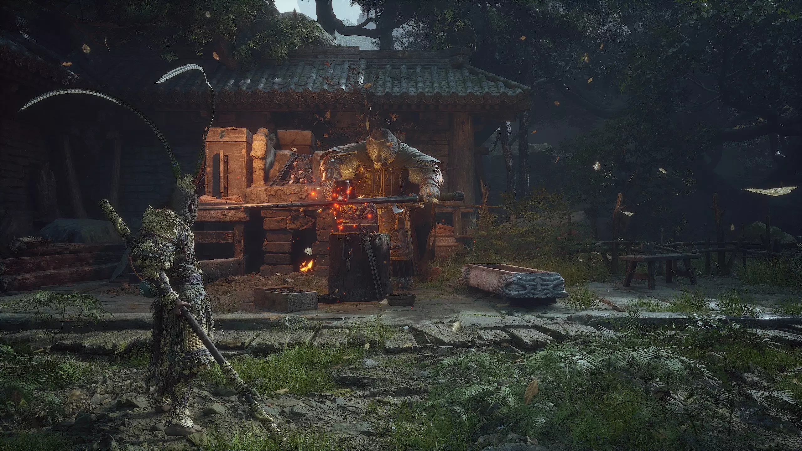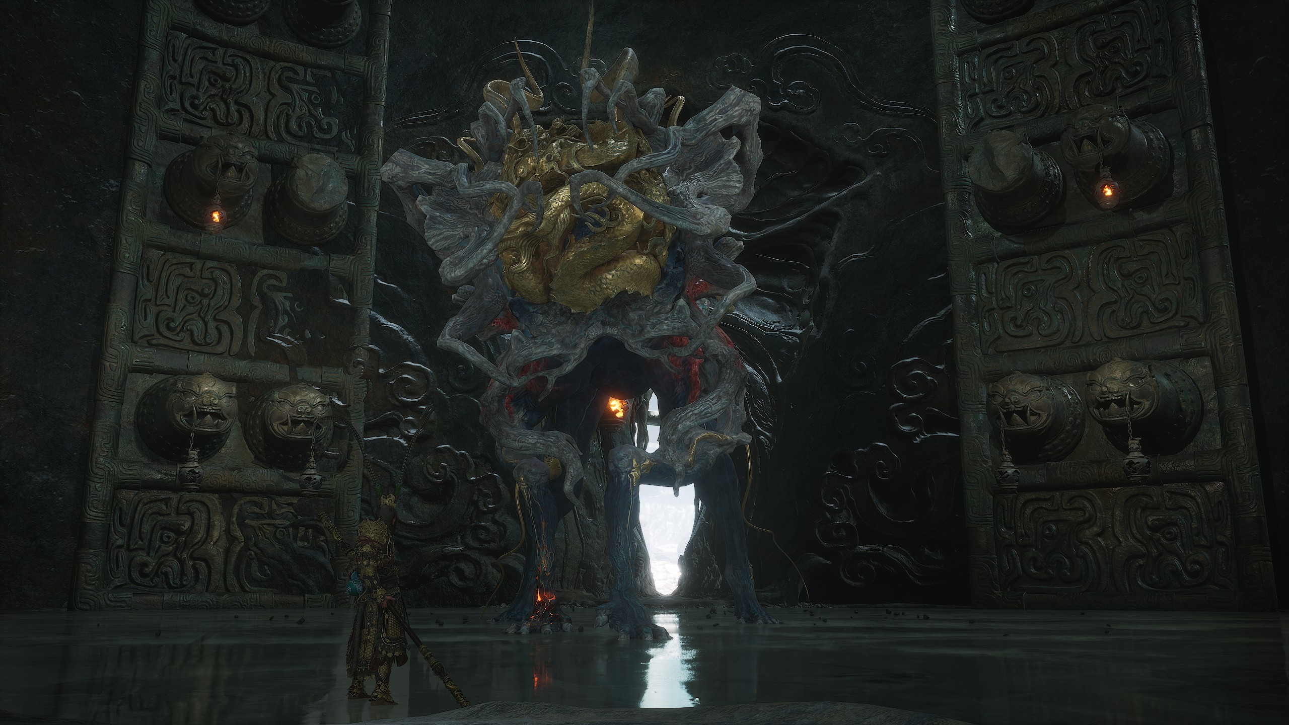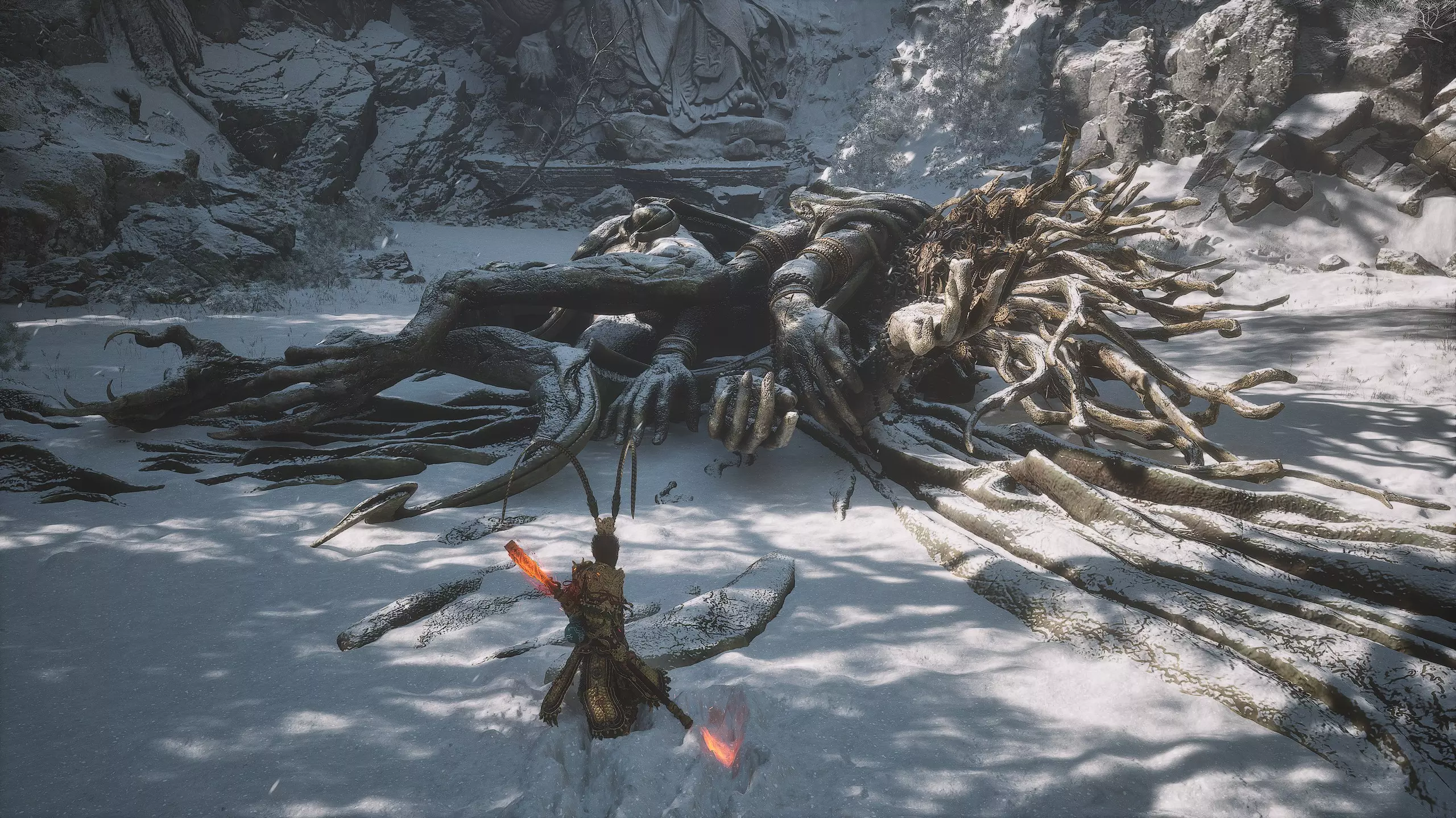 第二章 - 黄风岭 偷心虎之祠 走出洞穴,开启“祠庙入口”祭坛,沿台阶向上。在进入竞技场前左转,找到冥想点[5/24] - “偷心虎祠雕塑”