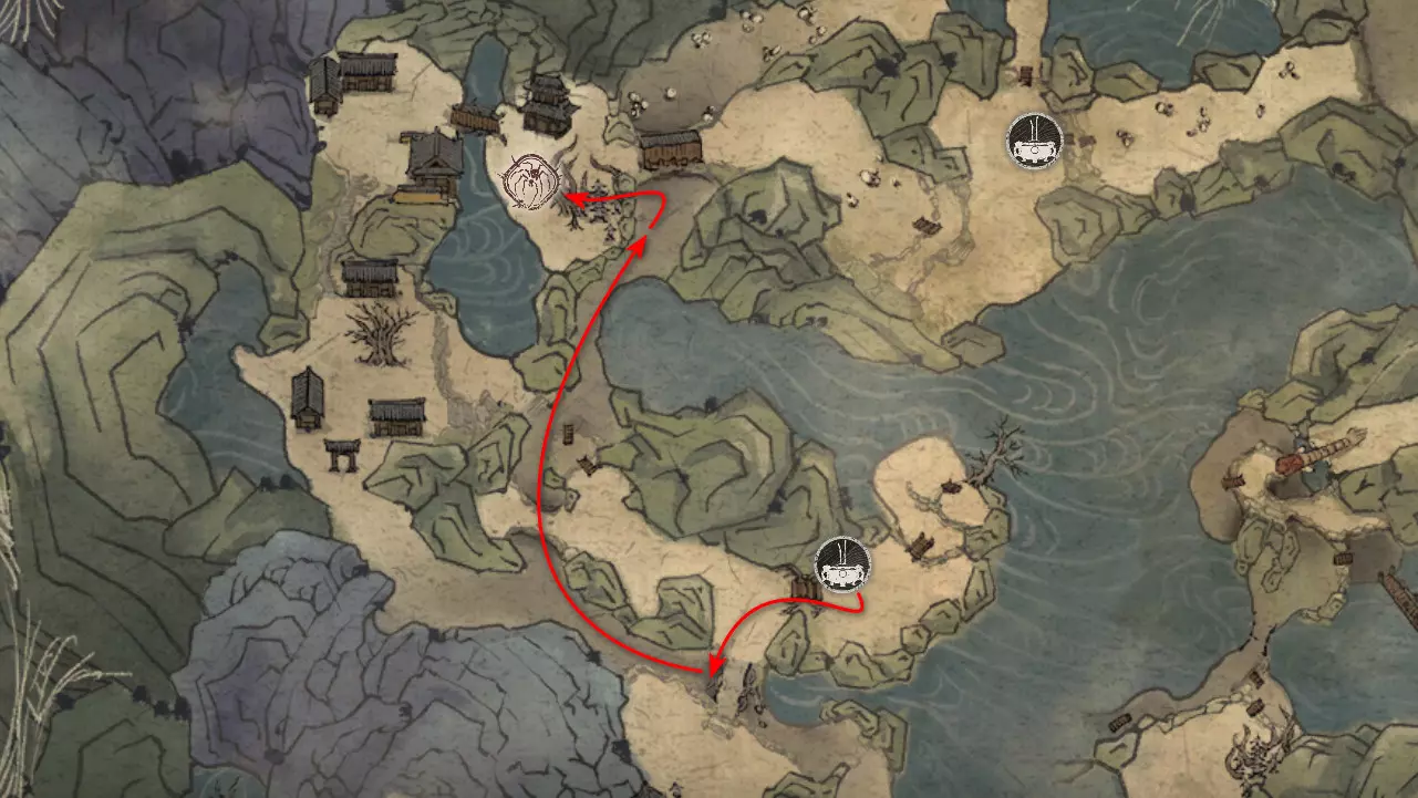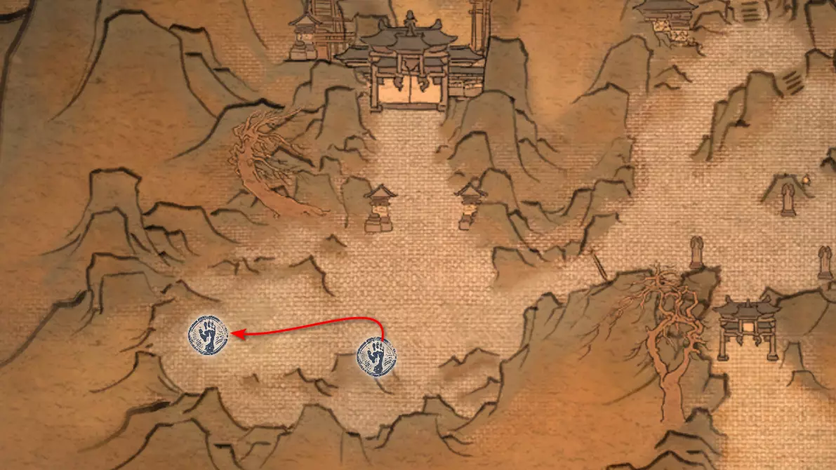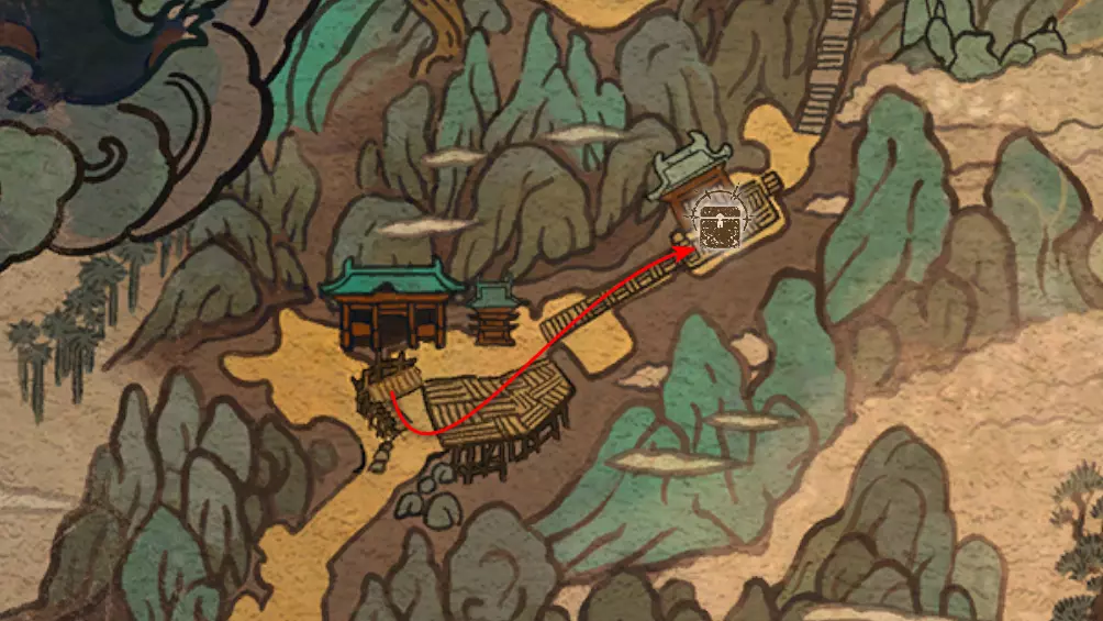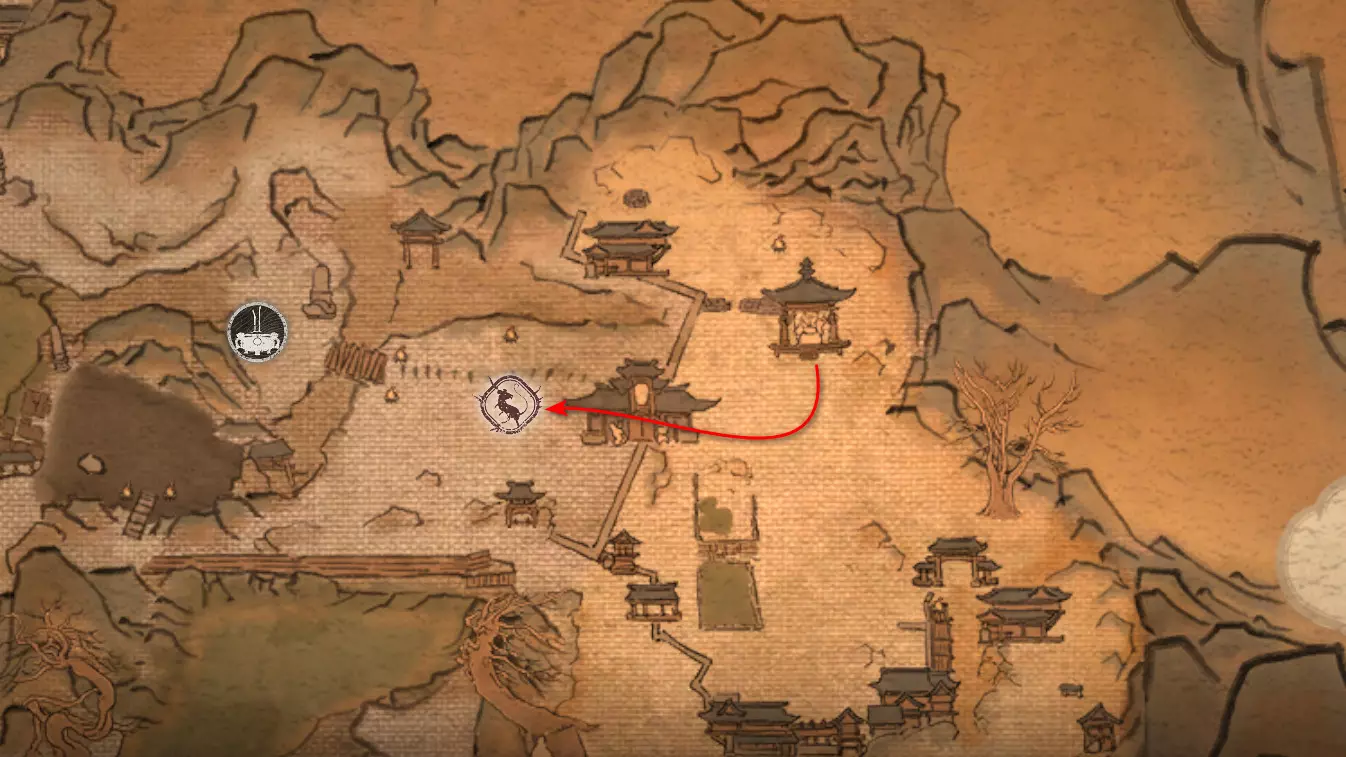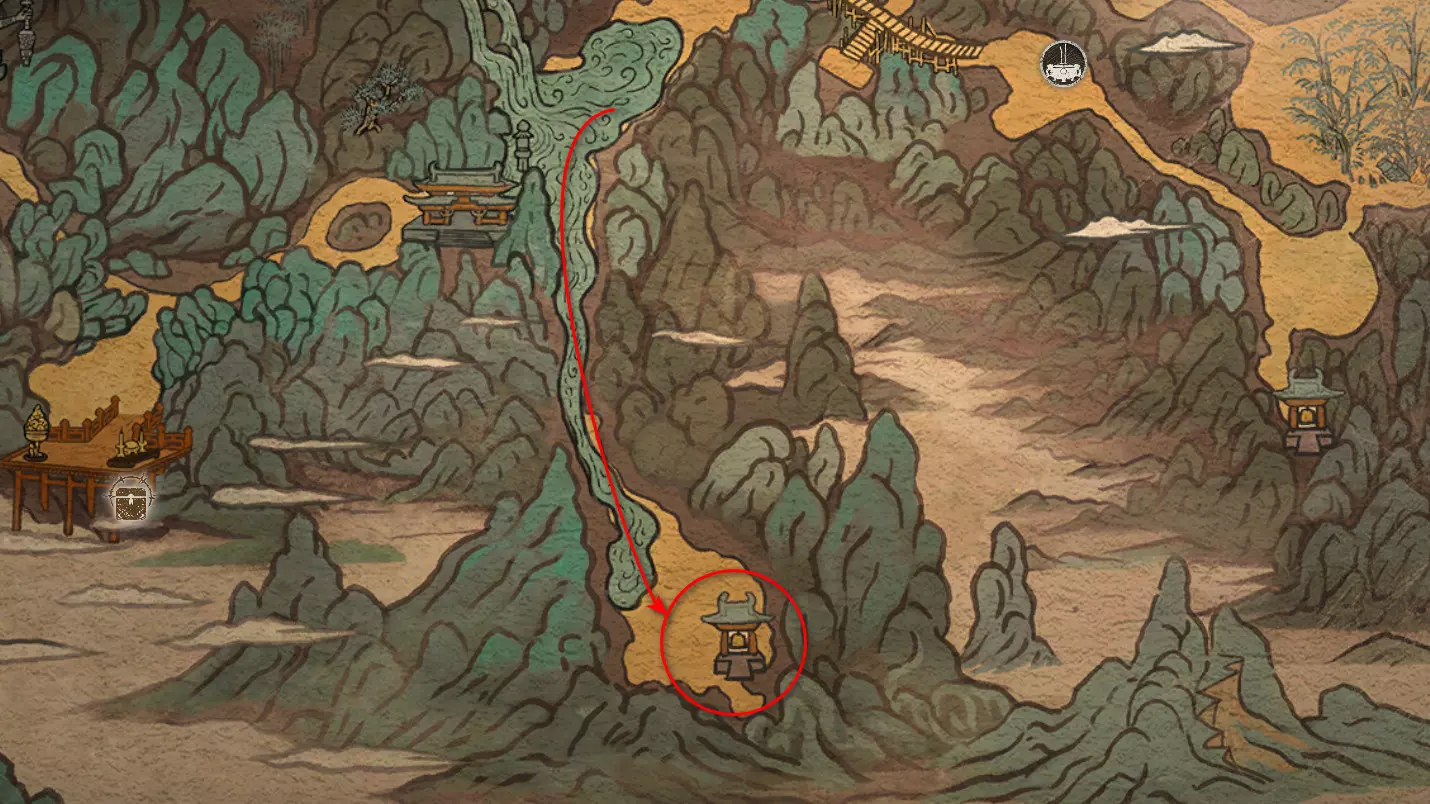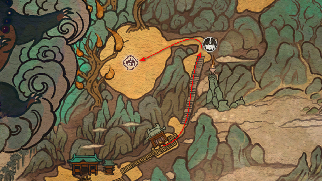 胜利后获得: 配方【1/14】-“辟邪丹药” 沿着木质结构向上攀爬,在顶部会遇到一只狐狸。这个角色是“ Shui Dog”。与他对话后,他会要求归还我们已经拿到的配方以及青蛙 boss。直接交给他,就能获得在祭坛制作药水的能力。 在附近开启“入村祭坛”。购买“烈风崖”地图