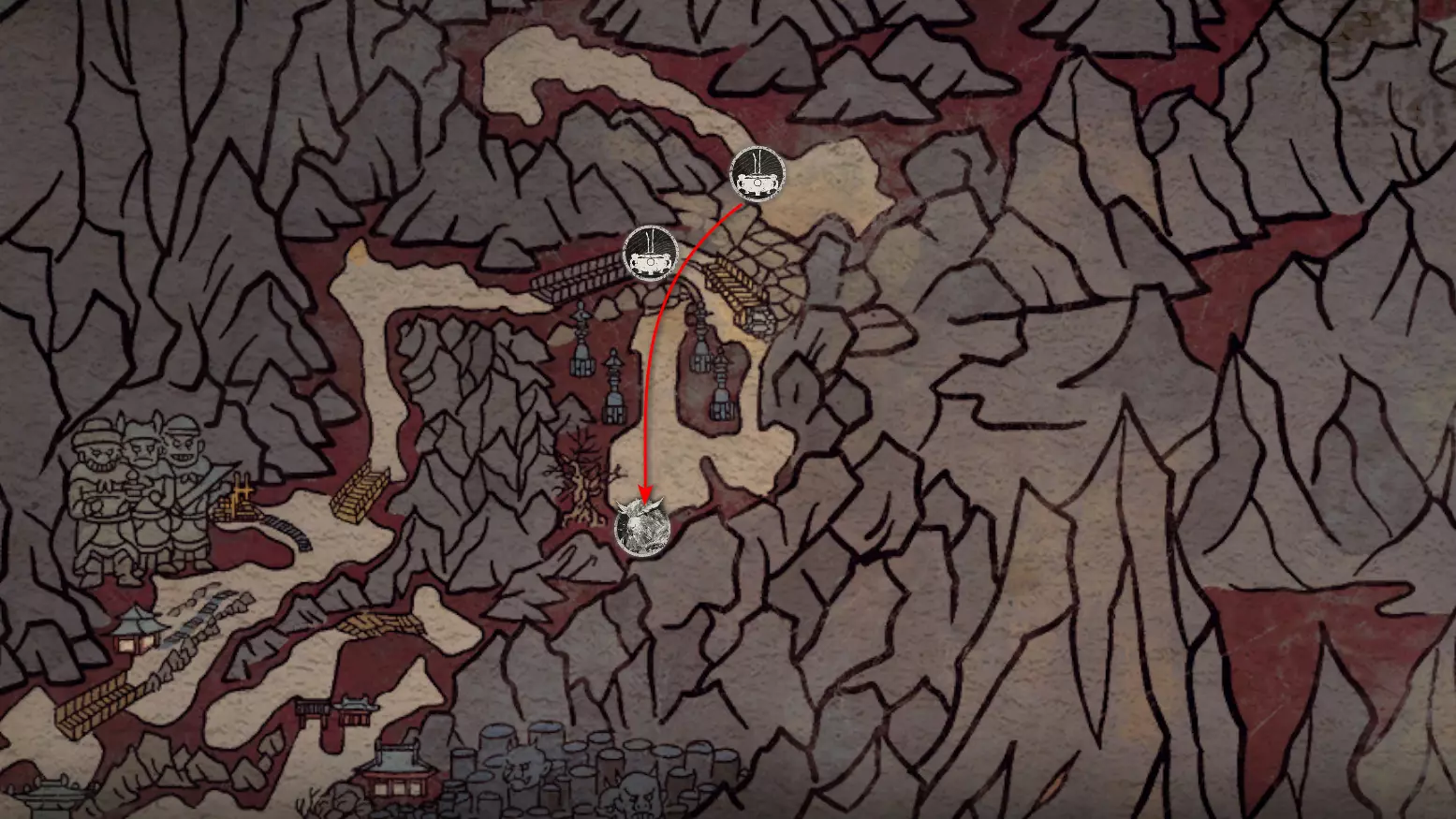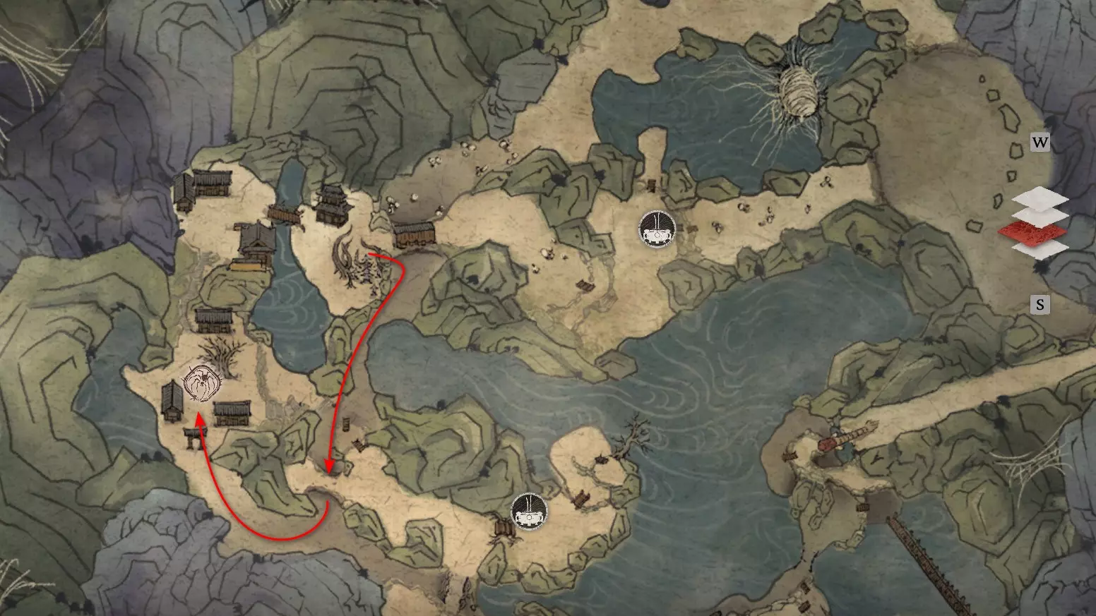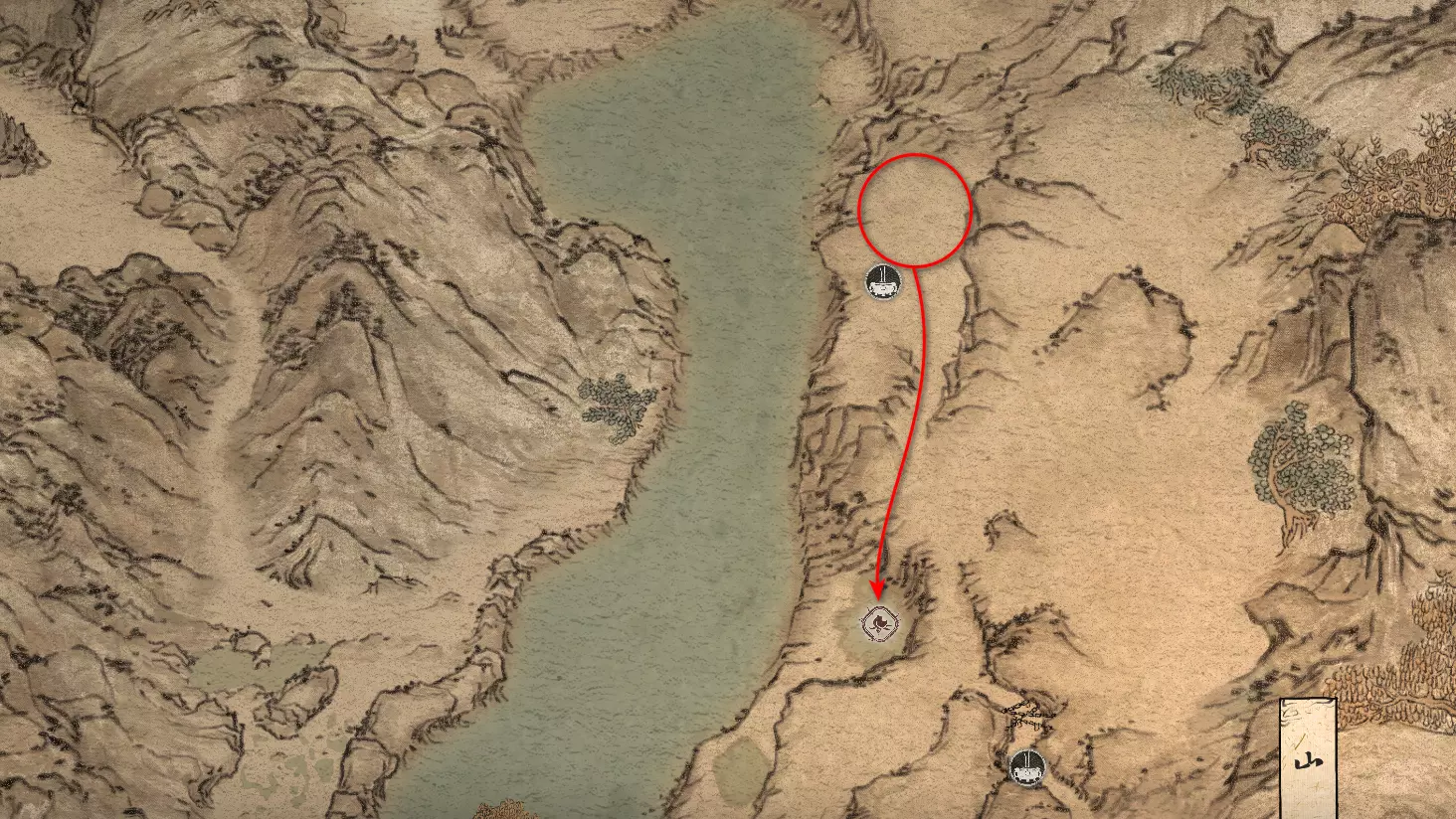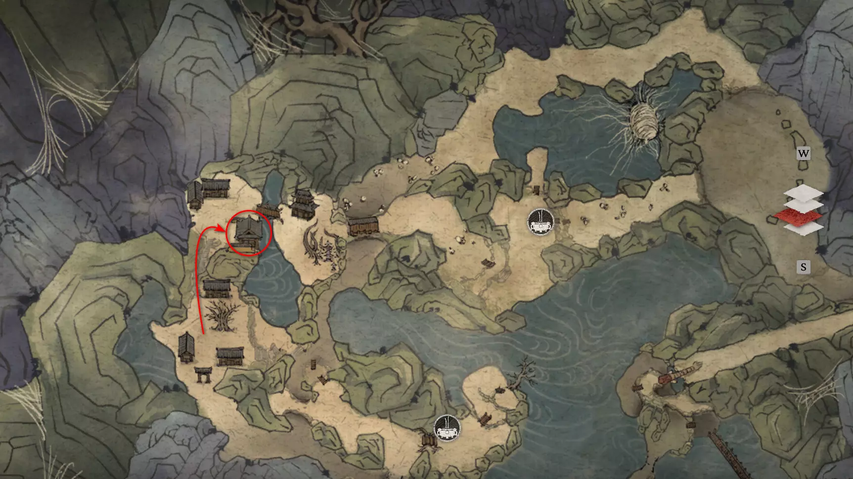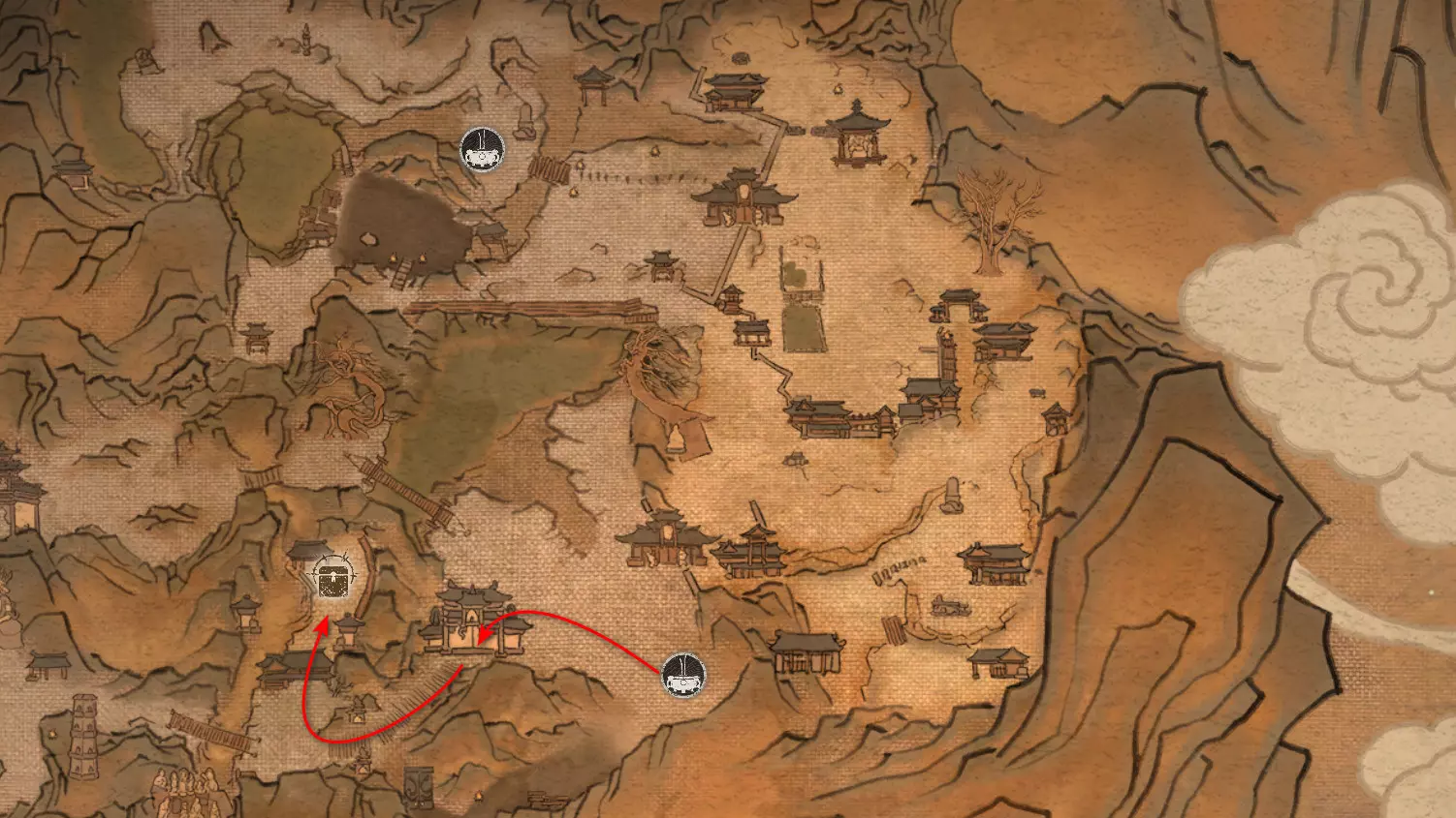 胜利后获得: 配方【1/14】-“辟邪丹药” 沿着木质结构向上攀爬,在顶部会遇到一只狐狸。这个角色是“ Shui Dog”。与他对话后,他会要求归还我们已经拿到的配方以及青蛙 boss。直接交给他,就能获得在祭坛制作药水的能力。 在附近开启“入村祭坛”。购买“烈风崖”地图