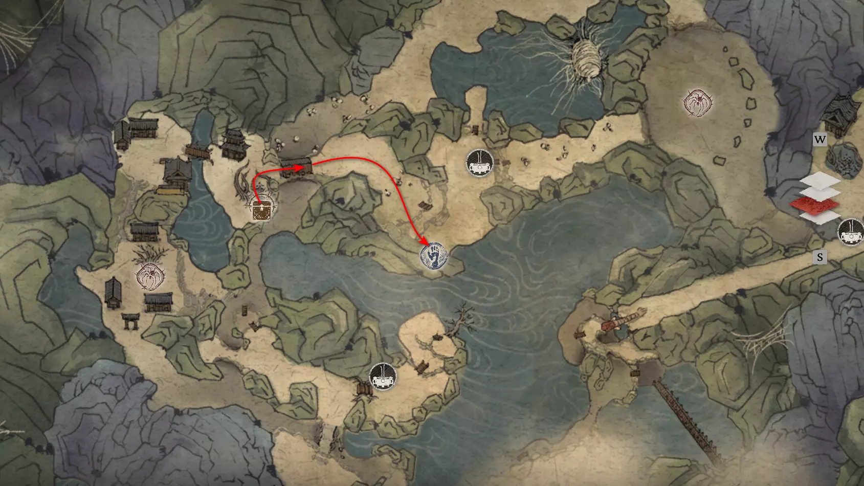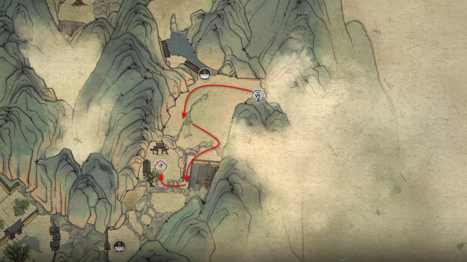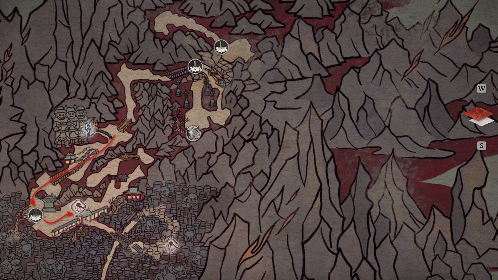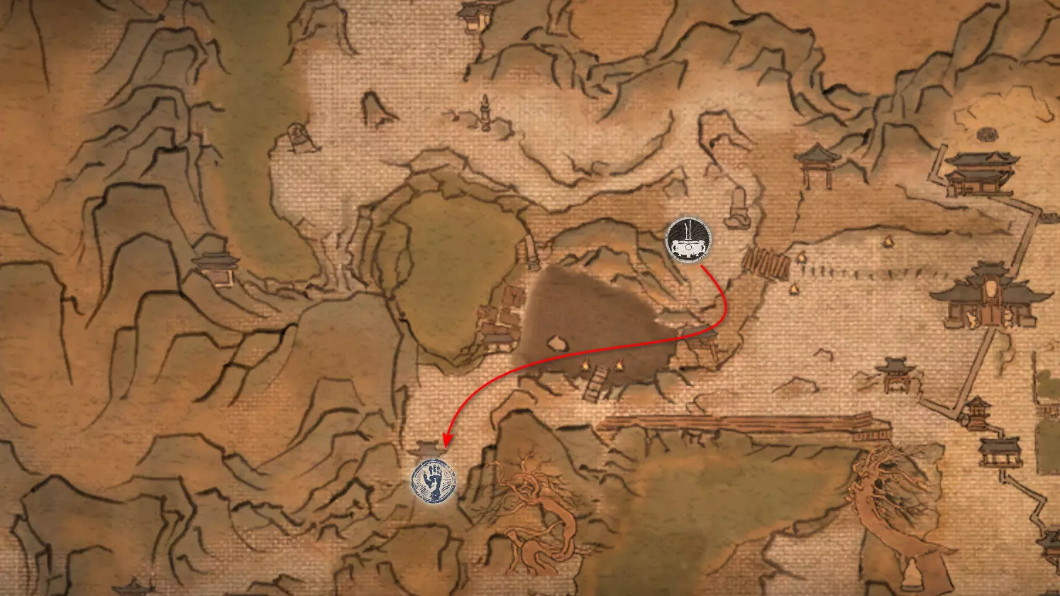 胜利后获得: 配方【1/14】-“辟邪丹药” 沿着木质结构向上攀爬,在顶部会遇到一只狐狸。这个角色是“ Shui Dog”。与他对话后,他会要求归还我们已经拿到的配方以及青蛙 boss。直接交给他,就能获得在祭坛制作药水的能力。 在附近开启“入村祭坛”。购买“烈风崖”地图