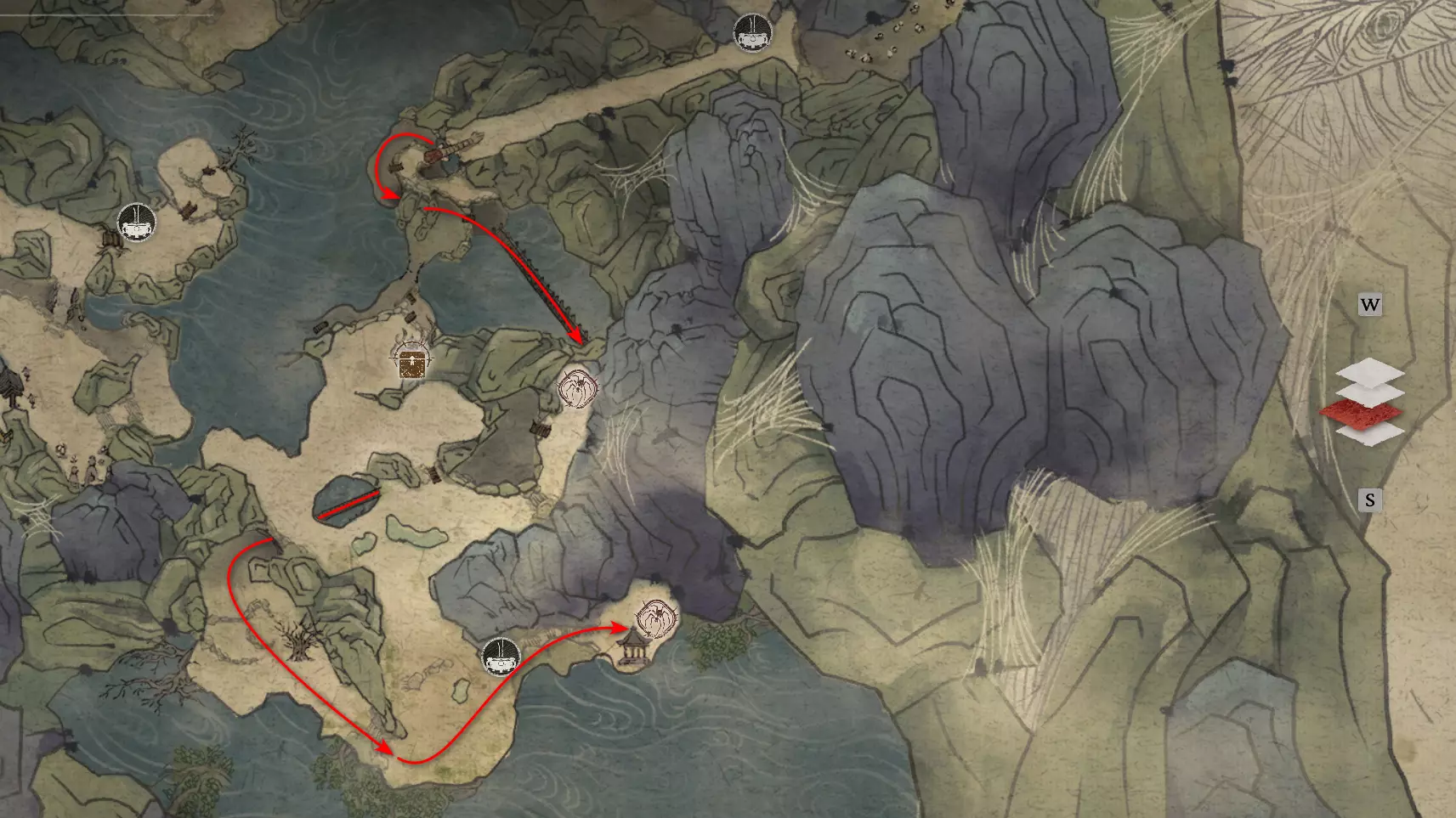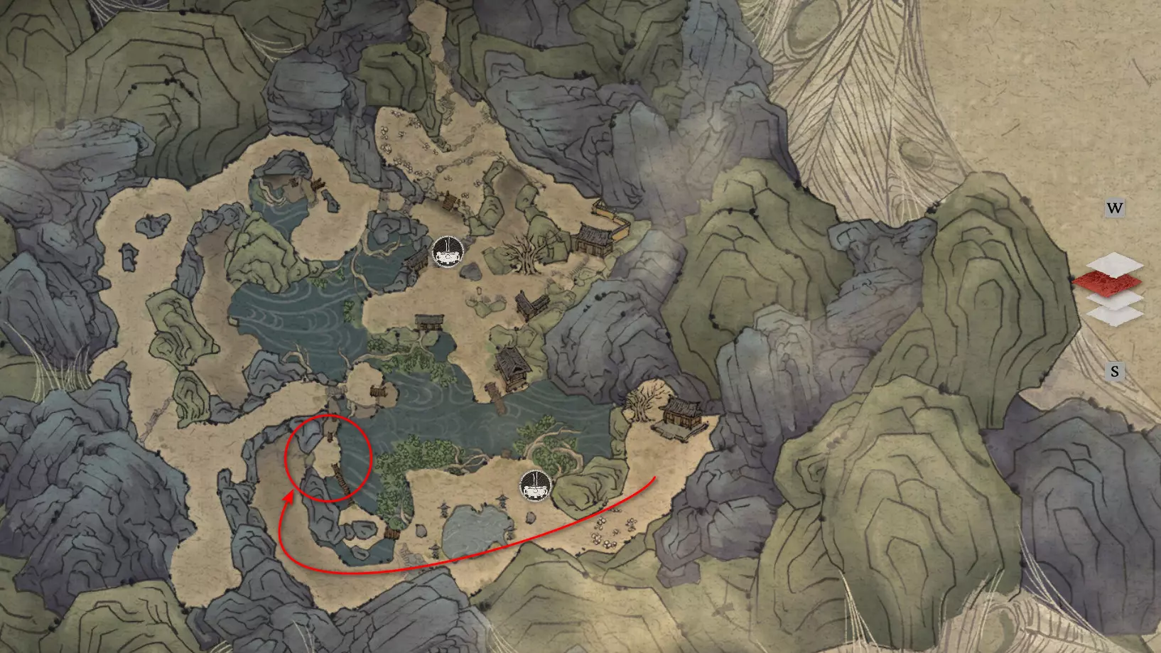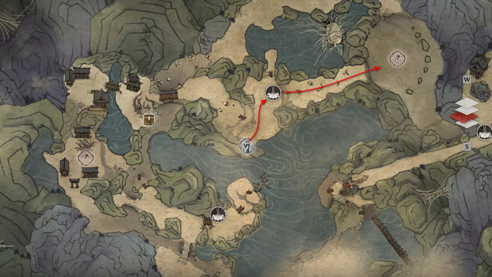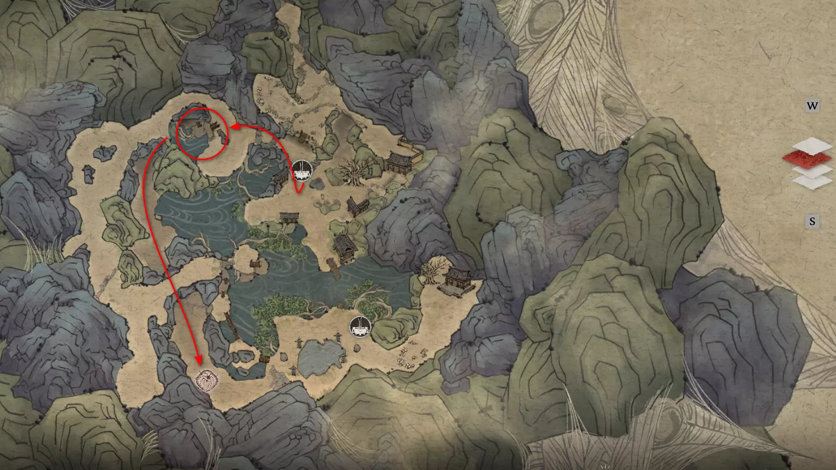 胜利后获得: 配方【1/14】-“辟邪丹药” 沿着木质结构向上攀爬,在顶部会遇到一只狐狸。这个角色是“ Shui Dog”。与他对话后,他会要求归还我们已经拿到的配方以及青蛙 boss。直接交给他,就能获得在祭坛制作药水的能力。 在附近开启“入村祭坛”。购买“烈风崖”地图