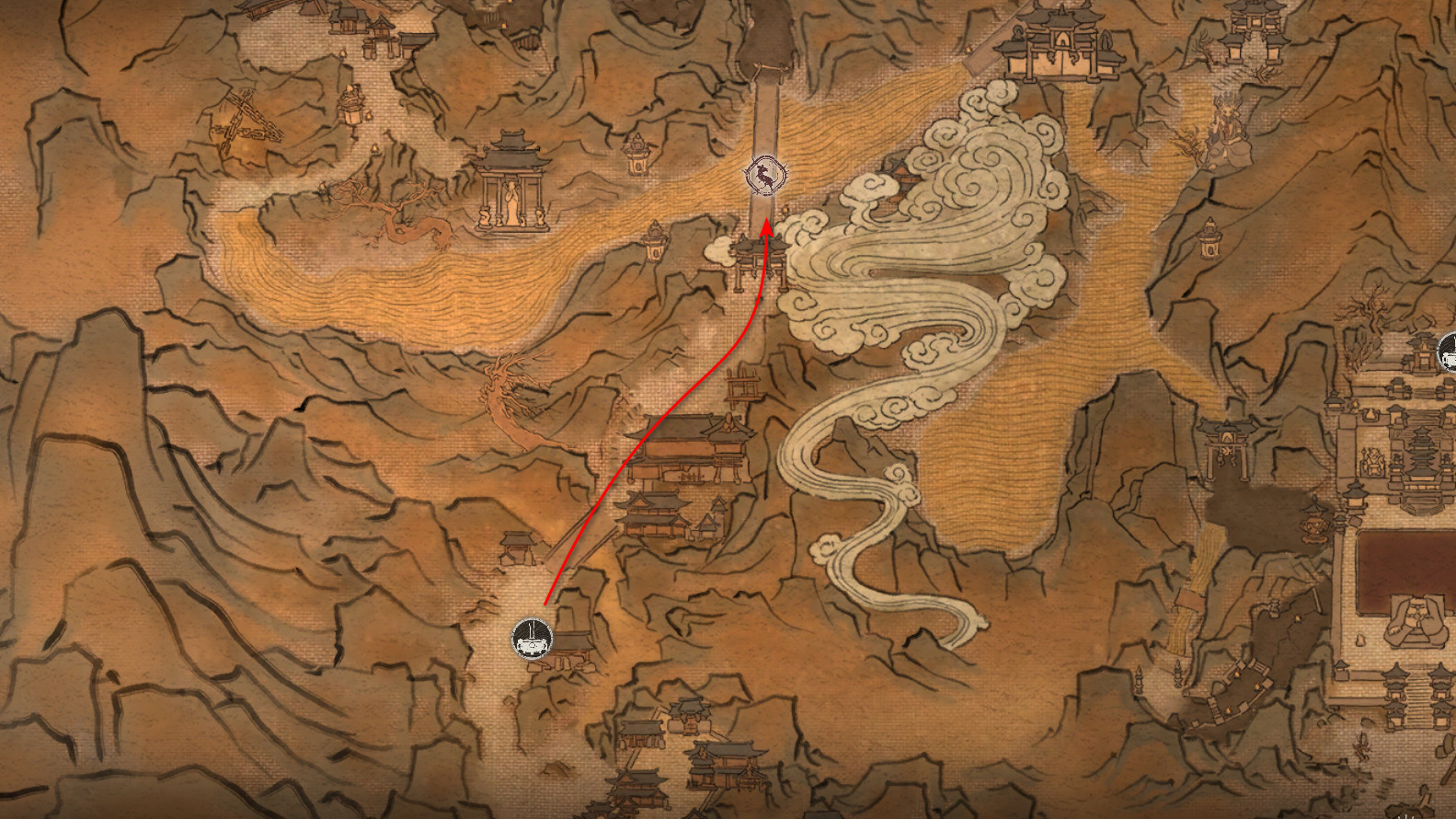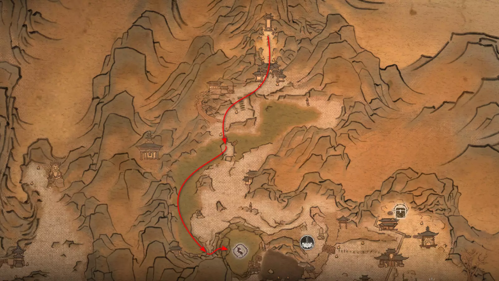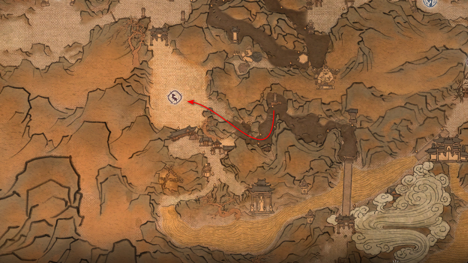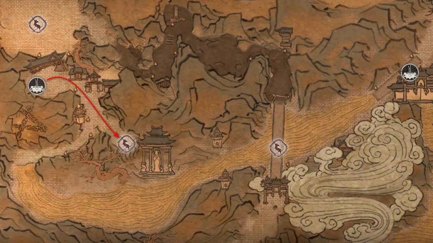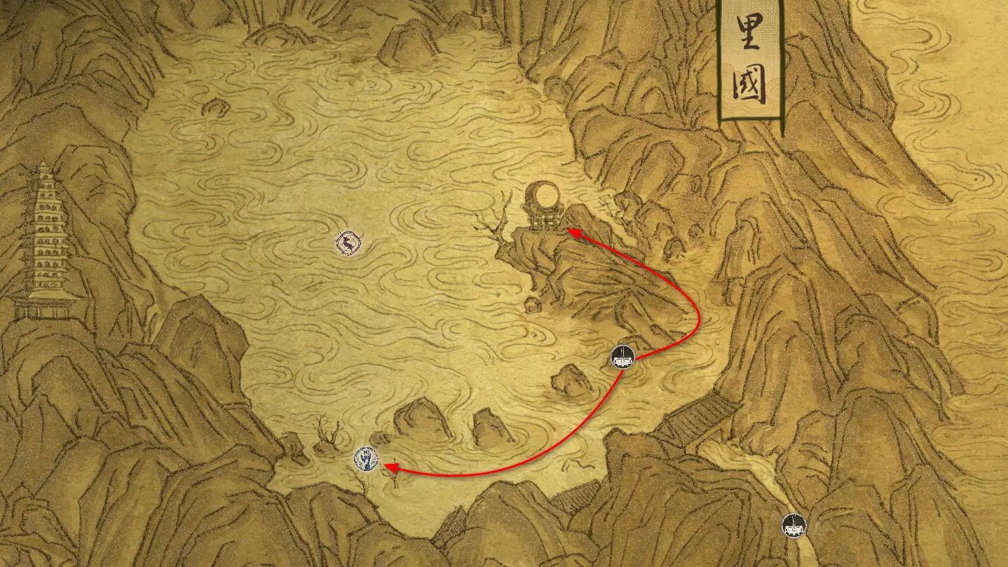 集齐全部套装[17/17]: 凤凰羽金冠 锁子黄金甲 月轮护腕 莲花云履 沿着河流左缘向北飞行。边缘处会坐着隐藏Boss[4/5]——【石猴】。攻击即可开始与他的战斗