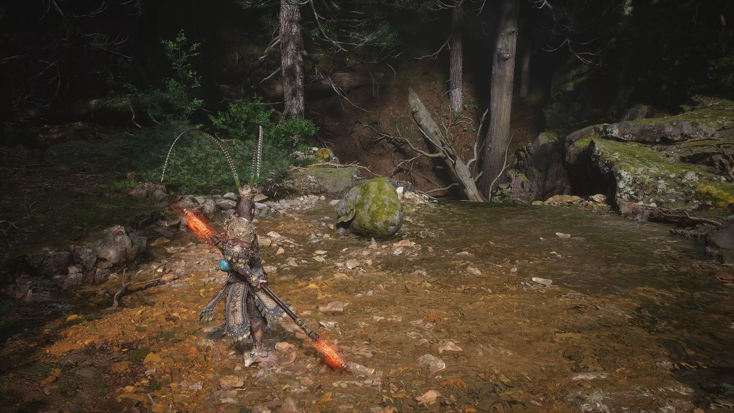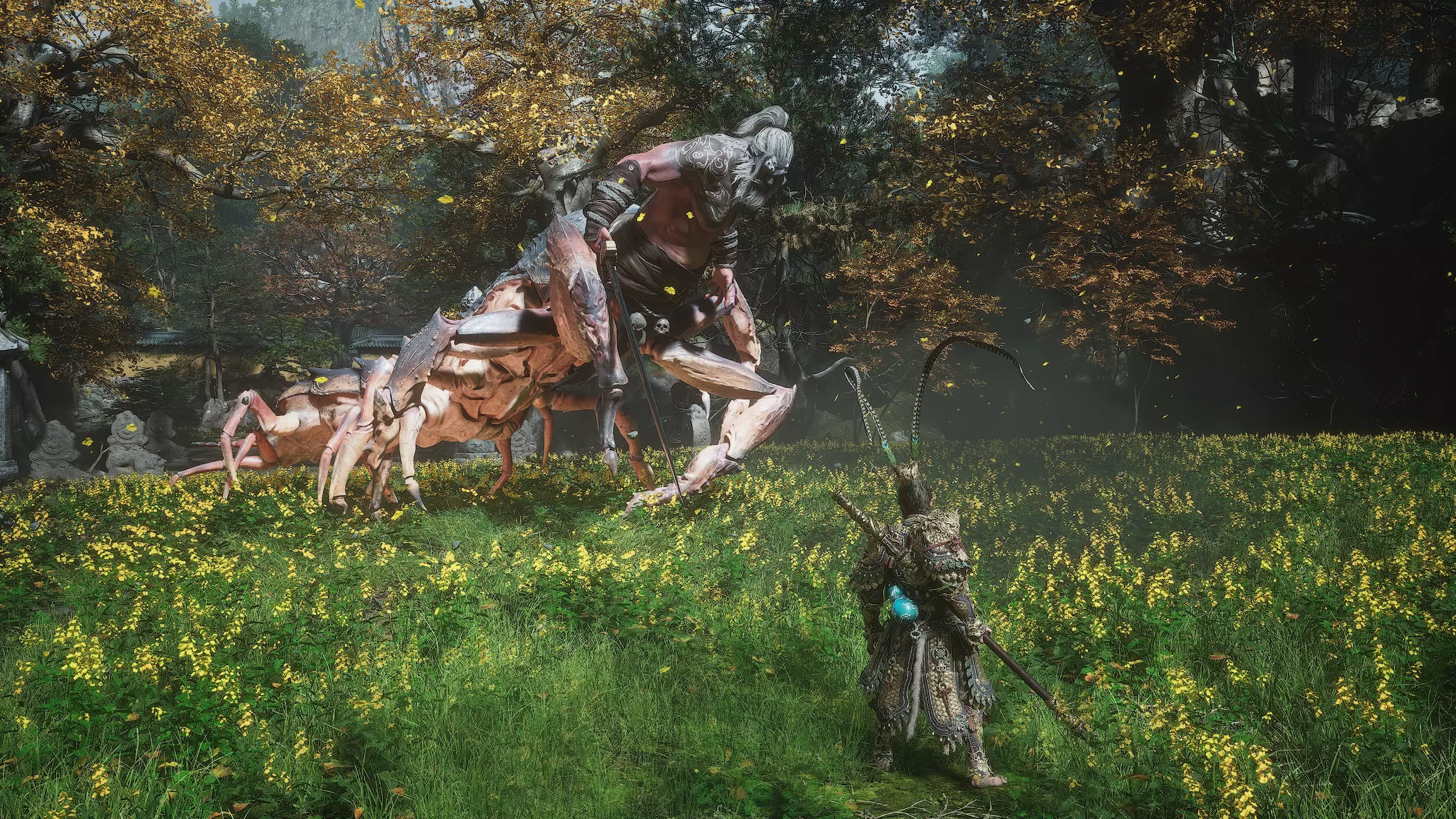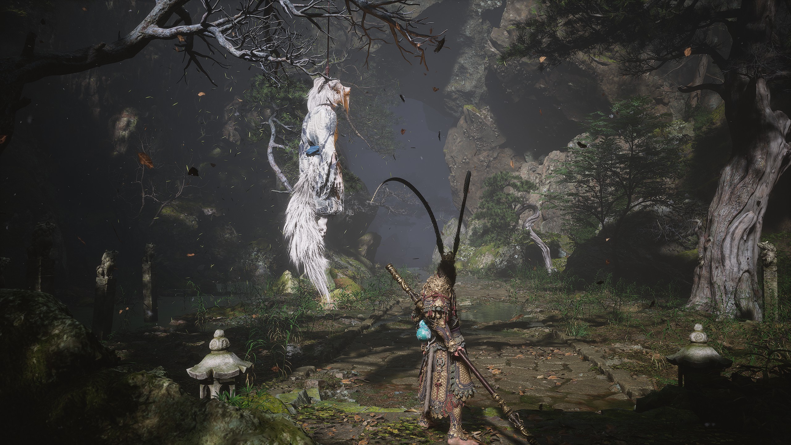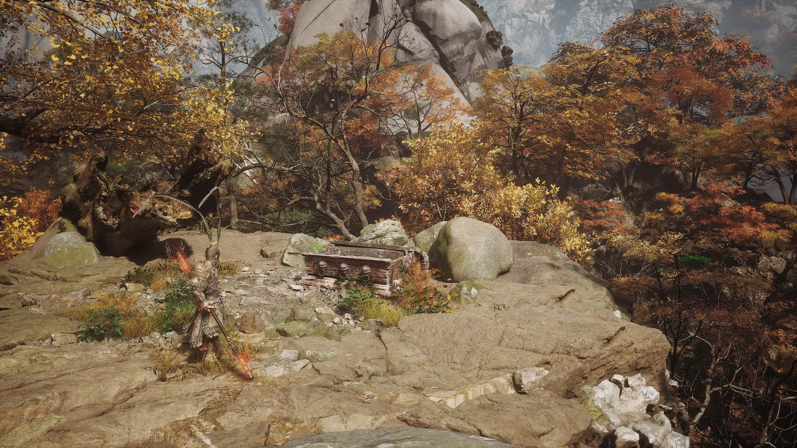 集齐全部套装[17/17]: 凤凰羽金冠 锁子黄金甲 月轮护腕 莲花云履 沿着河流左缘向北飞行。边缘处会坐着隐藏Boss[4/5]——【石猴】。攻击即可开始与他的战斗