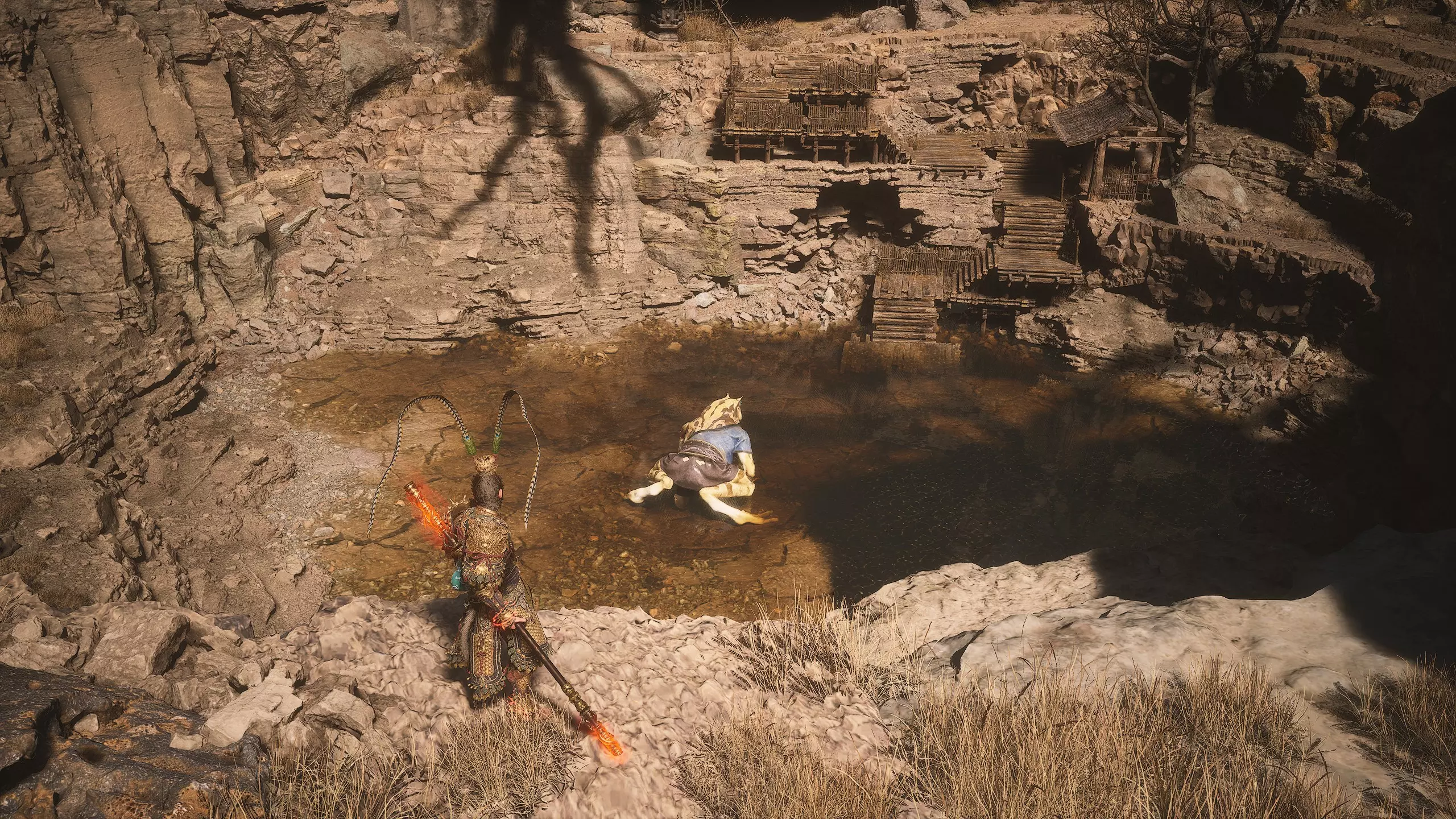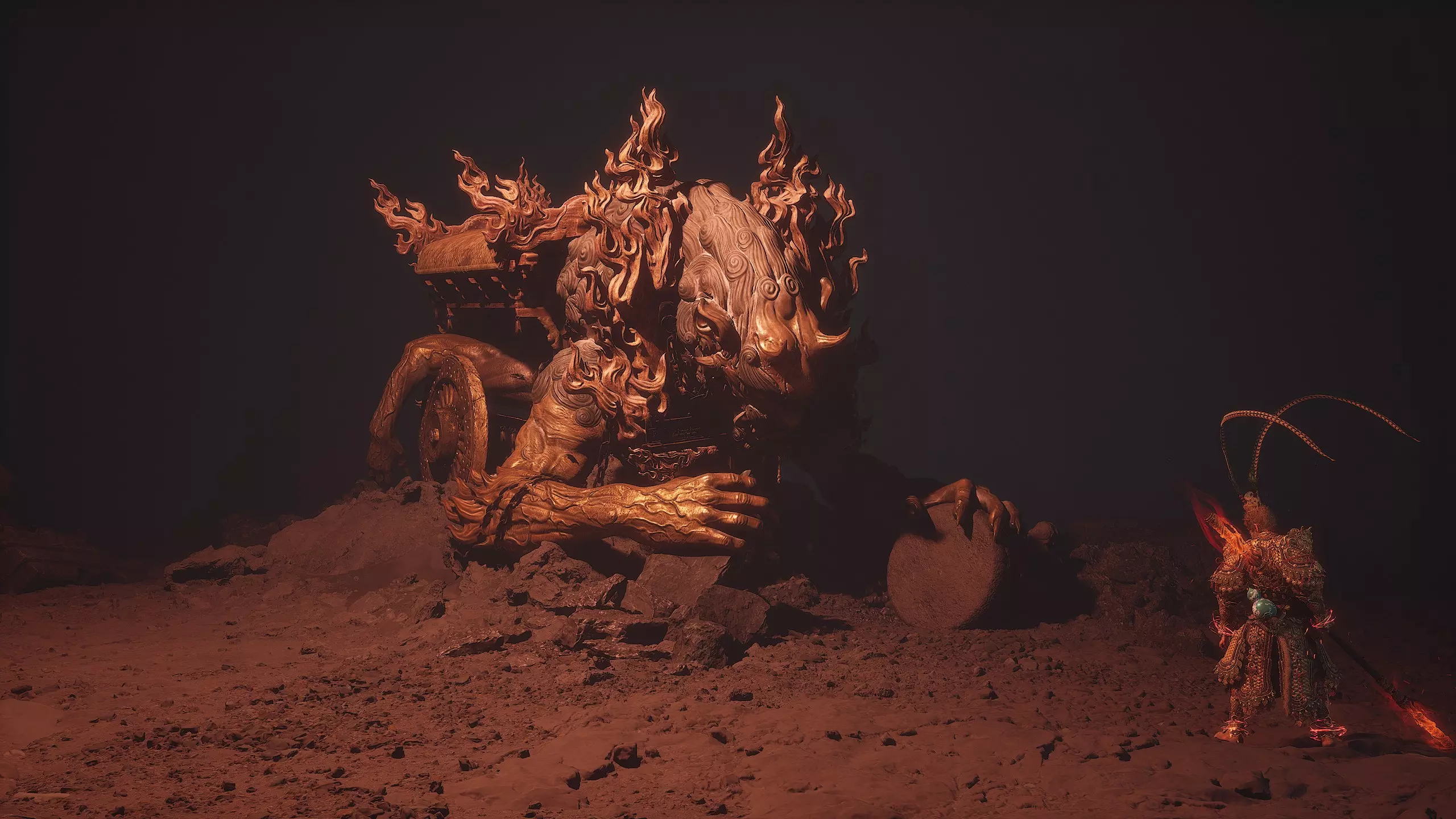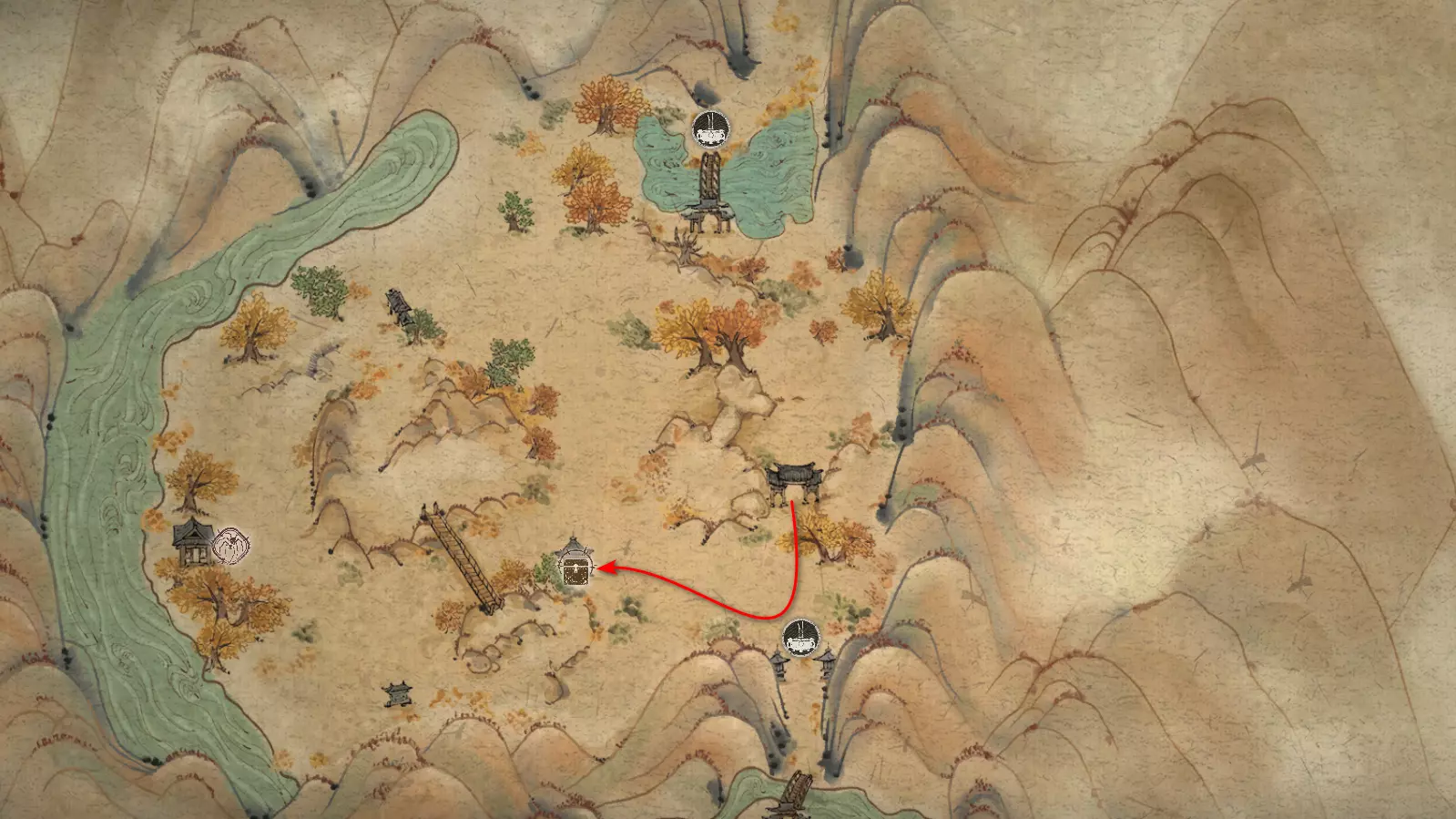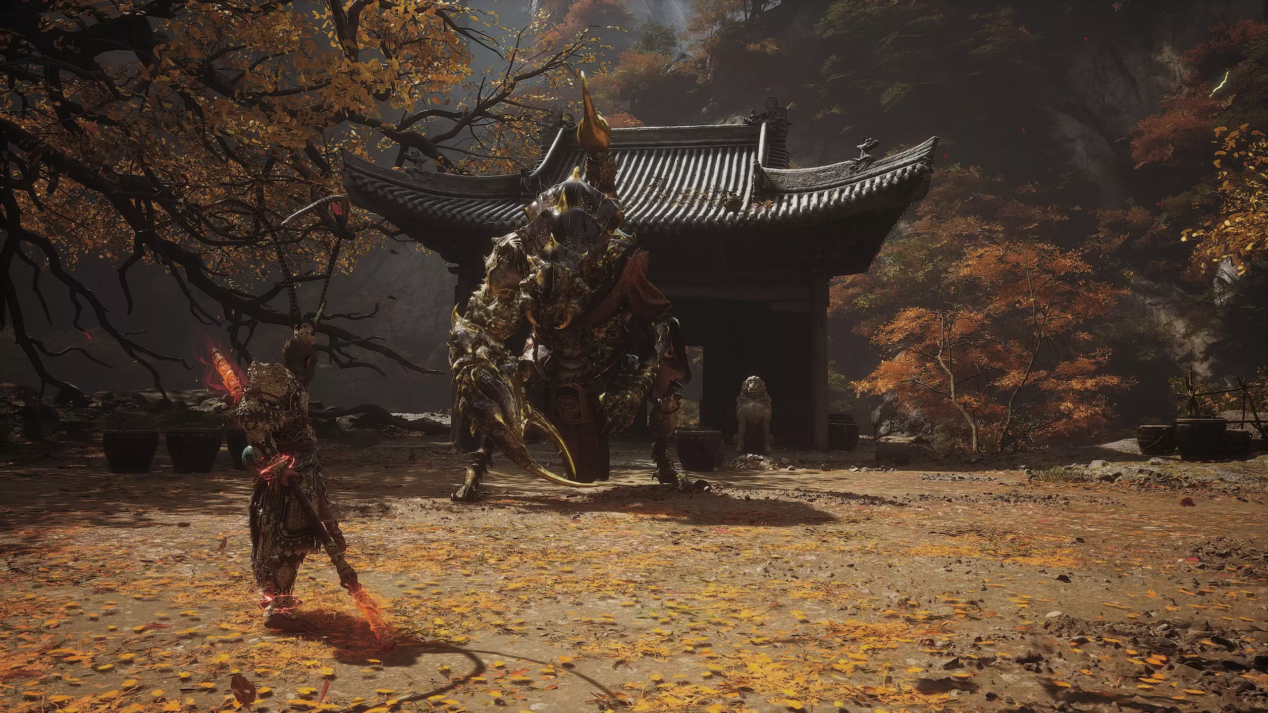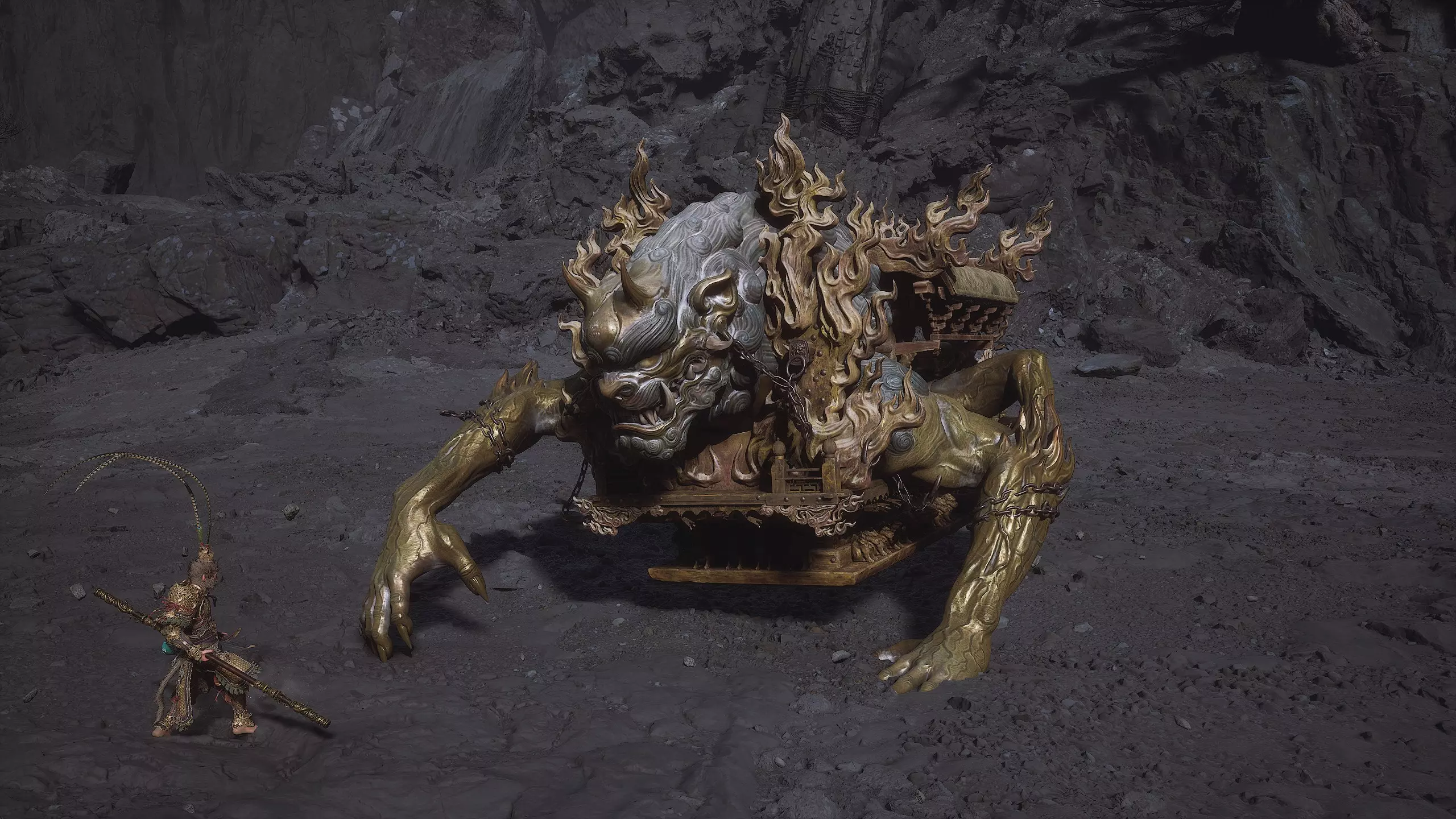 集齐全部套装[17/17]: 凤凰羽金冠 锁子黄金甲 月轮护腕 莲花云履 沿着河流左缘向北飞行。边缘处会坐着隐藏Boss[4/5]——【石猴】。攻击即可开始与他的战斗
