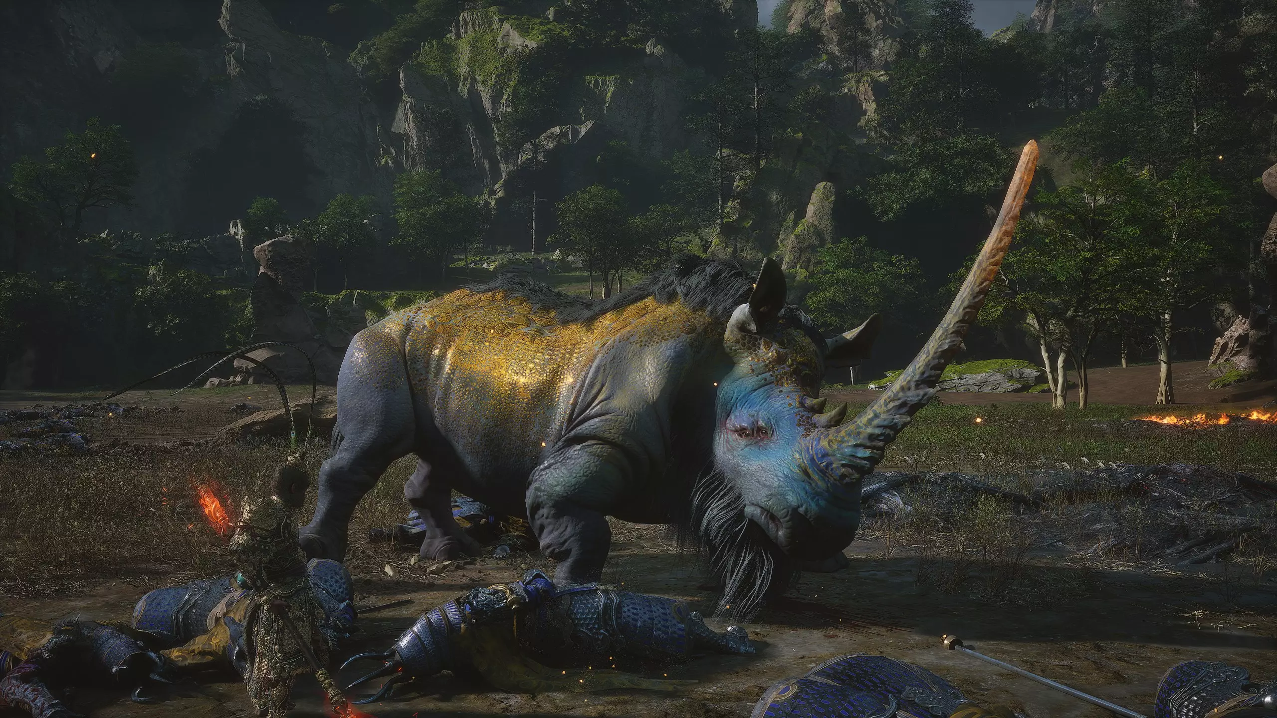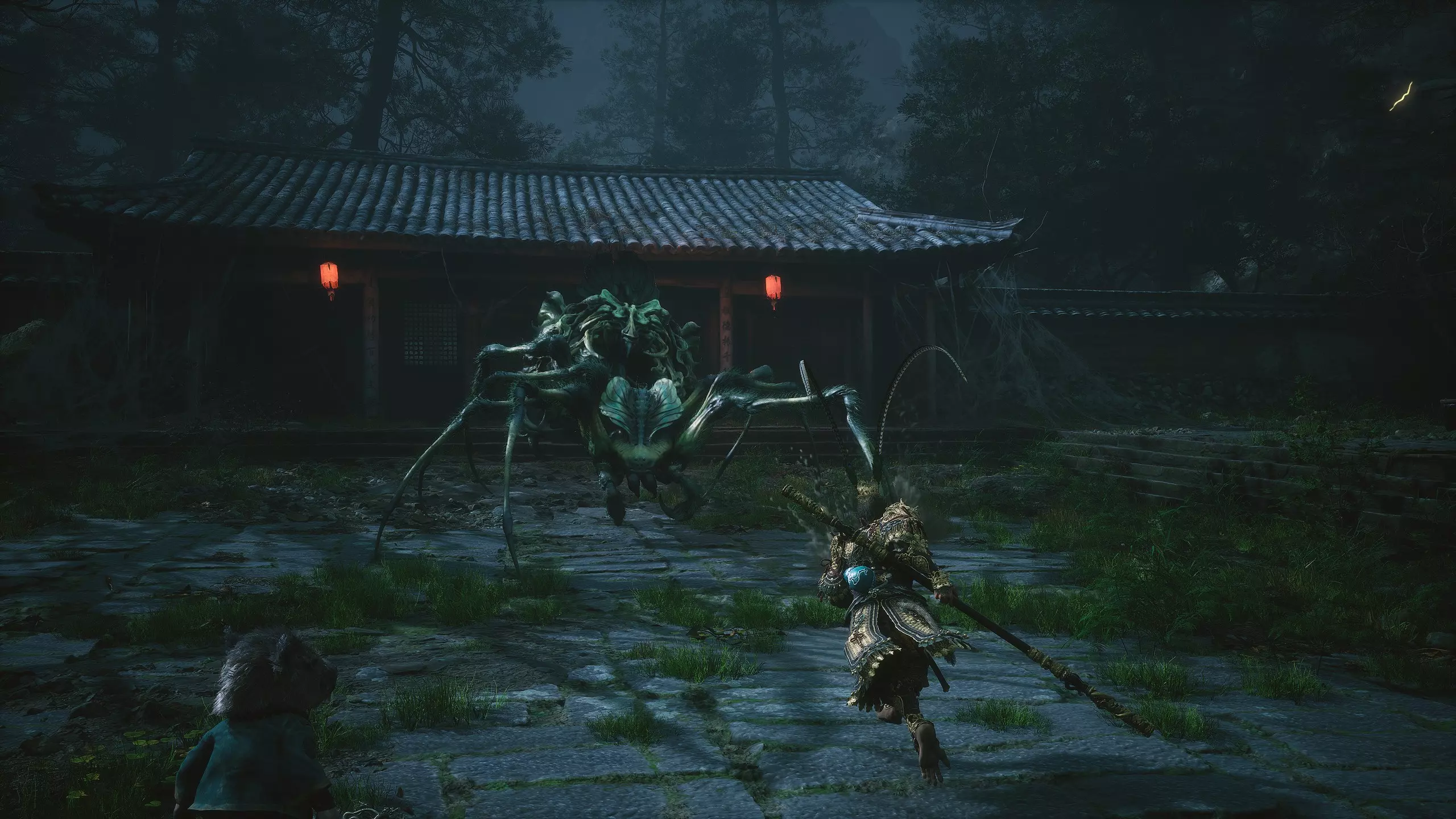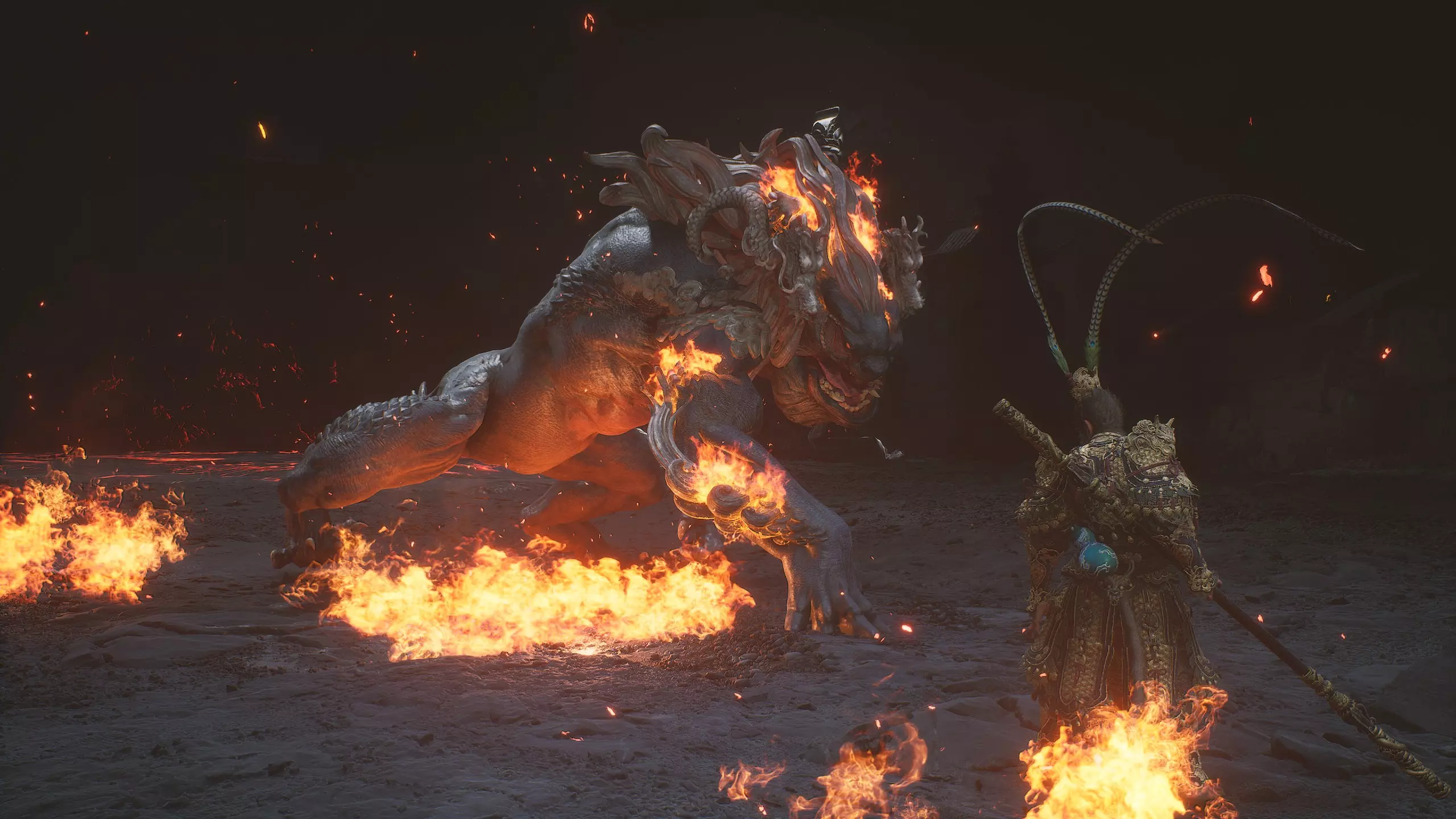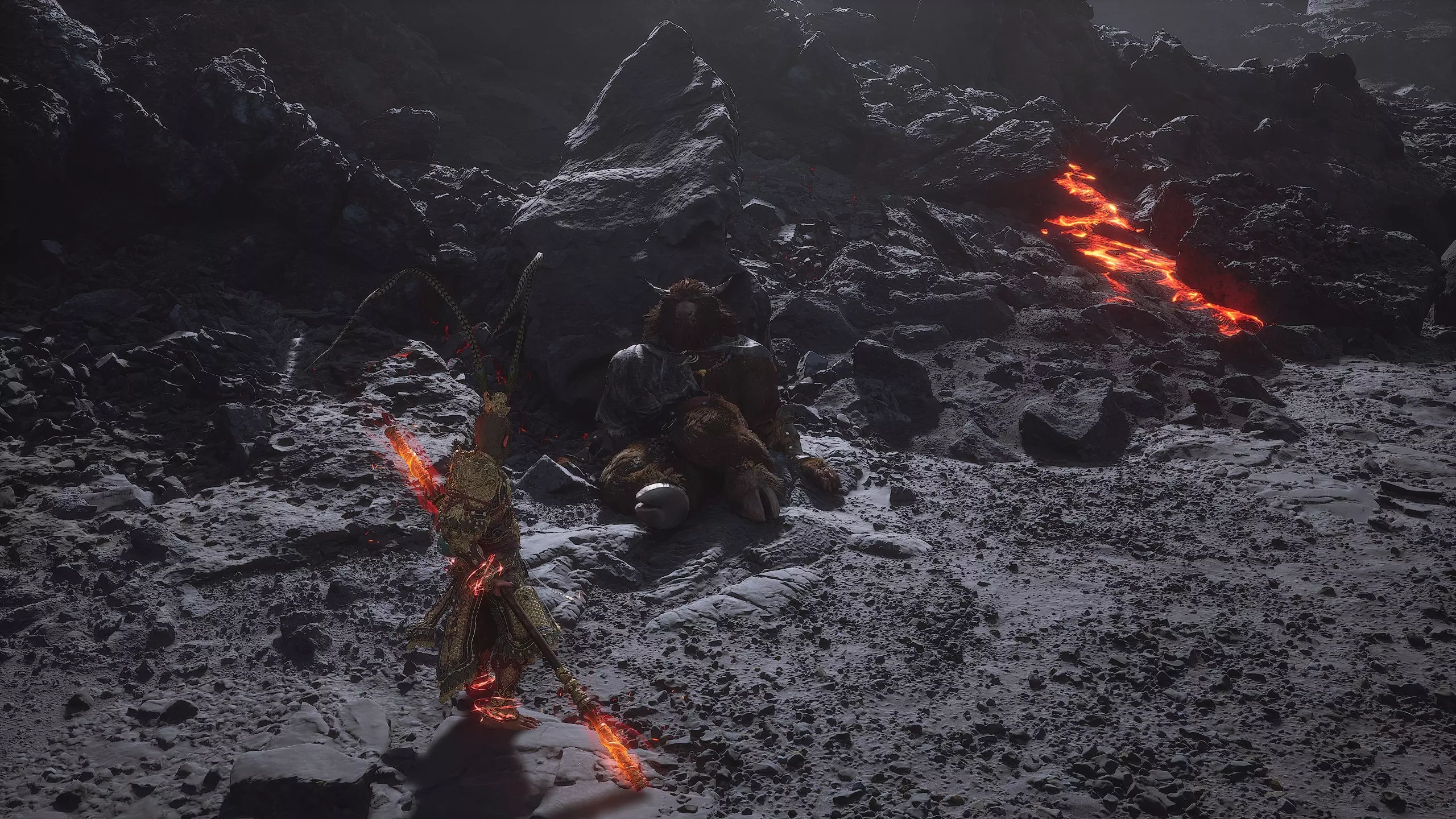 集齐全部套装[17/17]: 凤凰羽金冠 锁子黄金甲 月轮护腕 莲花云履 沿着河流左缘向北飞行。边缘处会坐着隐藏Boss[4/5]——【石猴】。攻击即可开始与他的战斗
