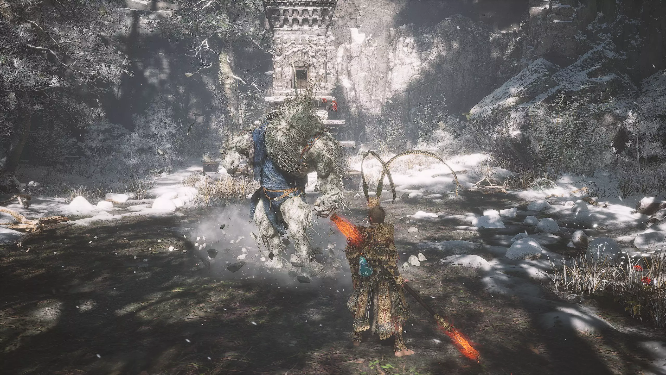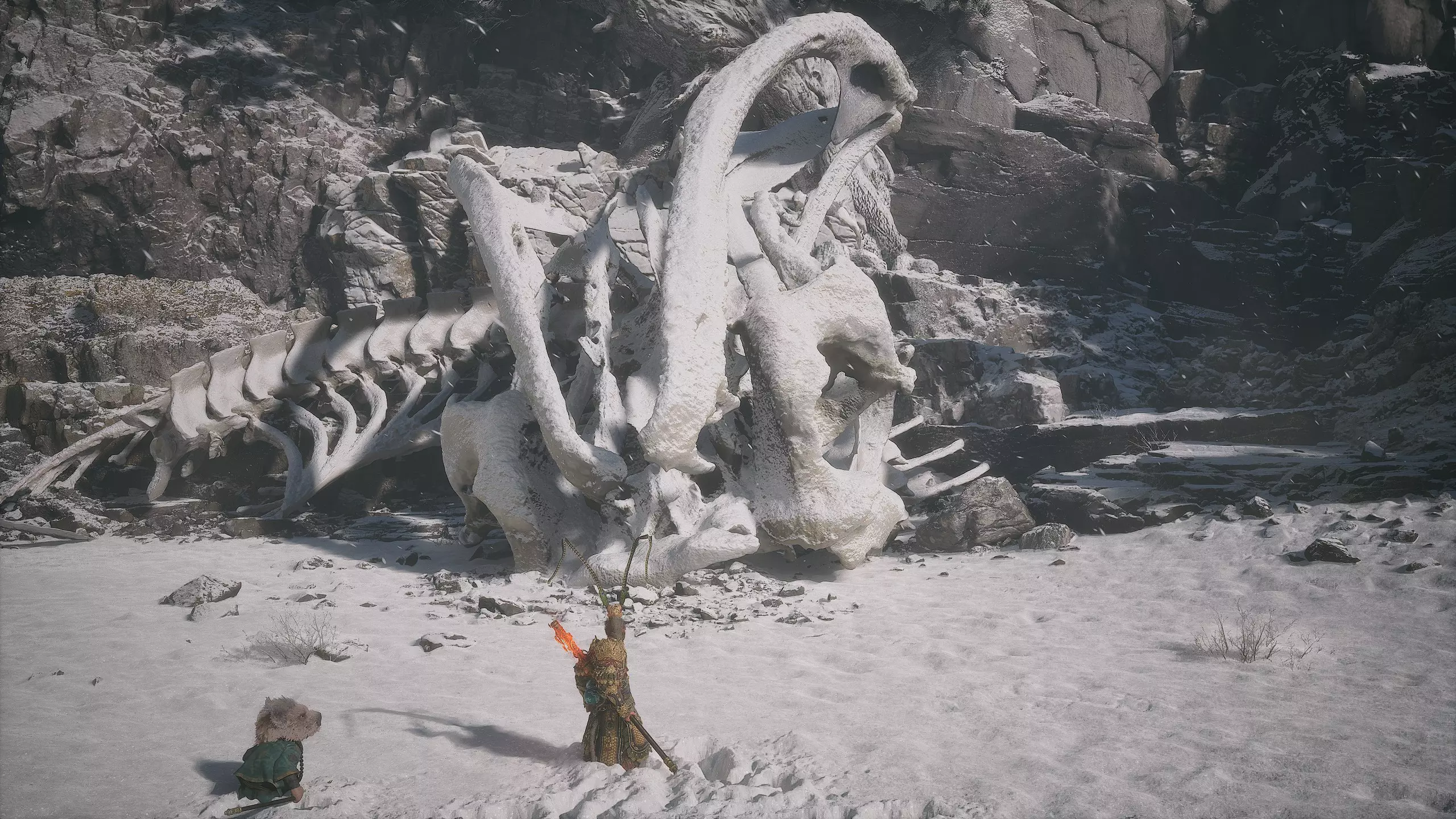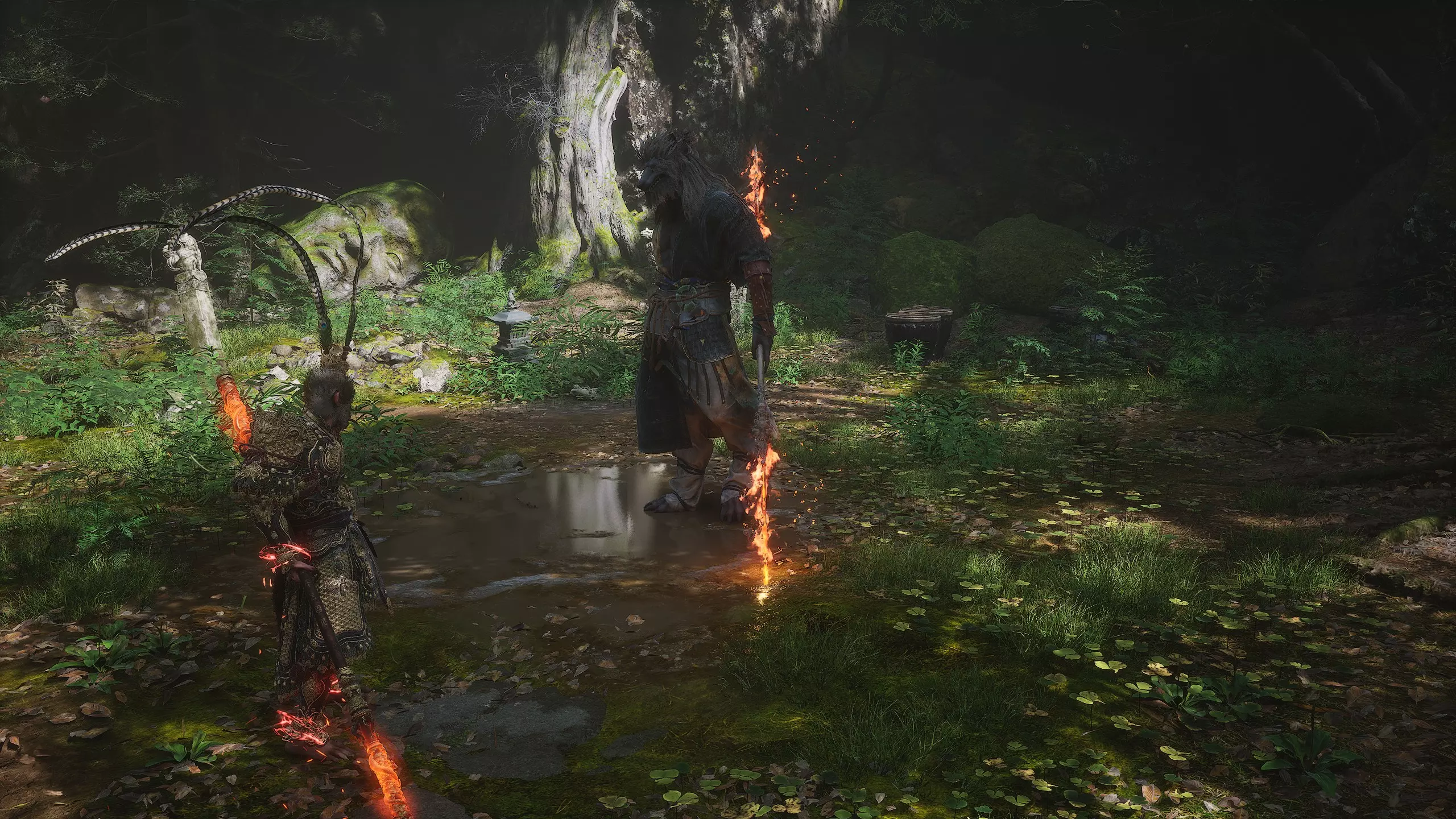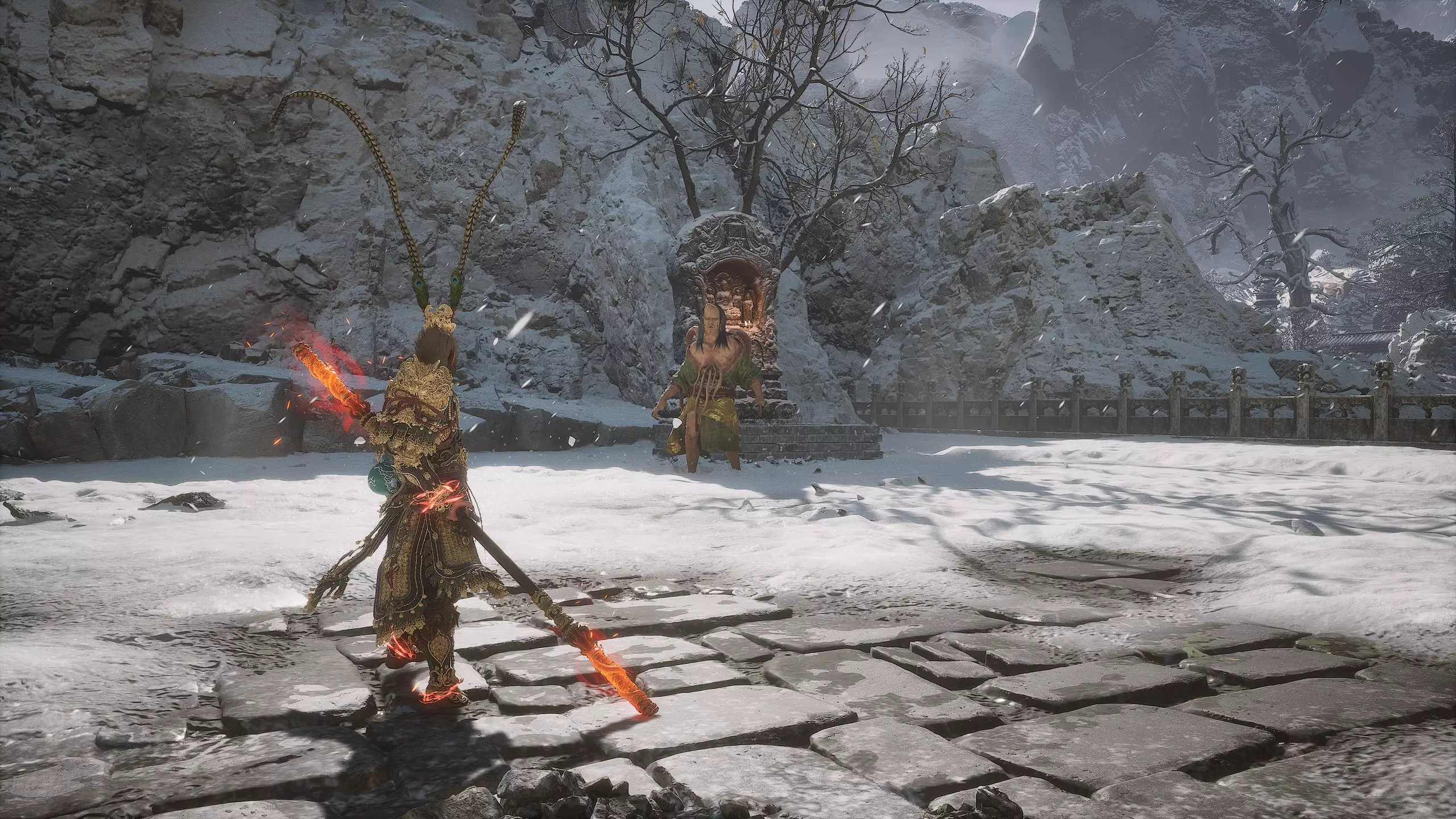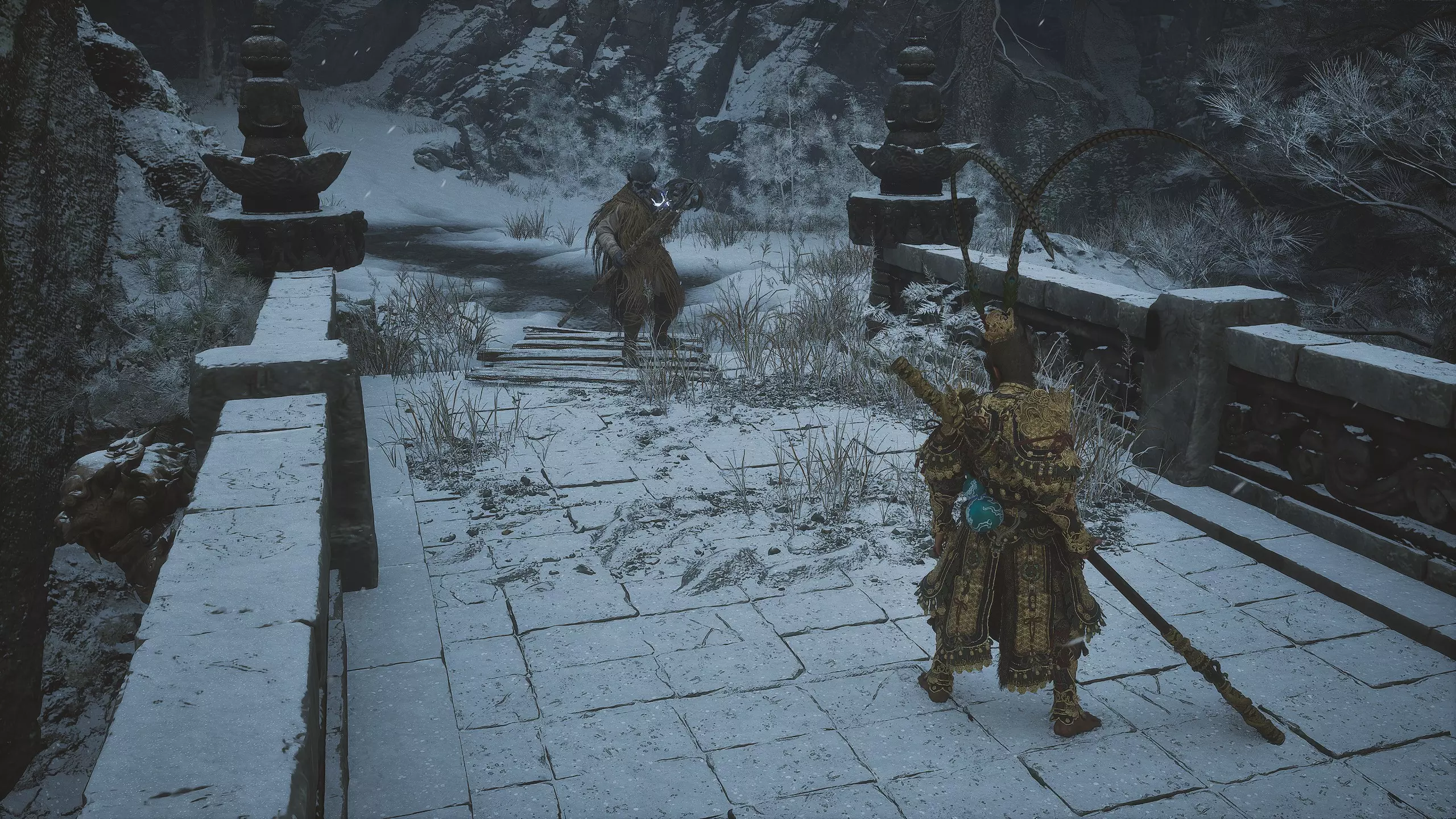集齐全部套装[17/17]: 凤凰羽金冠 锁子黄金甲 月轮护腕 莲花云履 沿着河流左缘向北飞行。边缘处会坐着隐藏Boss[4/5]——【石猴】。攻击即可开始与他的战斗