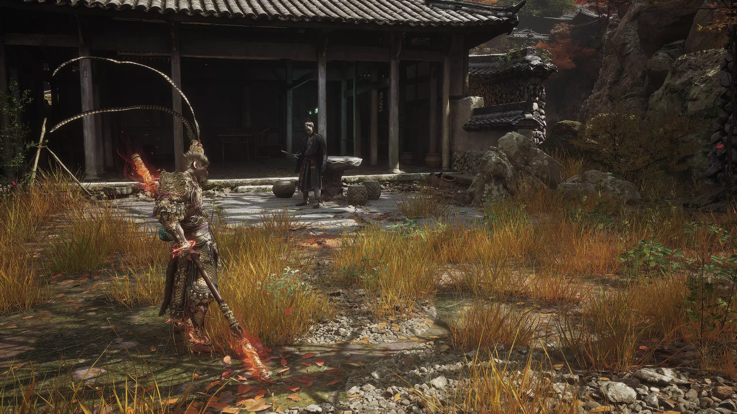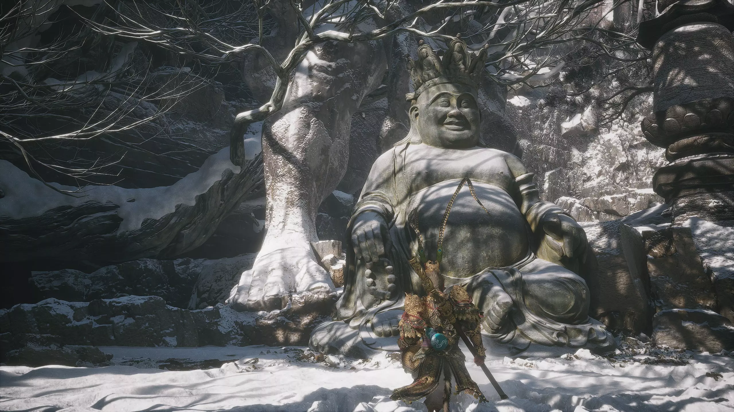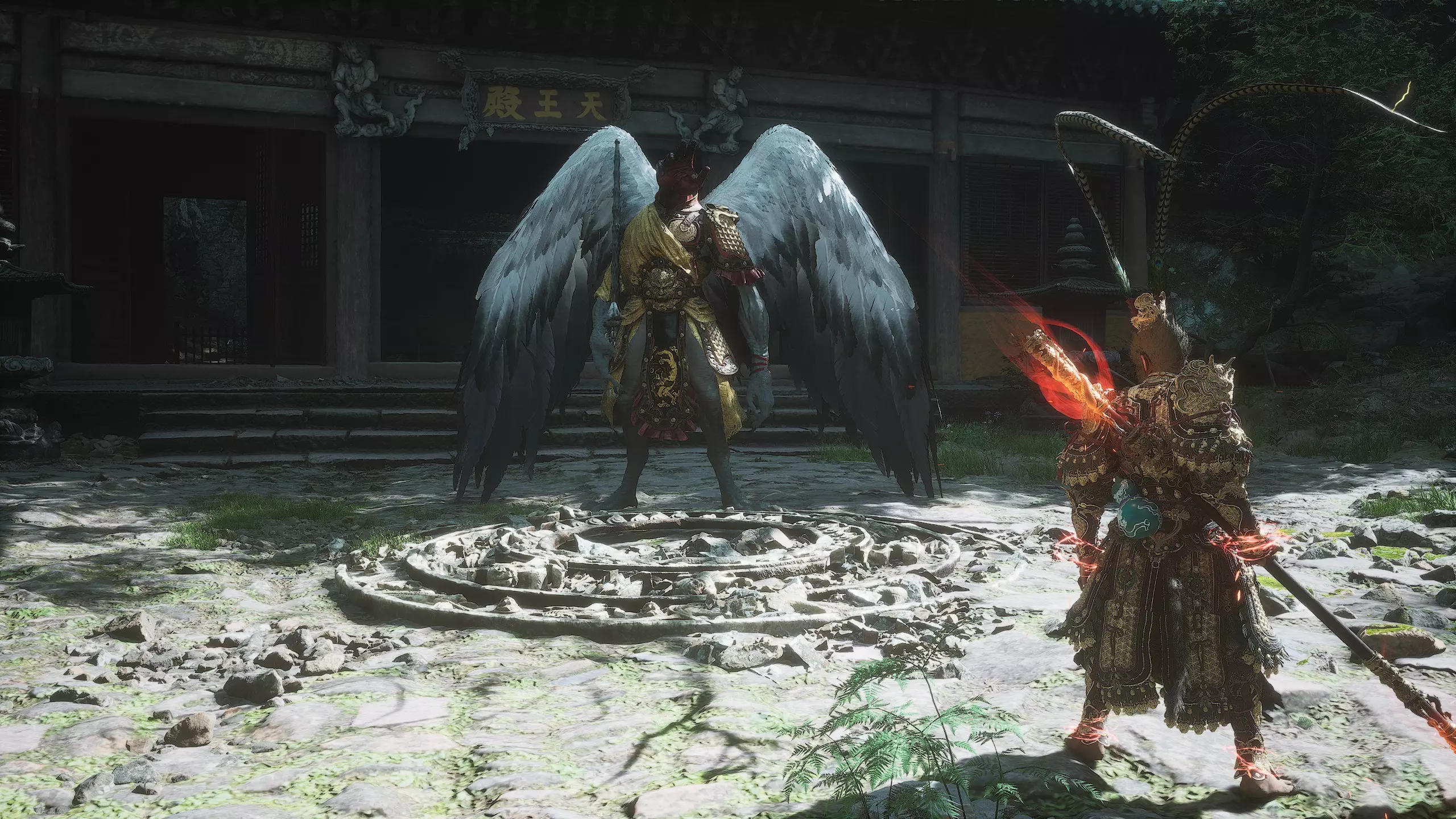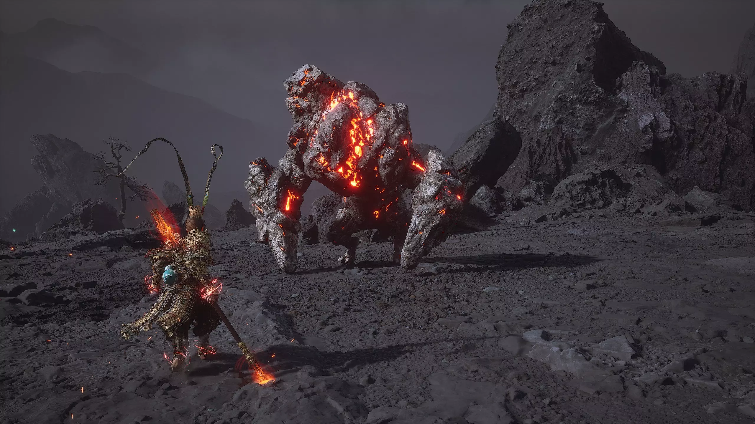 集齐全部套装[17/17]: 凤凰羽金冠 锁子黄金甲 月轮护腕 莲花云履 沿着河流左缘向北飞行。边缘处会坐着隐藏Boss[4/5]——【石猴】。攻击即可开始与他的战斗