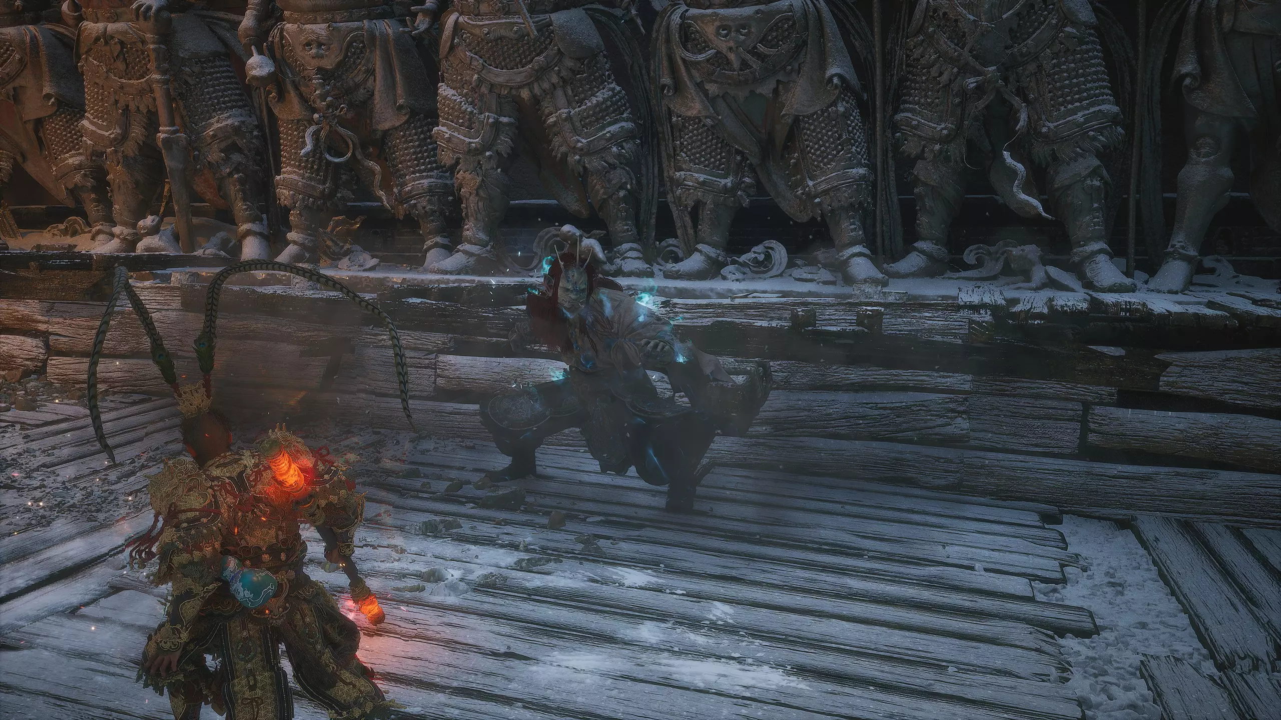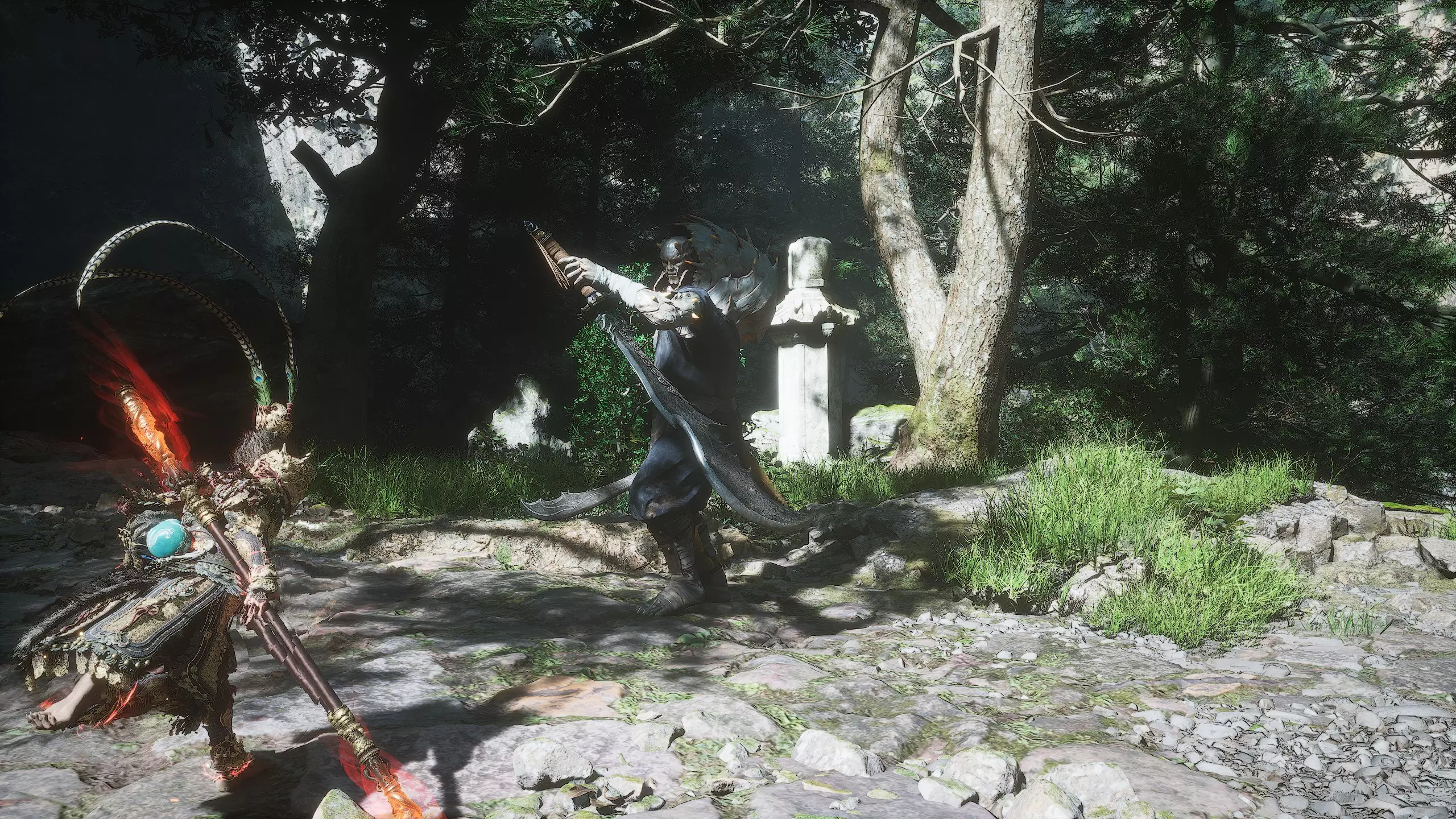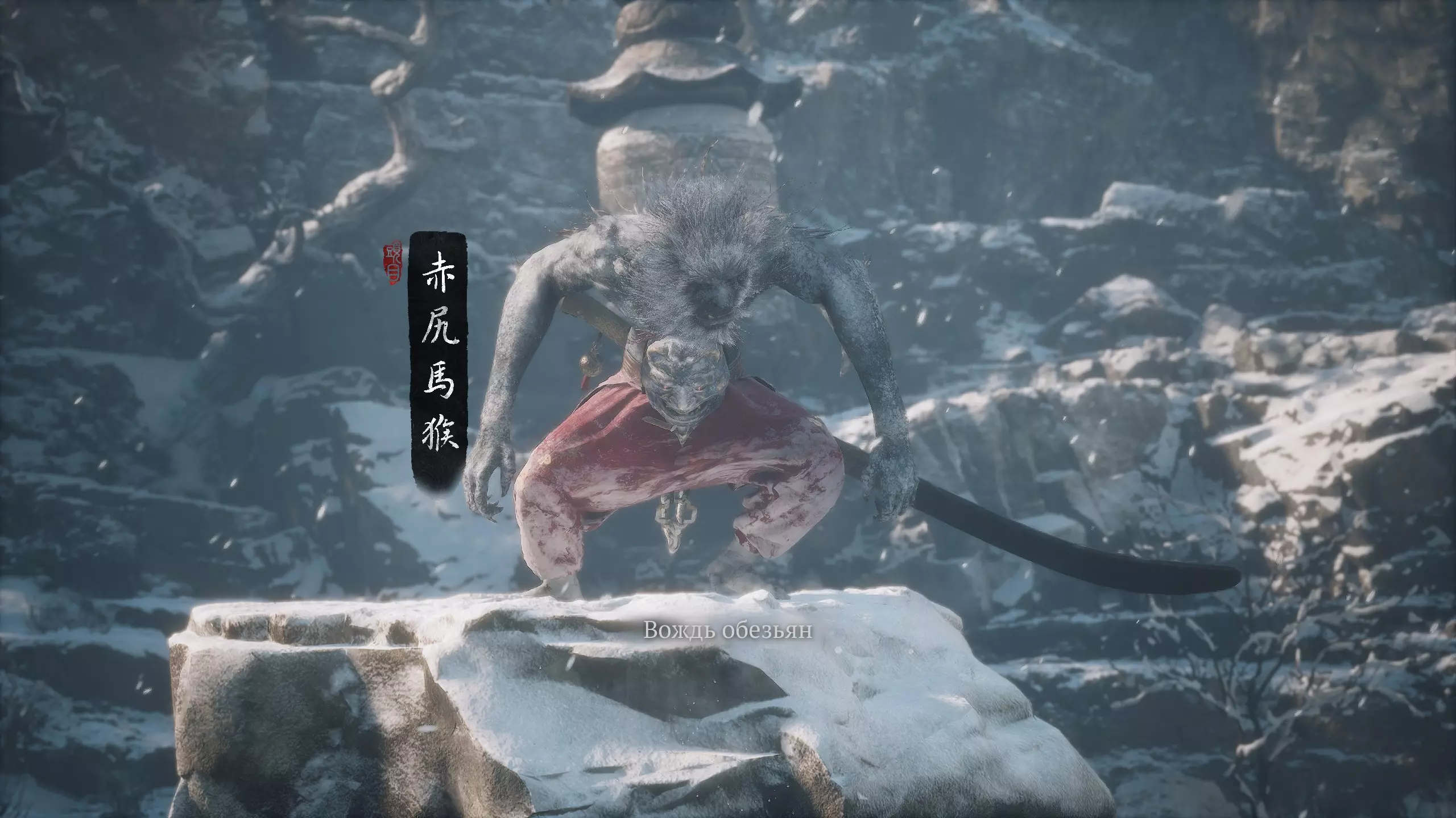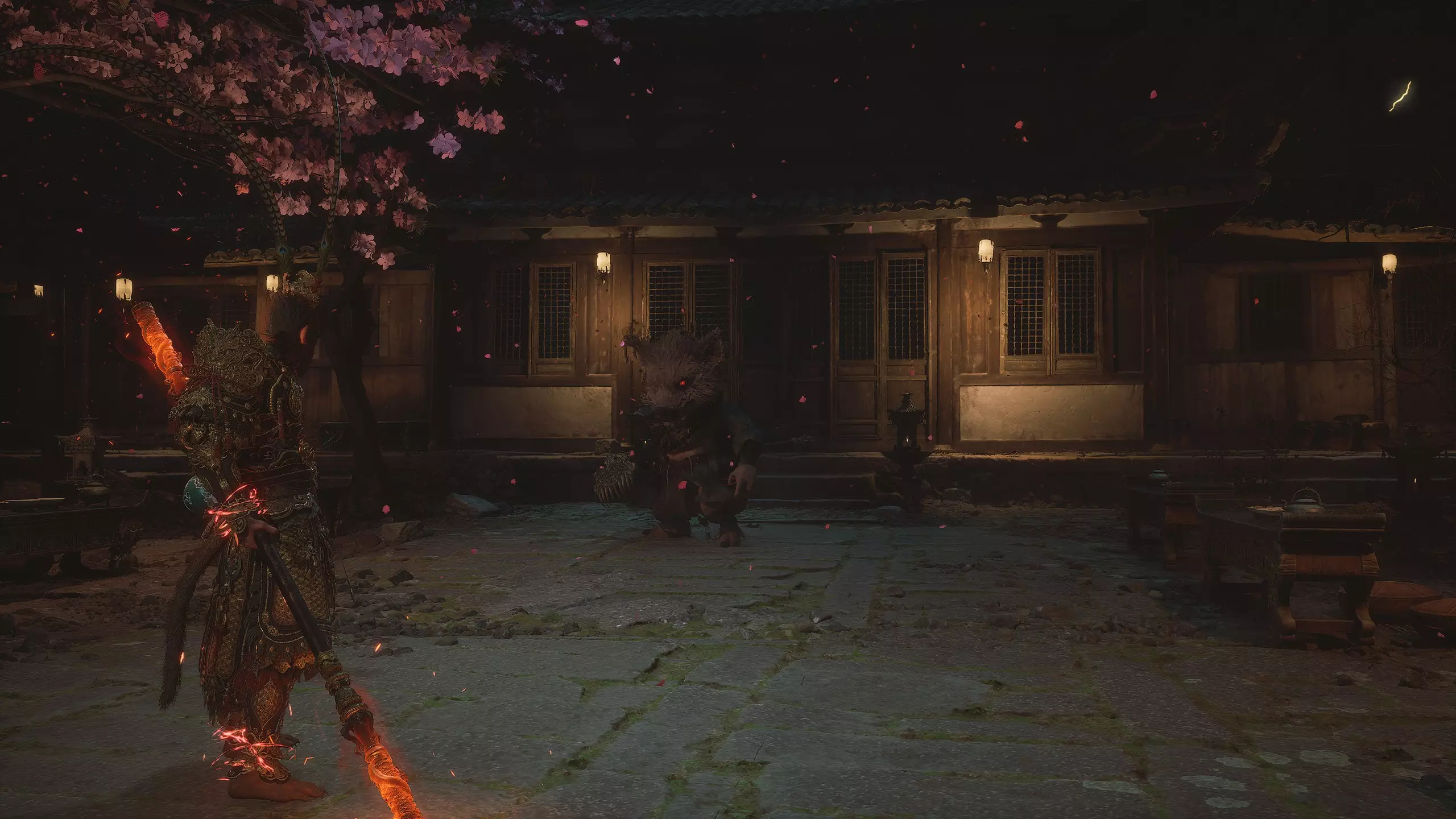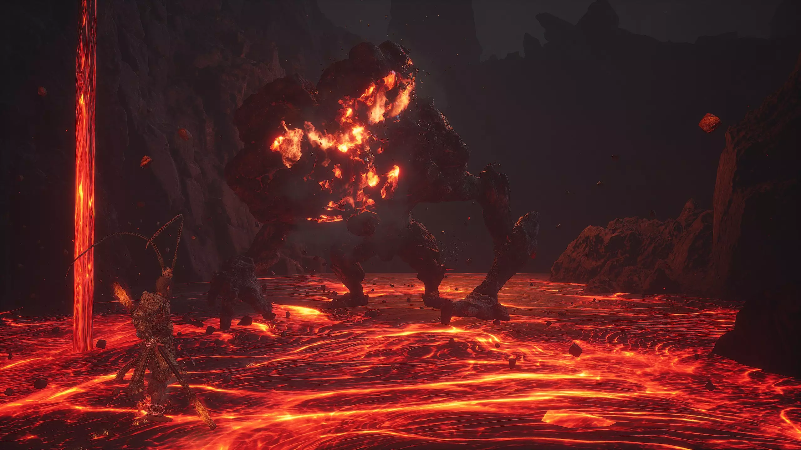 集齐全部套装[17/17]: 凤凰羽金冠 锁子黄金甲 月轮护腕 莲花云履 沿着河流左缘向北飞行。边缘处会坐着隐藏Boss[4/5]——【石猴】。攻击即可开始与他的战斗