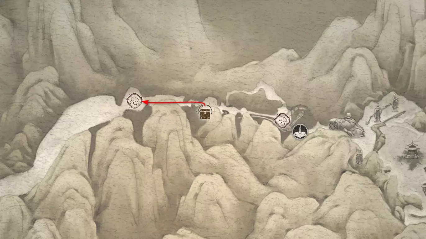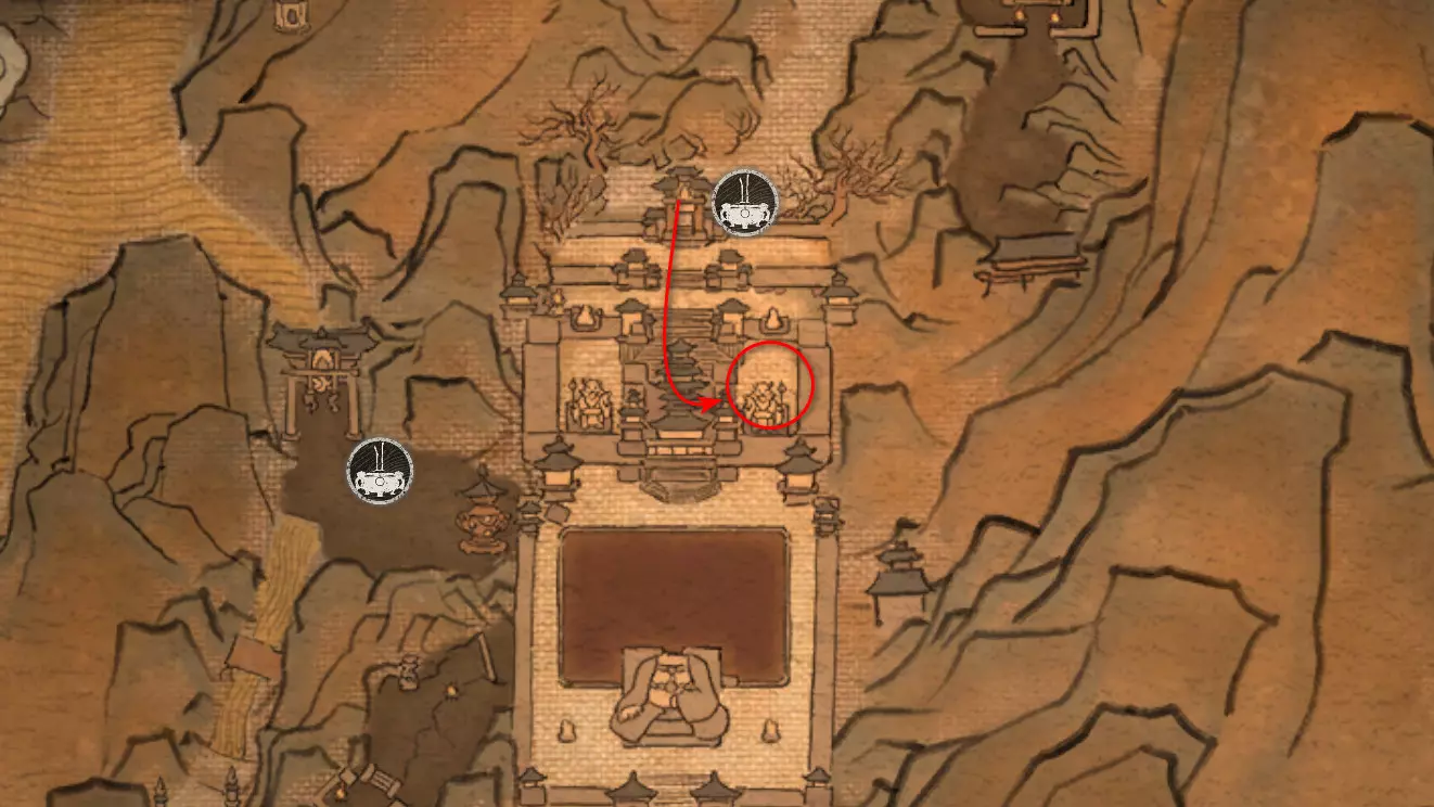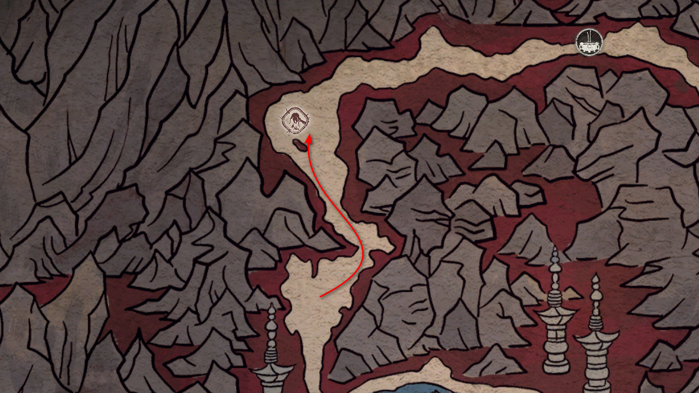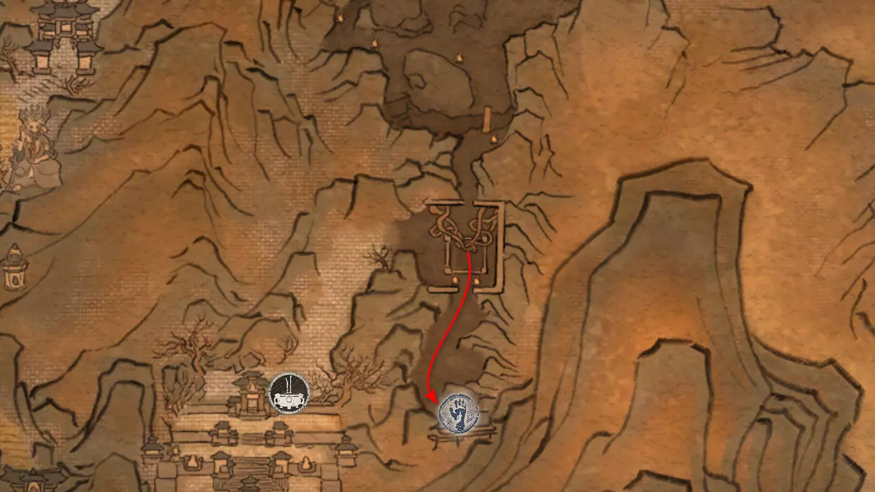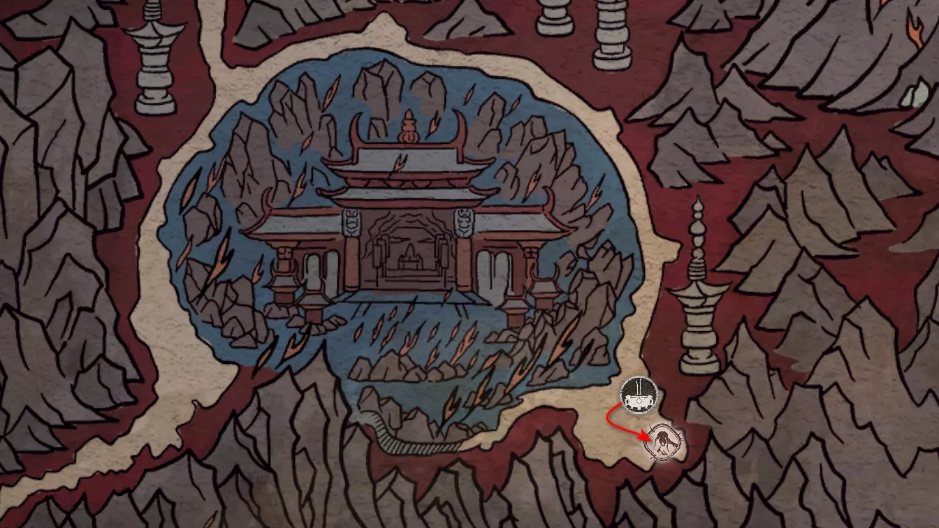 神圣宴席 “好吧,拿去吧。全都拿去吧。” 第三章 - 梅山(秘密) 返回第三章的“积雪小径”祭坛,位于庙宇世界。向下走,穿过桥梁,一直走到尽头。空地上有一个被雾气和触须覆盖的洞穴入口。与雾气互动,进入洞穴内部。里面会有一个小佛陀等着我们,他会将我们传送到新的秘密地点——“梅山”