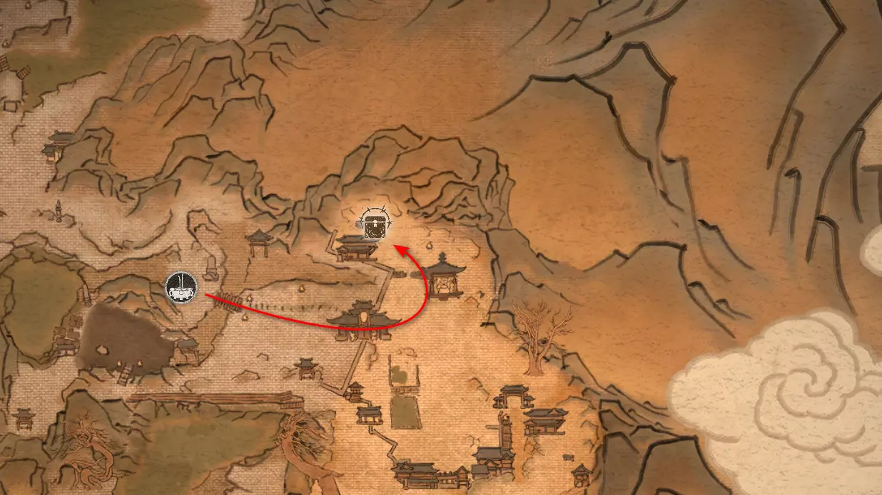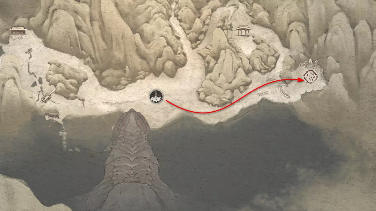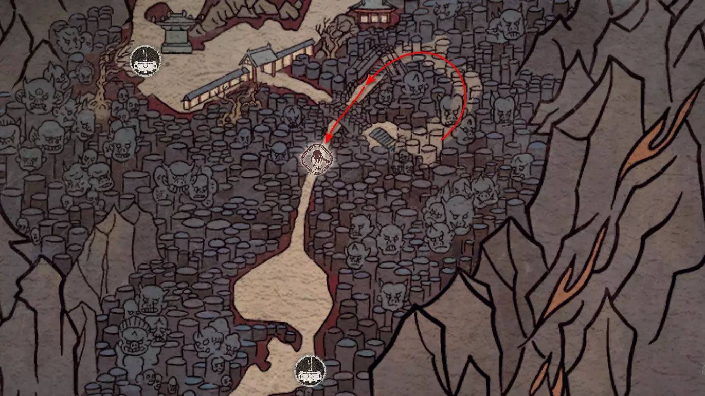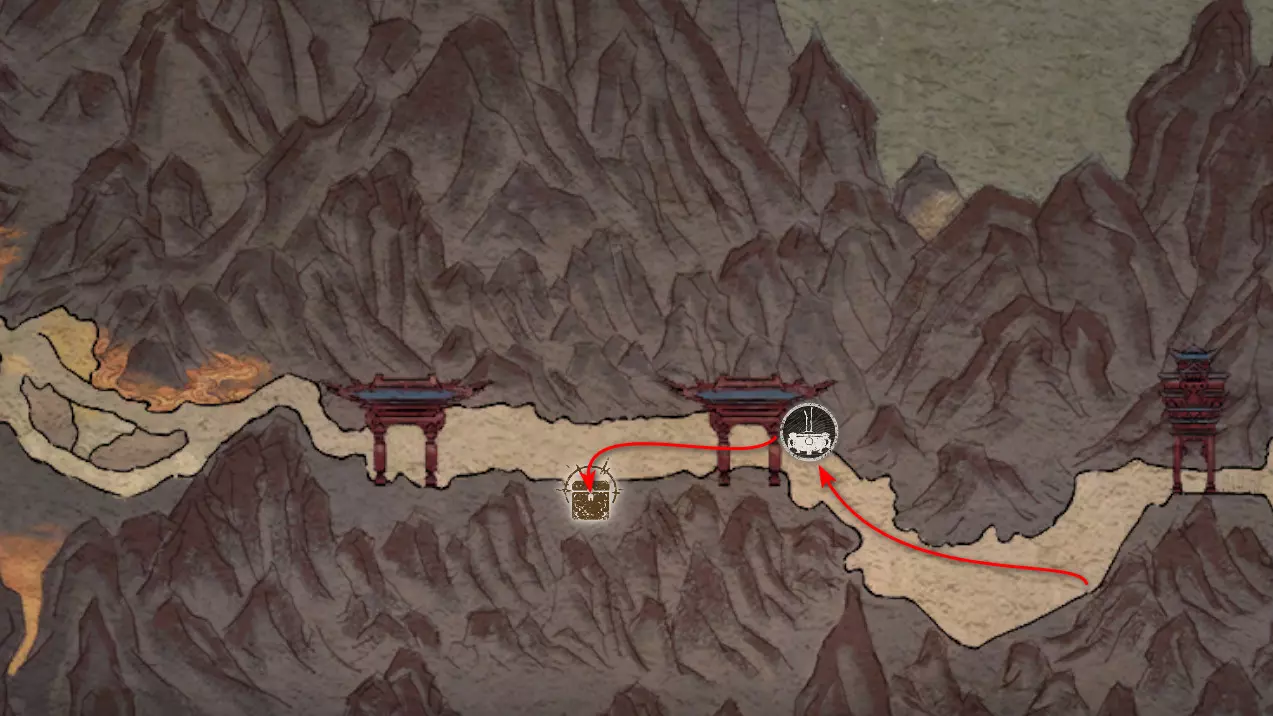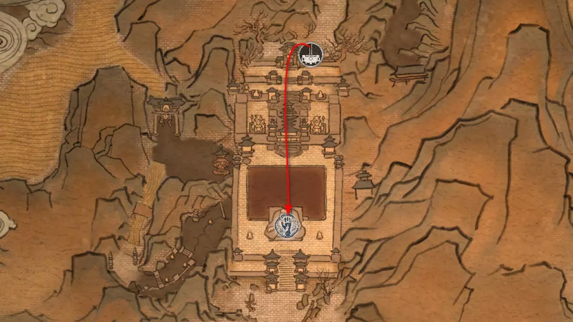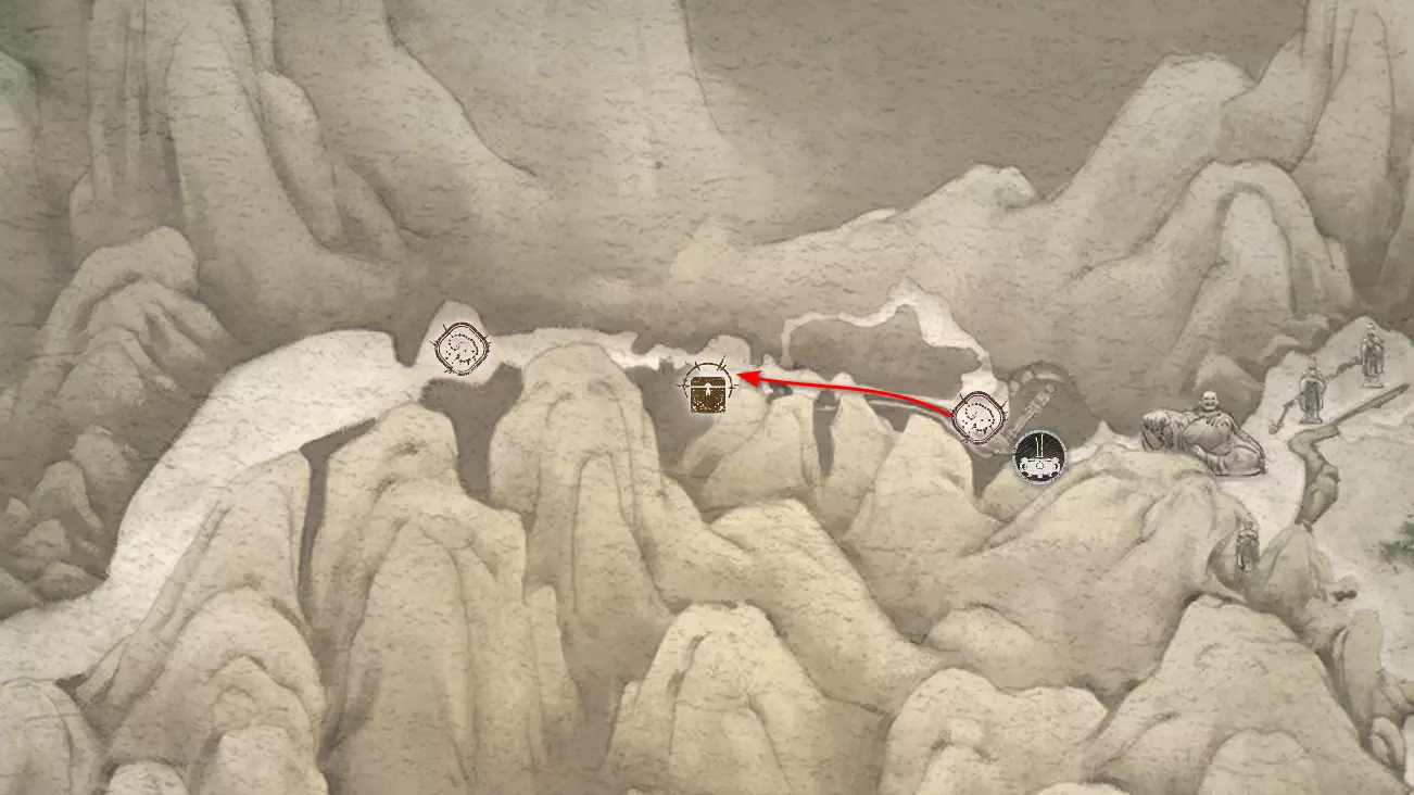 神圣宴席 “好吧,拿去吧。全都拿去吧。” 第三章 - 梅山(秘密) 返回第三章的“积雪小径”祭坛,位于庙宇世界。向下走,穿过桥梁,一直走到尽头。空地上有一个被雾气和触须覆盖的洞穴入口。与雾气互动,进入洞穴内部。里面会有一个小佛陀等着我们,他会将我们传送到新的秘密地点——“梅山”