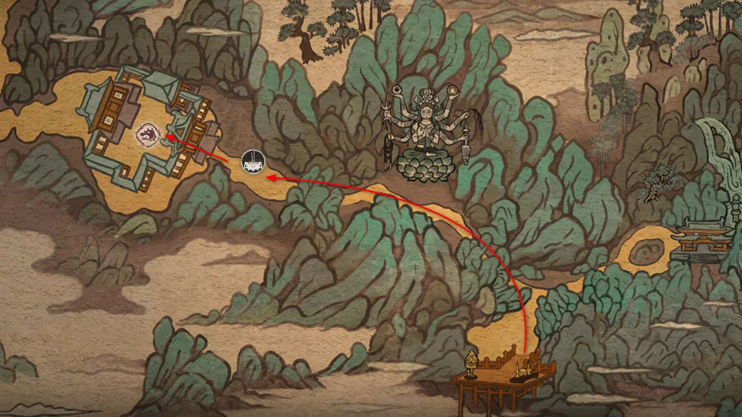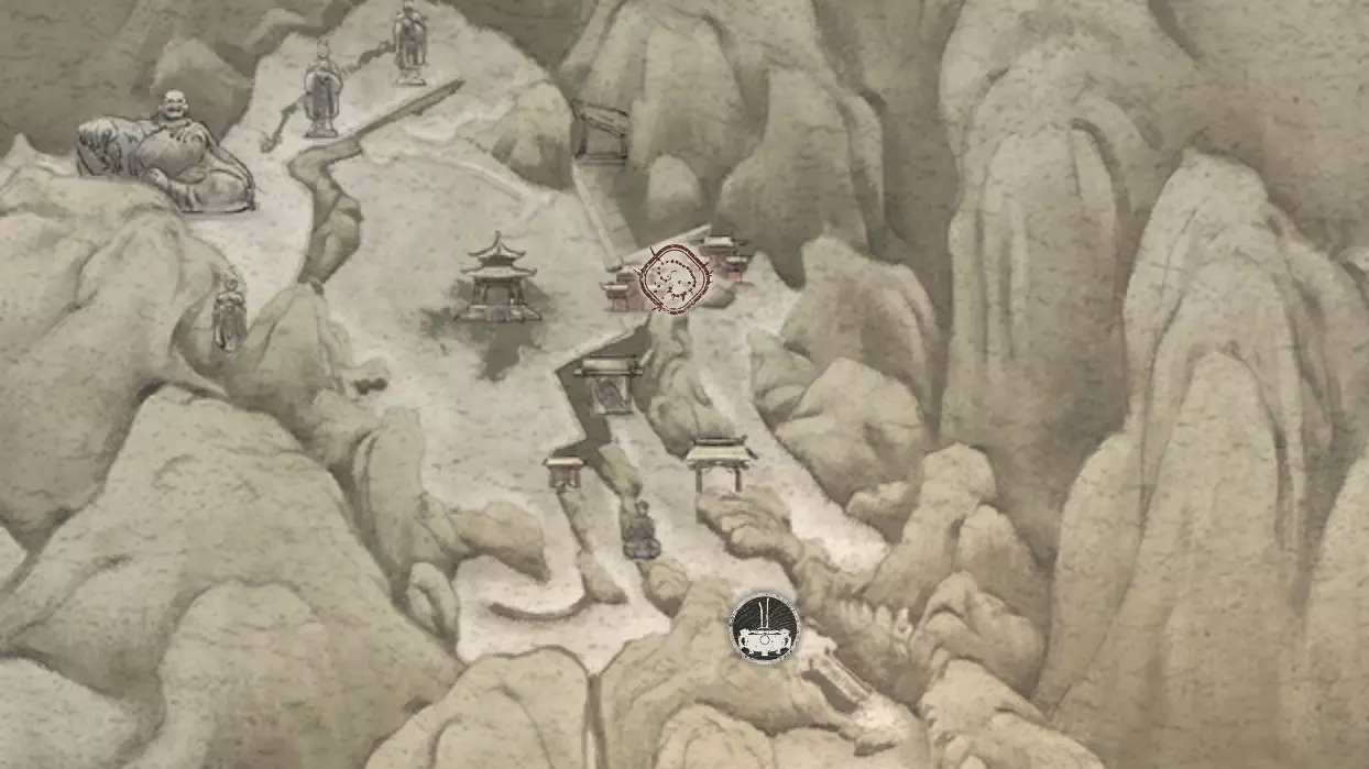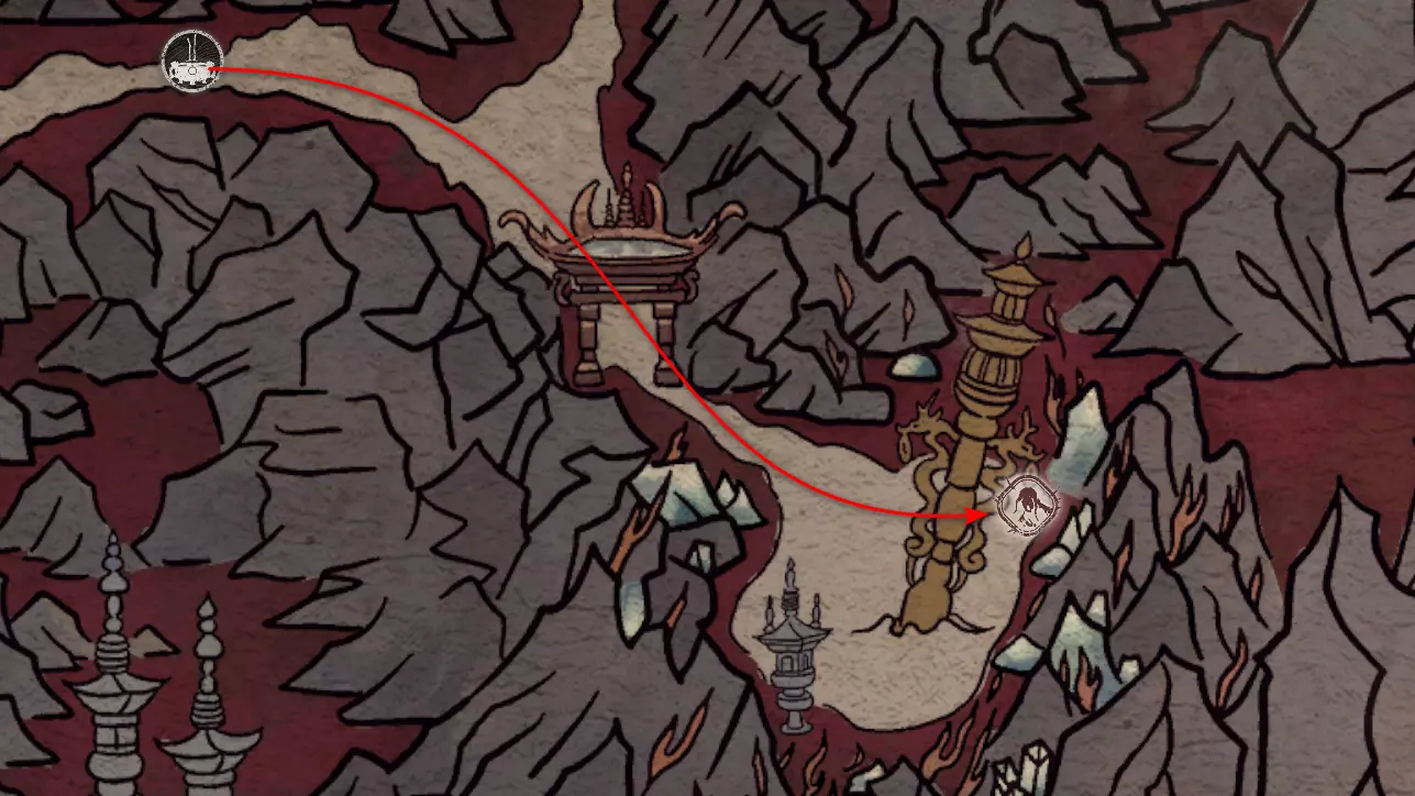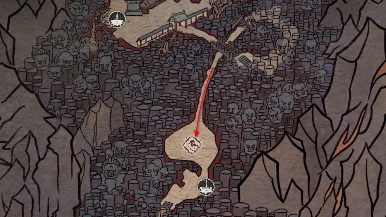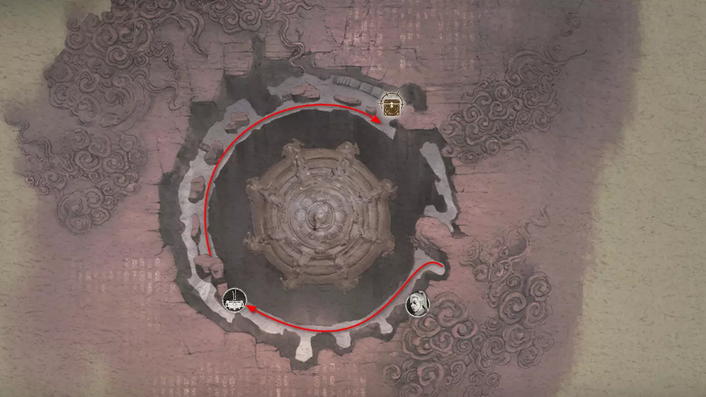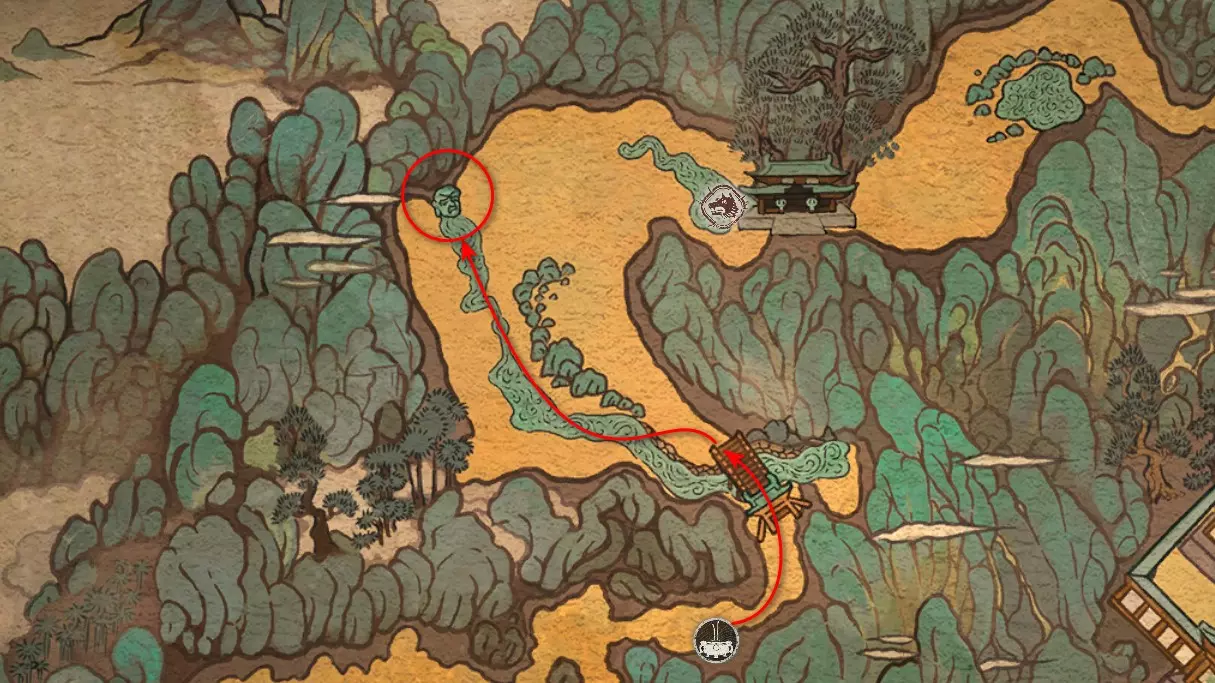 神圣宴席 “好吧,拿去吧。全都拿去吧。” 第三章 - 梅山(秘密) 返回第三章的“积雪小径”祭坛,位于庙宇世界。向下走,穿过桥梁,一直走到尽头。空地上有一个被雾气和触须覆盖的洞穴入口。与雾气互动,进入洞穴内部。里面会有一个小佛陀等着我们,他会将我们传送到新的秘密地点——“梅山”