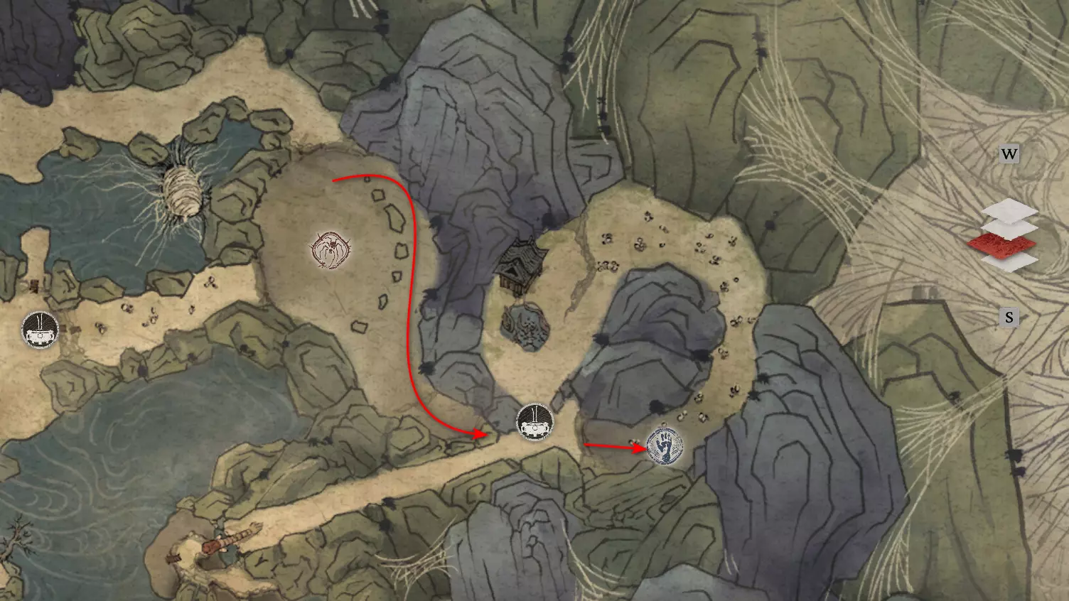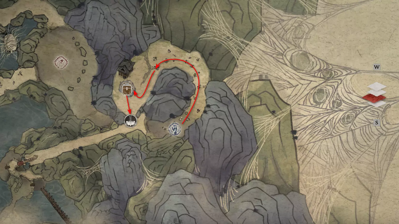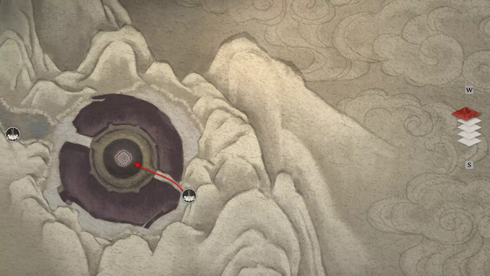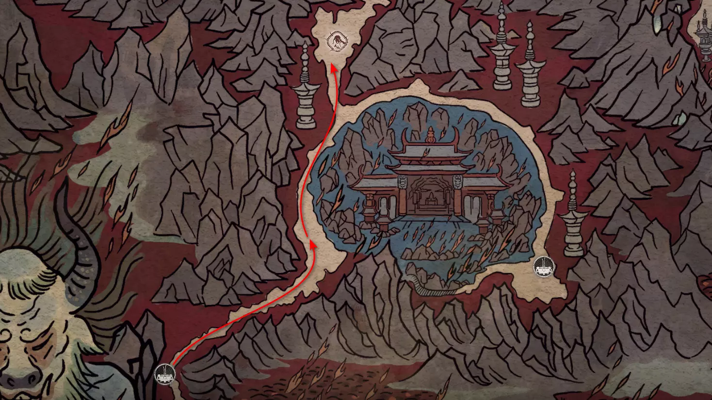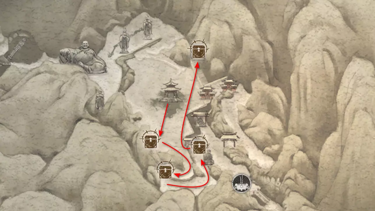 神圣宴席 “好吧,拿去吧。全都拿去吧。” 第三章 - 梅山(秘密) 返回第三章的“积雪小径”祭坛,位于庙宇世界。向下走,穿过桥梁,一直走到尽头。空地上有一个被雾气和触须覆盖的洞穴入口。与雾气互动,进入洞穴内部。里面会有一个小佛陀等着我们,他会将我们传送到新的秘密地点——“梅山”