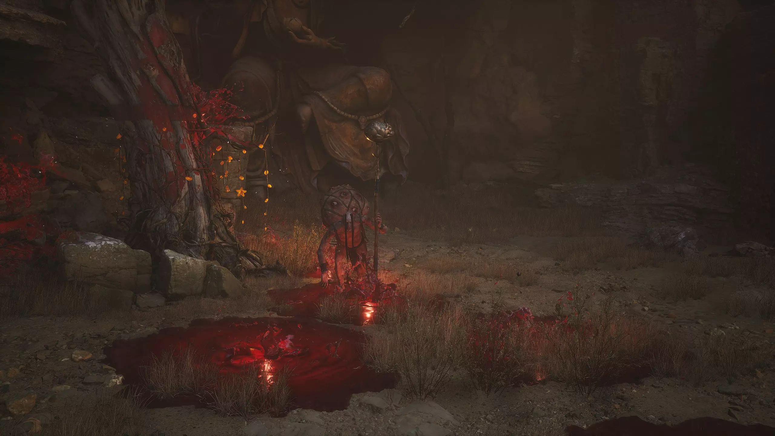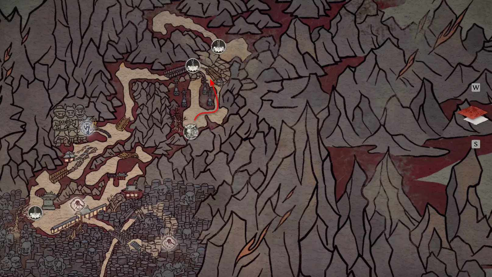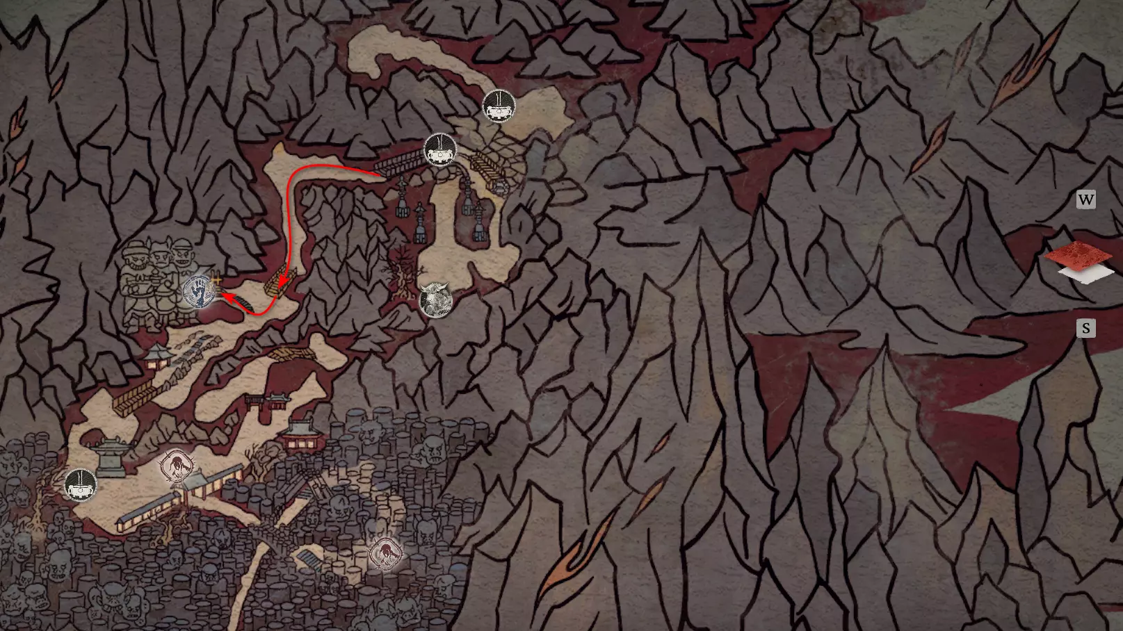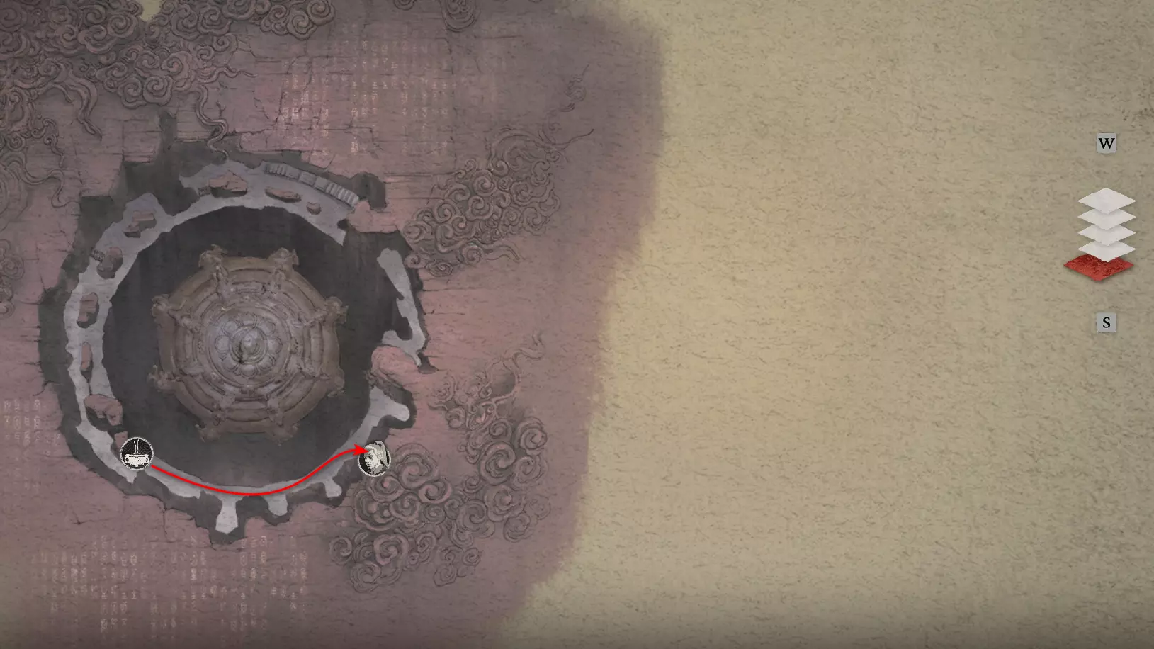 神圣宴席 “好吧,拿去吧。全都拿去吧。” 第三章 - 梅山(秘密) 返回第三章的“积雪小径”祭坛,位于庙宇世界。向下走,穿过桥梁,一直走到尽头。空地上有一个被雾气和触须覆盖的洞穴入口。与雾气互动,进入洞穴内部。里面会有一个小佛陀等着我们,他会将我们传送到新的秘密地点——“梅山”