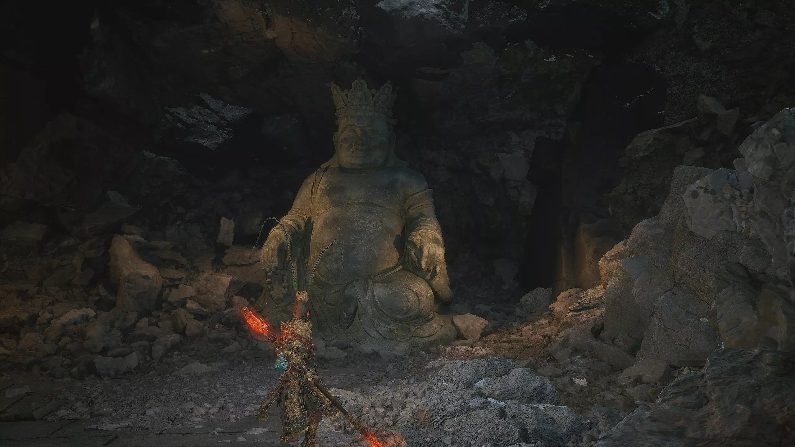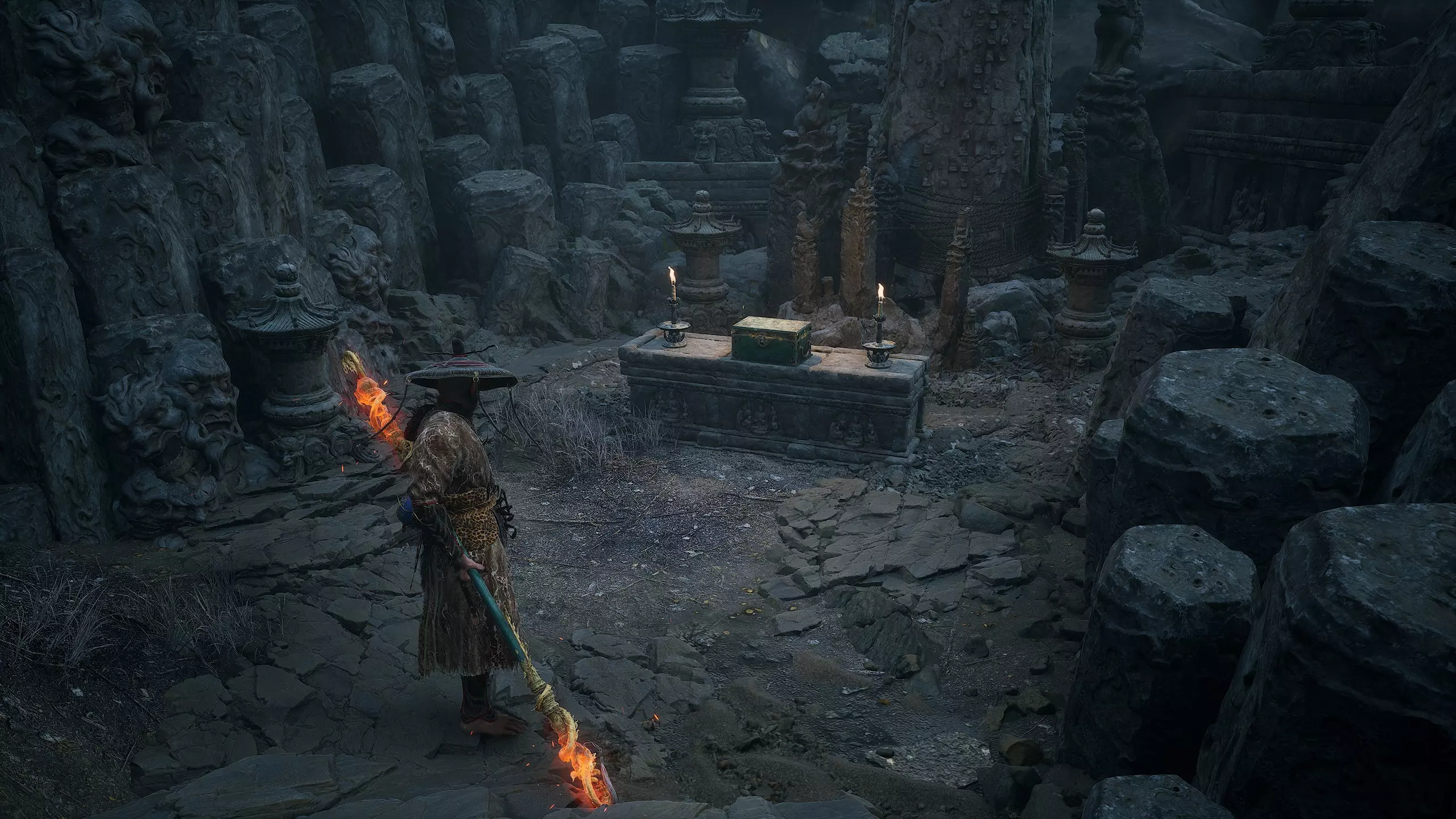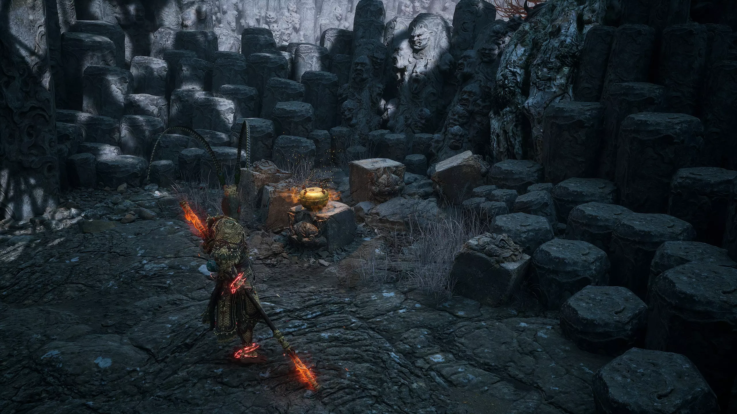 集齐所有【佛眼】后,需返回【石撞祭坛】。在你曾与【石之守卫】战斗过的竞技场,现在可以召唤 Boss【石之傀儡】了。靠近石堆并与之互动即可。