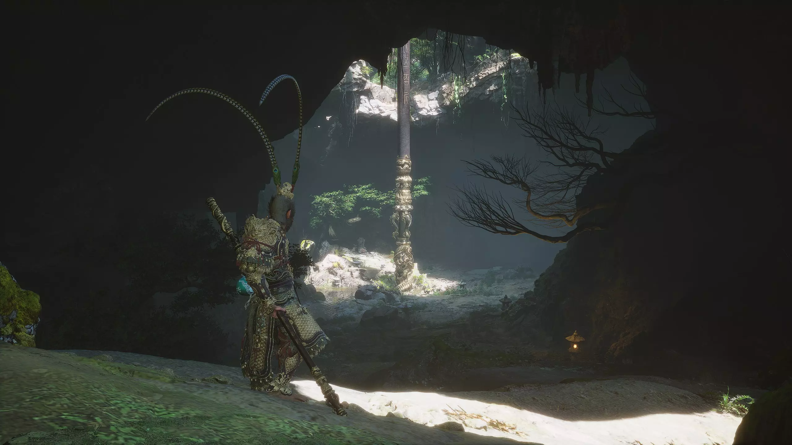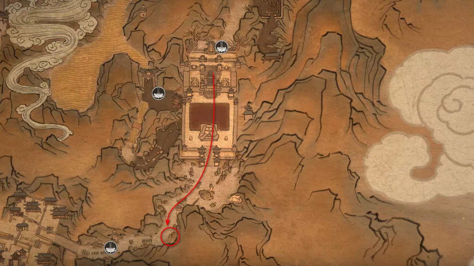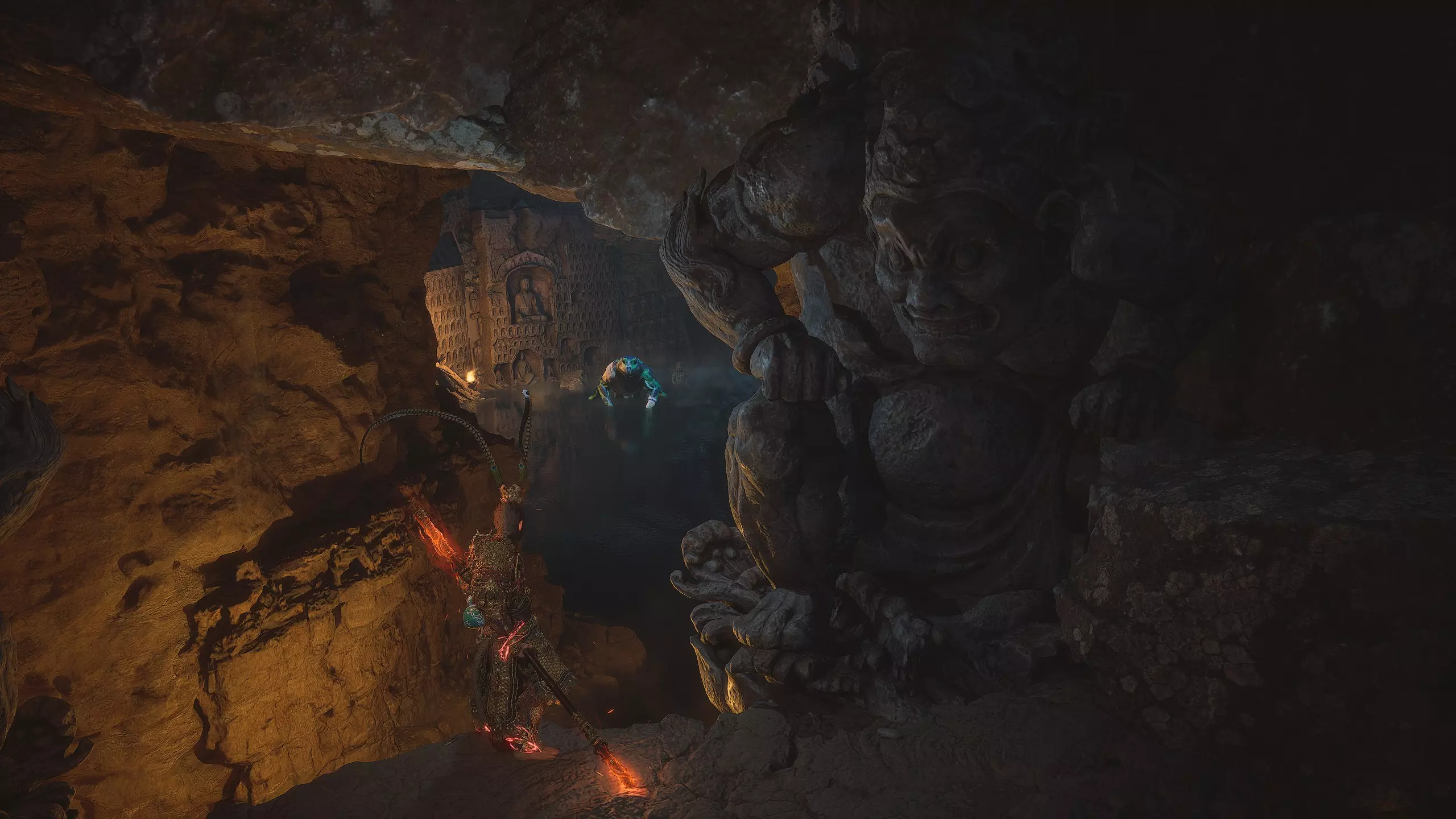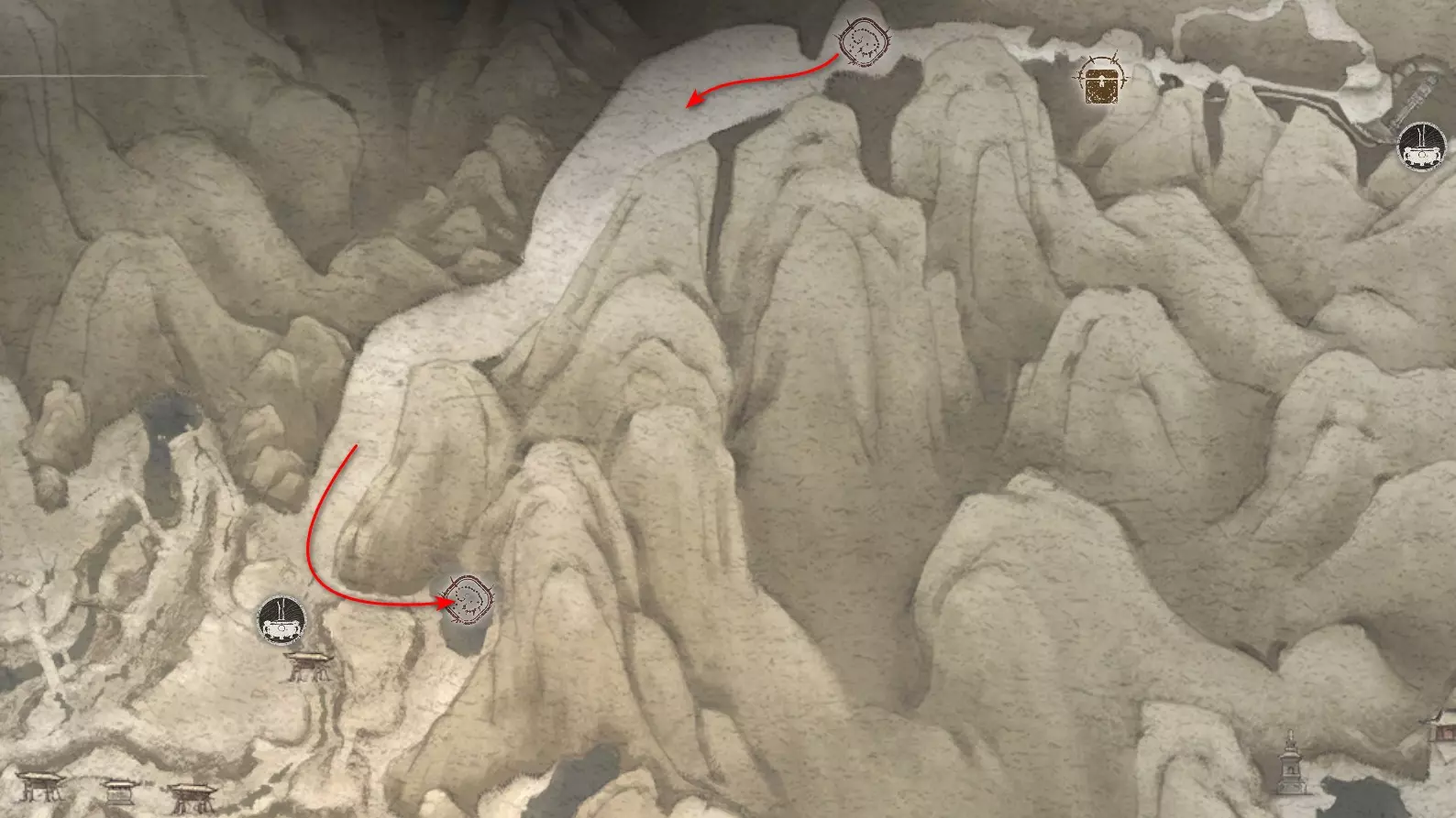 沿着地图向下进入水幕洞穴。在洞穴中我们将获得独特武器[16/19]——“金箍棒”。过场动画结束后,墙上会出现一个通道,但暂时不要进入。我们将在探索完秘密地点后再回到这里。现在先从洞穴中出去。