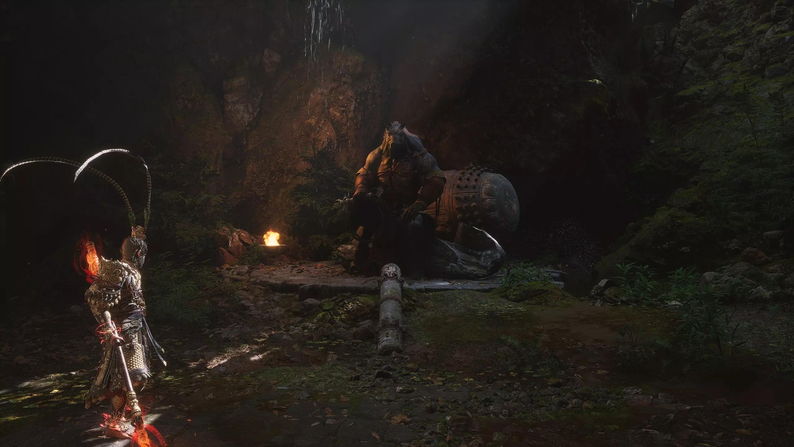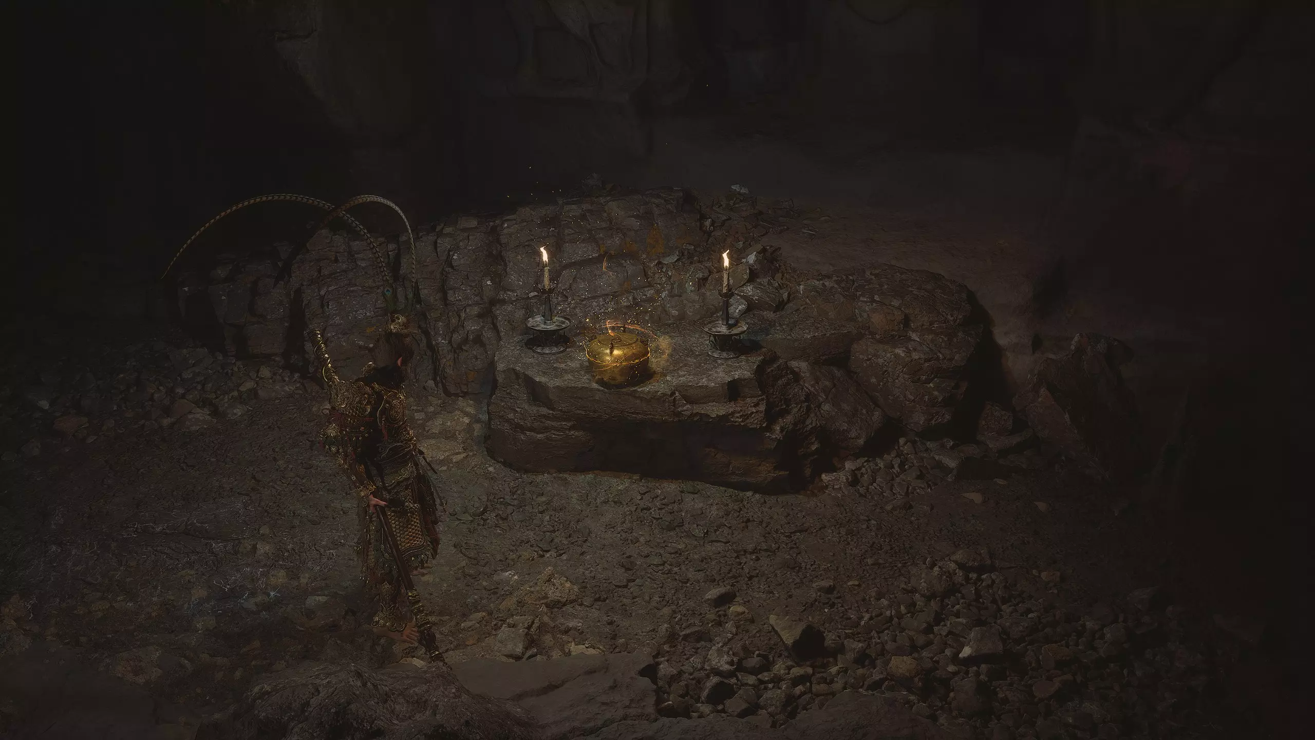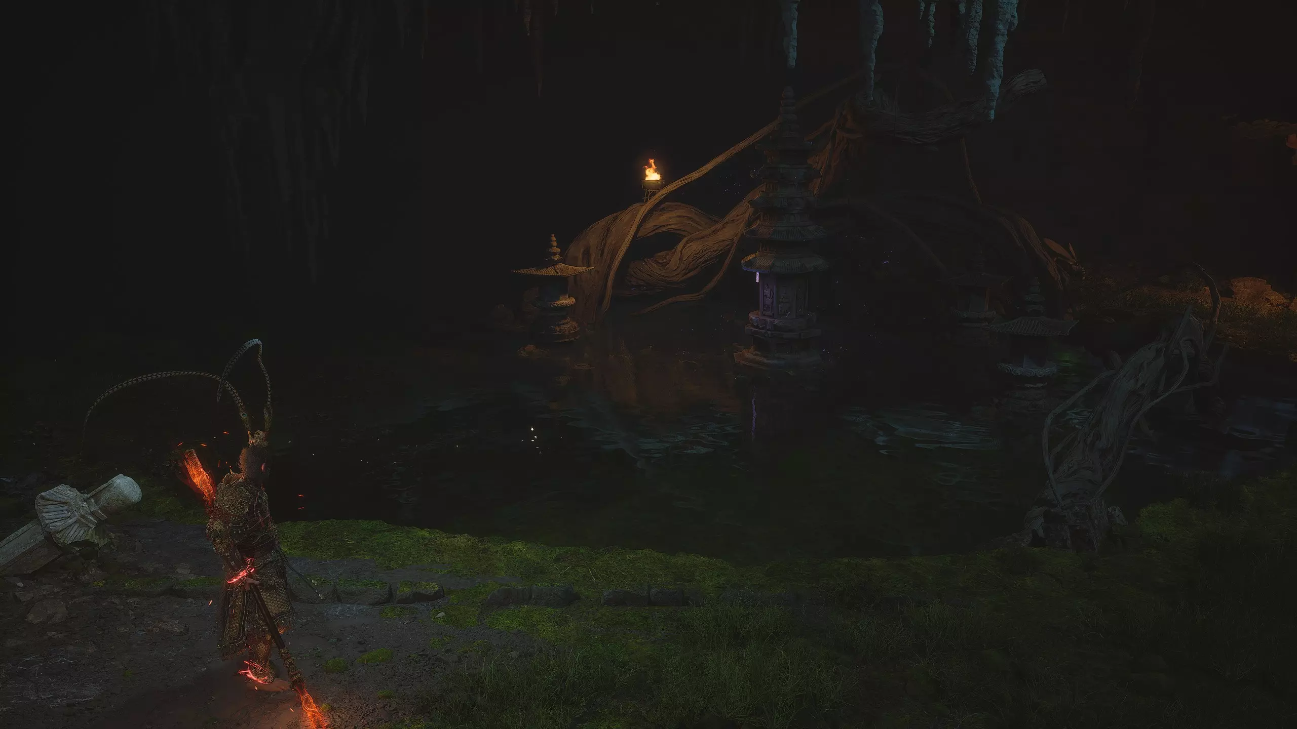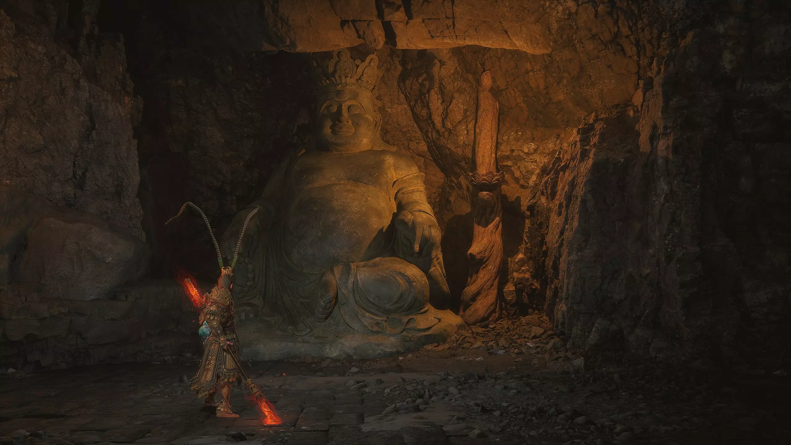 沿着地图向下进入水幕洞穴。在洞穴中我们将获得独特武器[16/19]——“金箍棒”。过场动画结束后,墙上会出现一个通道,但暂时不要进入。我们将在探索完秘密地点后再回到这里。现在先从洞穴中出去。