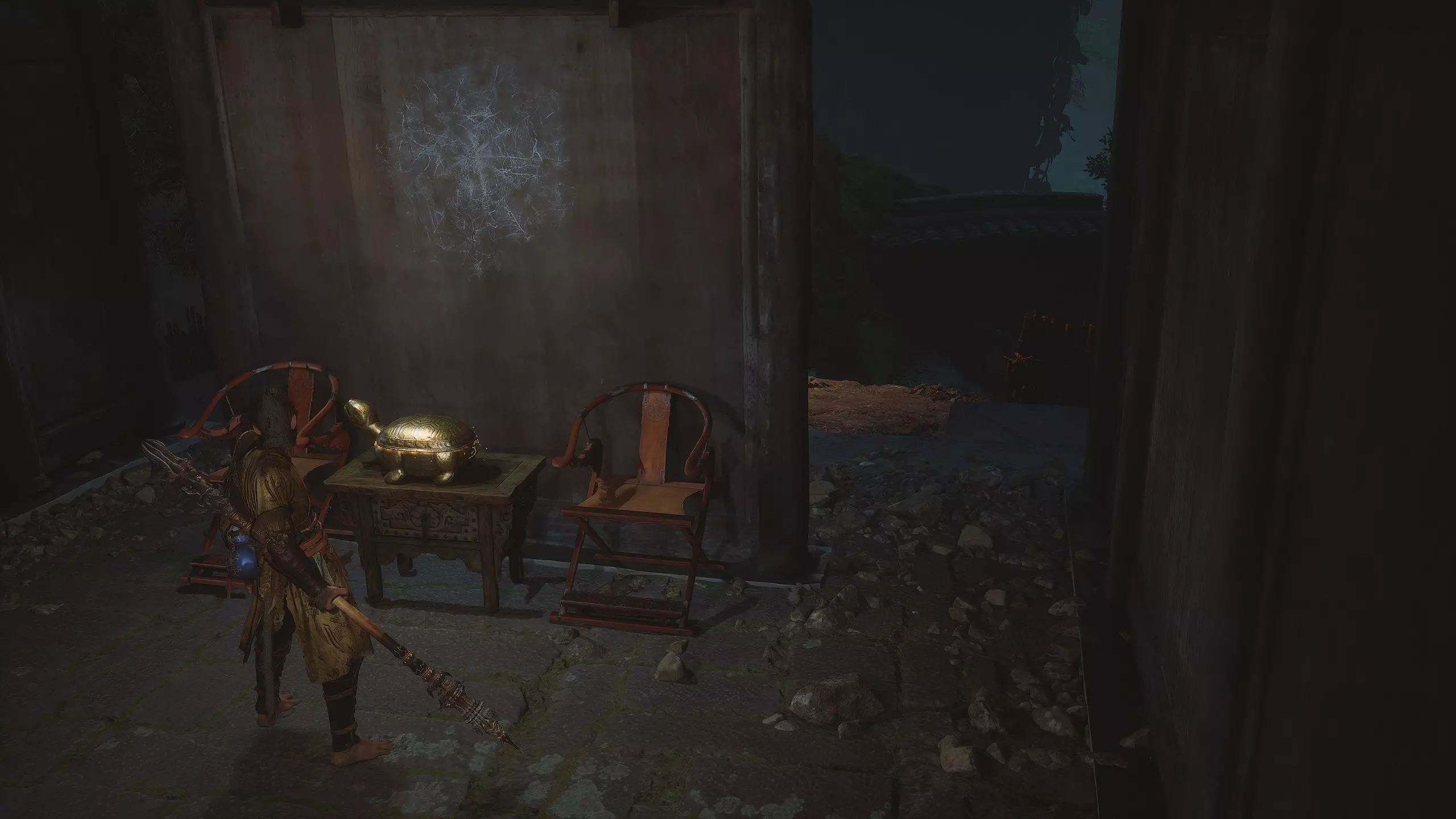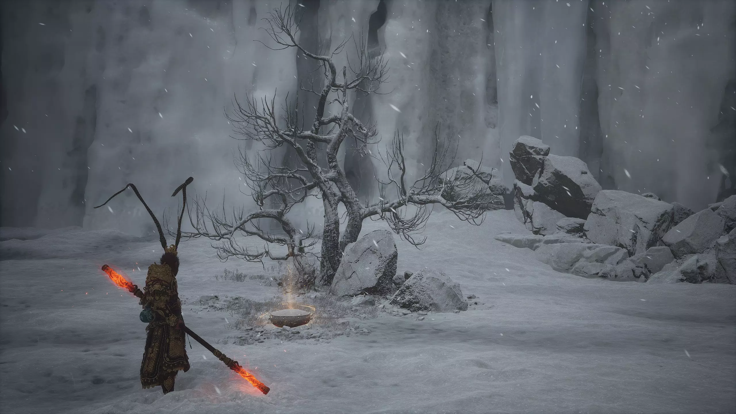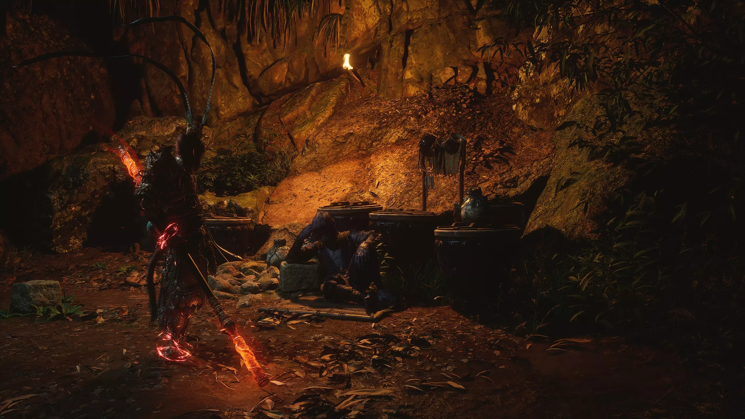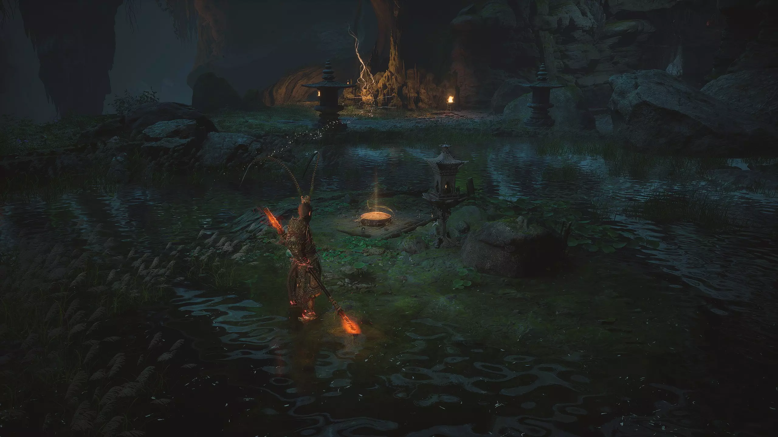 沿着地图向下进入水幕洞穴。在洞穴中我们将获得独特武器[16/19]——“金箍棒”。过场动画结束后,墙上会出现一个通道,但暂时不要进入。我们将在探索完秘密地点后再回到这里。现在先从洞穴中出去。