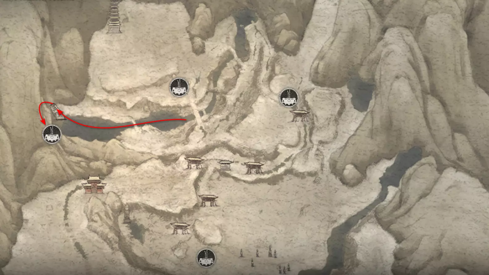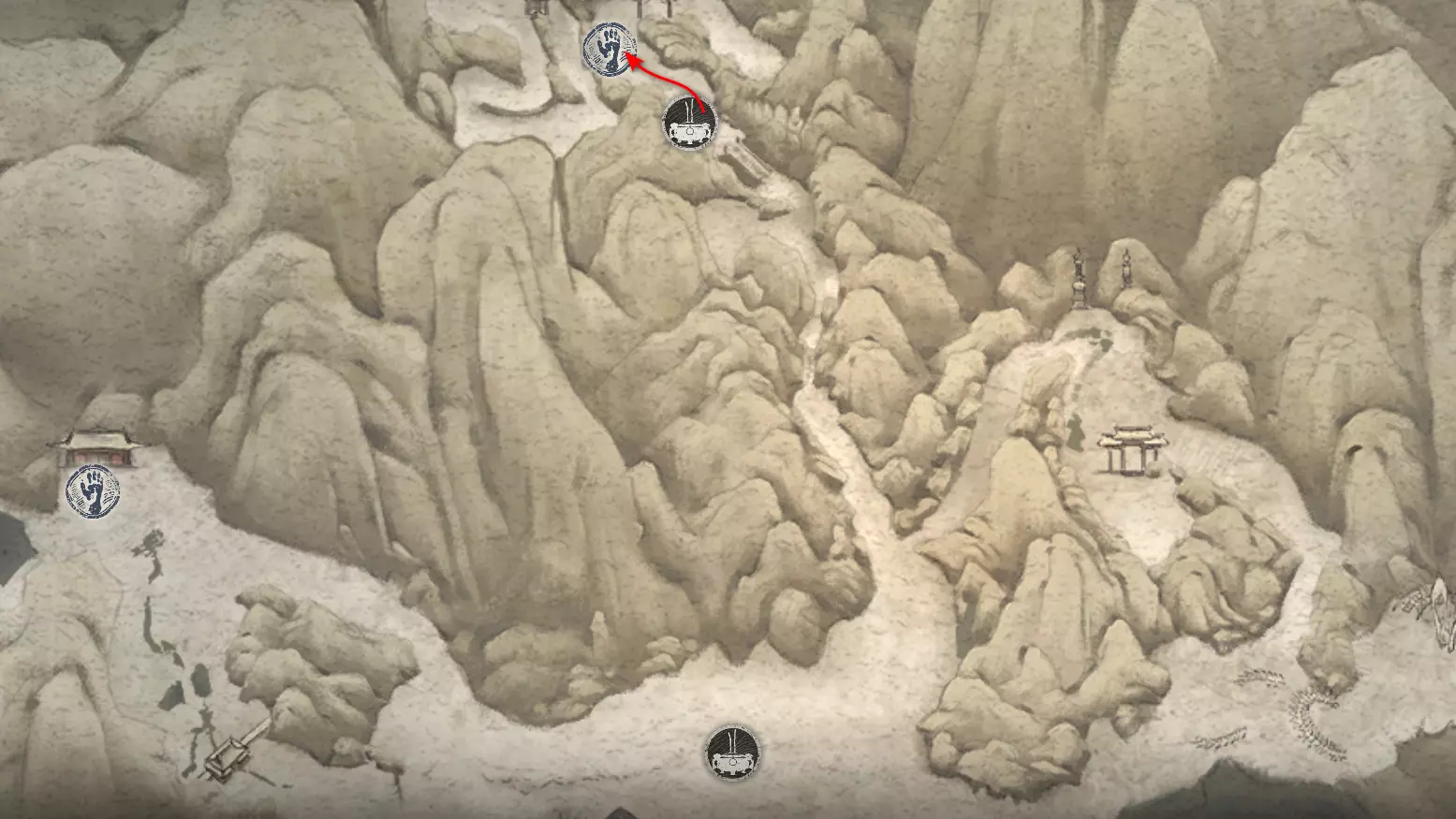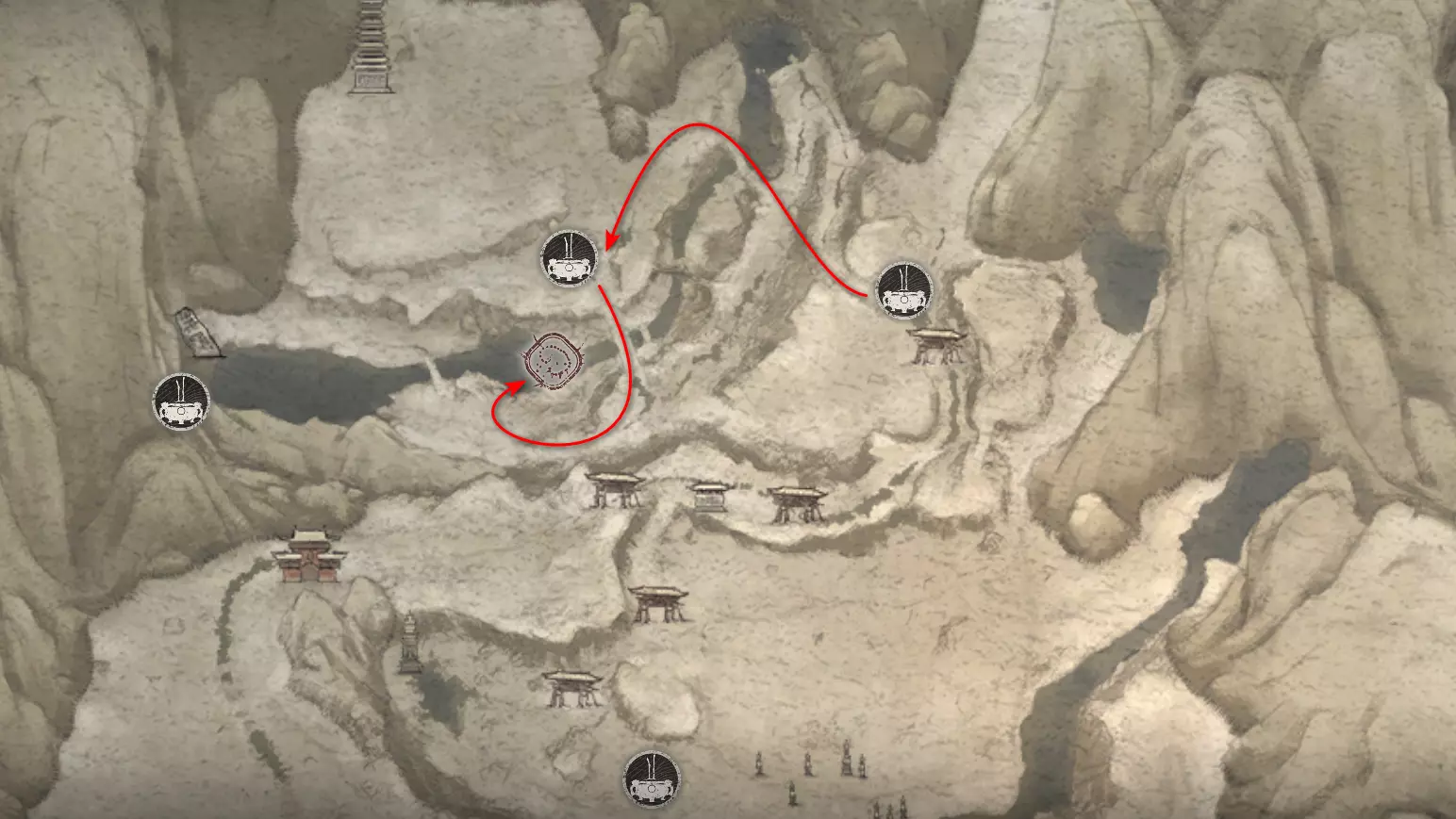 虎之家族 父子——你已与他们全员相遇。 继续前进,开启祭坛——【沙门关边界】。左侧是冥想点[7/24]——【沙门关边界之岩】。召唤 Boss